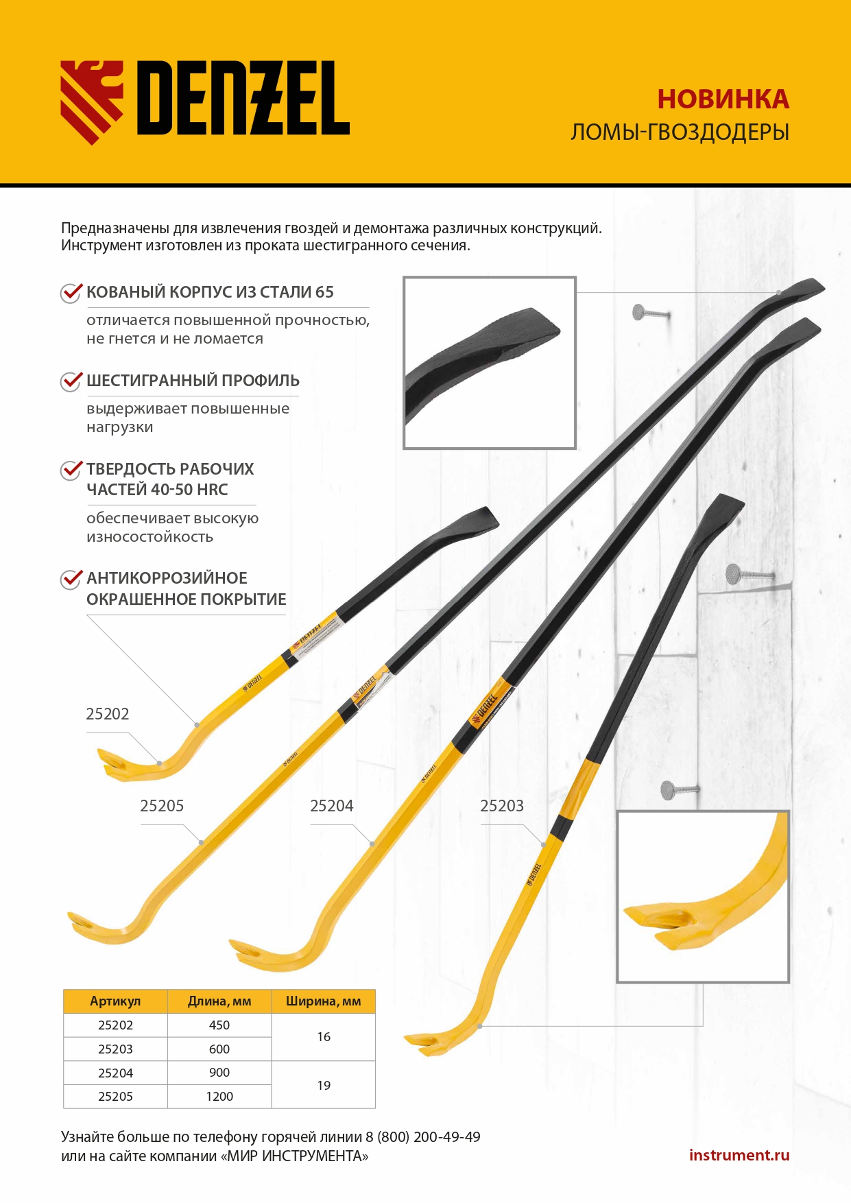 Лом-гвоздодер Denzel 25204 из стали 65, длиной 900 мм, с шестигранным профилем шириной 19 мм и окрашенной поверхностью, предназначен для извлечения гвоздей и разрушения различных конструкций. Изготовлен из проката шестигранного сечения и выдерживает повышенные нагрузки. Используется для проведения строительных и демонтажных работ.