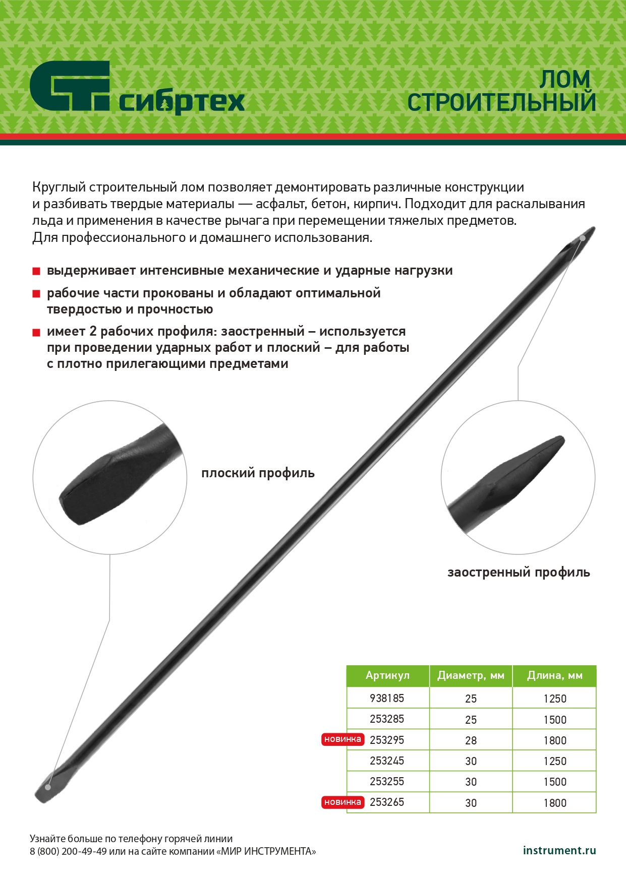 - Два рабочих профиля (конусообразный и плоский) — строительный лом эффективен при проведении ударных работ и работ с плотно прилегающими предметами.