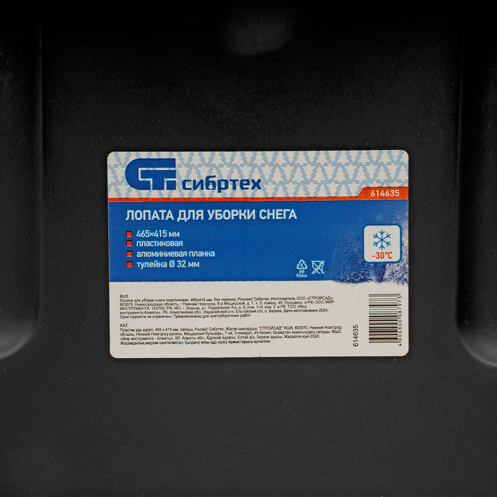 <p>Пластиковая лопата Сибртех 614635 размером 405 х 415 мм, без черенка, предназначена для уборки снега. Поможет расчистить тротуар, садовую дорожку, площадку перед подъездом или гаражом. Глубокий ковш с высокими бортиками захватывает много снега, что ускоряет и упрощает уборку. Черенок приобретается отдельно, рекомендуемые артикулы: 68412, 68409, 68408.</p><h2>Преимущества</h2><ul><li>Прочность — ковш усилен ребрами жесткости, поэтому не сломается при интенсивном использовании.</li><li>Морозостойкость — лопата из ударопрочного полипропилена выдерживает температуру до -50 градусов.</li><li>Эффективность и долговечность — алюминиевая накладка на кромке ковша позволяет справляться со слежавшимся снегом и настом, а также предотвращает преждевременный износ инструмента.</li></ul>