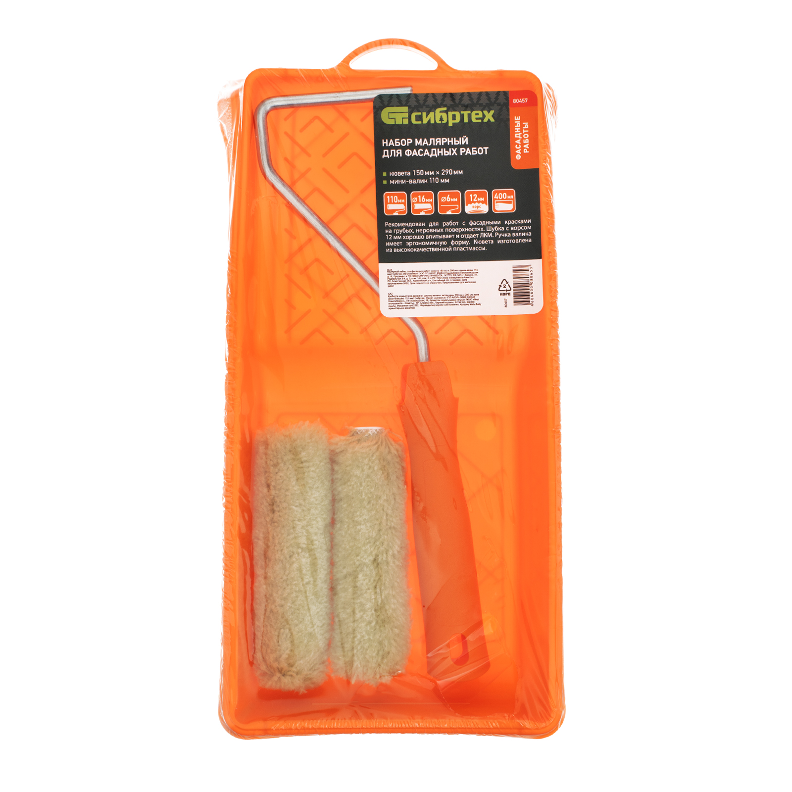 Малярный набор для фасадных работ Сибртех 80457 с двумя сменными мини-валиками шириной 110 мм, кюветой 150 мм х 290 мм и бюгелем в комплекте используется для окрашивания грубых и неровных поверхностей. Шубки из полиакрила и полиэстера устойчивы к разрыву, отлично держат форму, обладают хорошей впитываемостью и отдачей лакокрасочных материалов. Высота ворса составляет 12 мм.