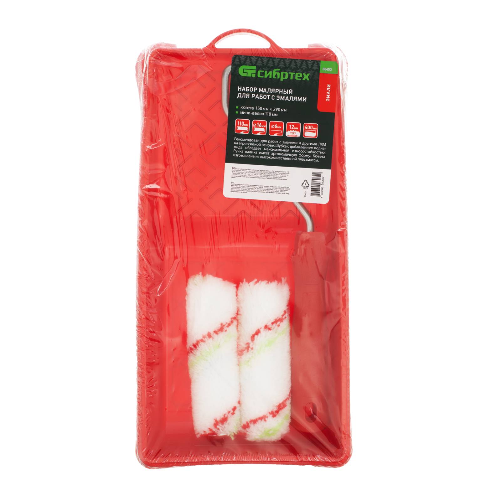 Малярный набор для работ с эмалями Сибртех 80453 состоит из двух сменных мини-валиков шириной 110 мм, бюгеля и кюветы размером 150 мм х 290 мм. Валики подходят для нанесения эмалей и других ЛКМ с агрессивными веществами в составе. Шубки из полиамида и полиакрила хорошо удерживают форму, имеют повышенную износостойкость, высокий коэффициент впитываемости и отдачи краски, а их волокна не остаются на поверхности, что гарантирует высокое качество окрашивания.