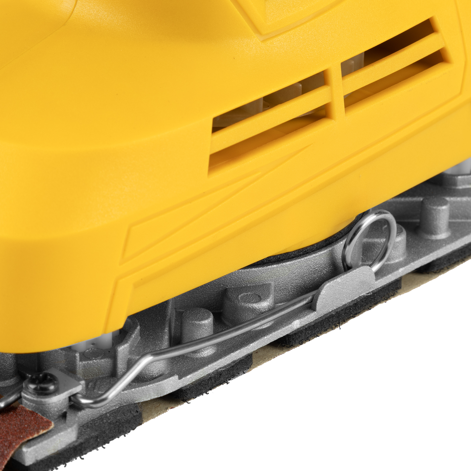 - Универсальное крепление — можно использовать как абразивный материал на липучках (VELCRO), так и обычную шлифовальную бумагу.