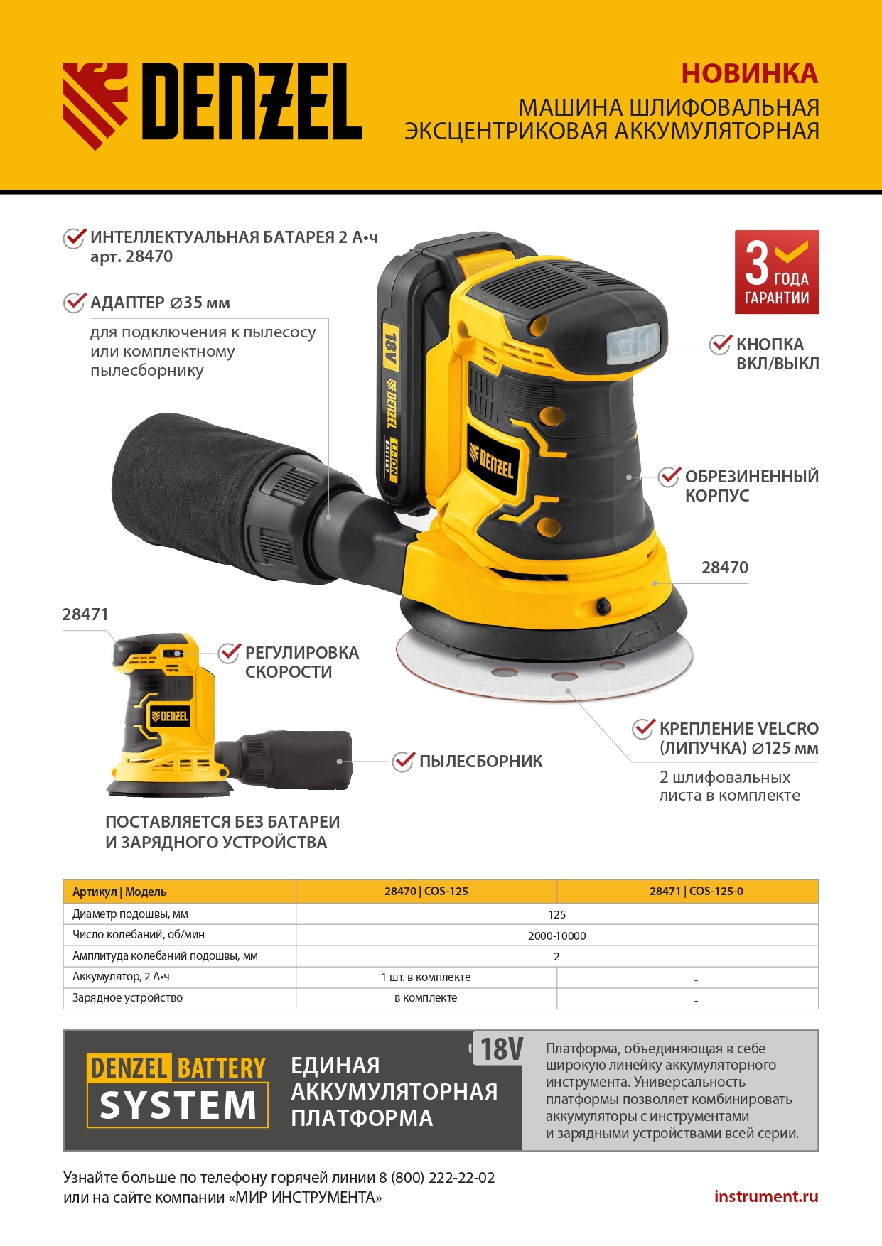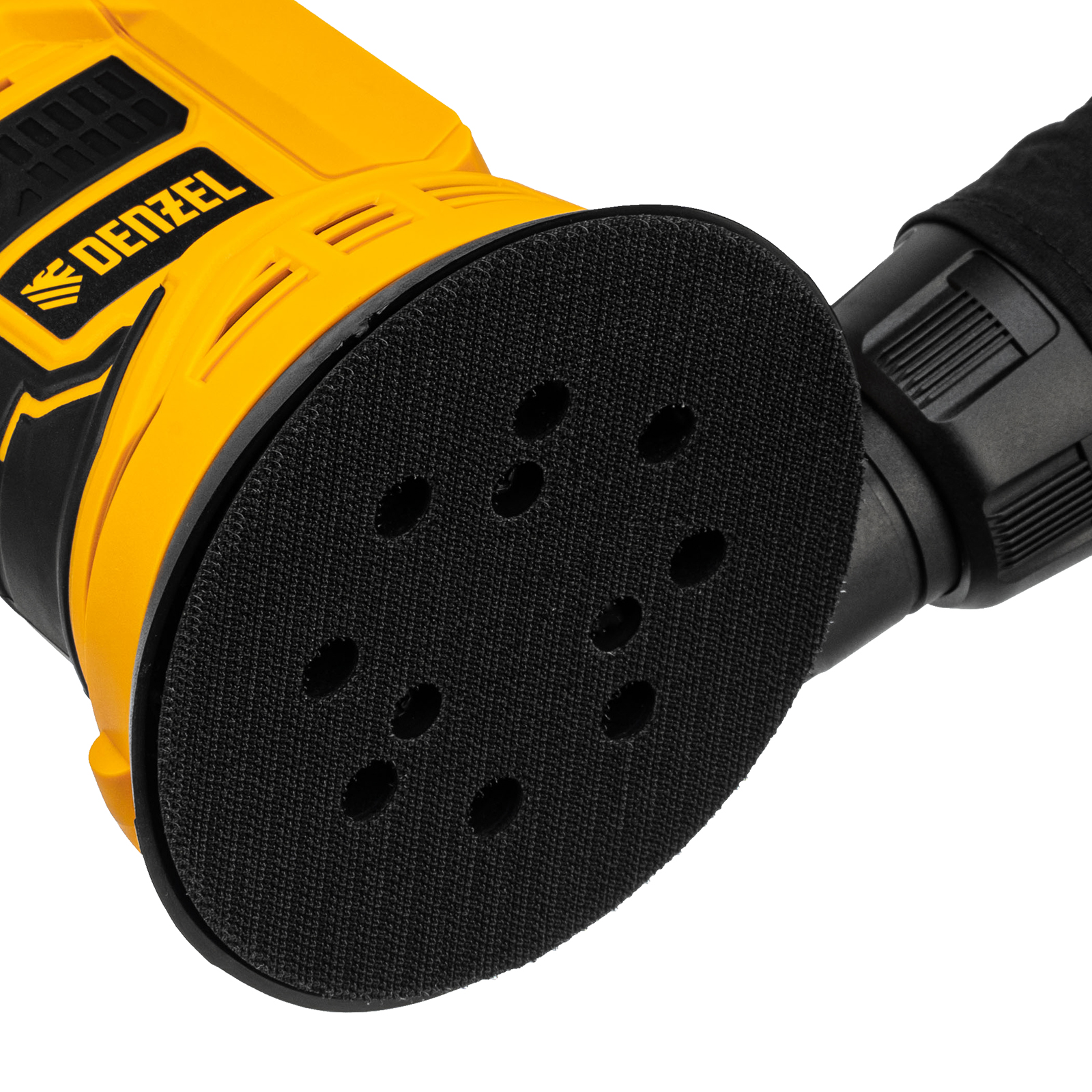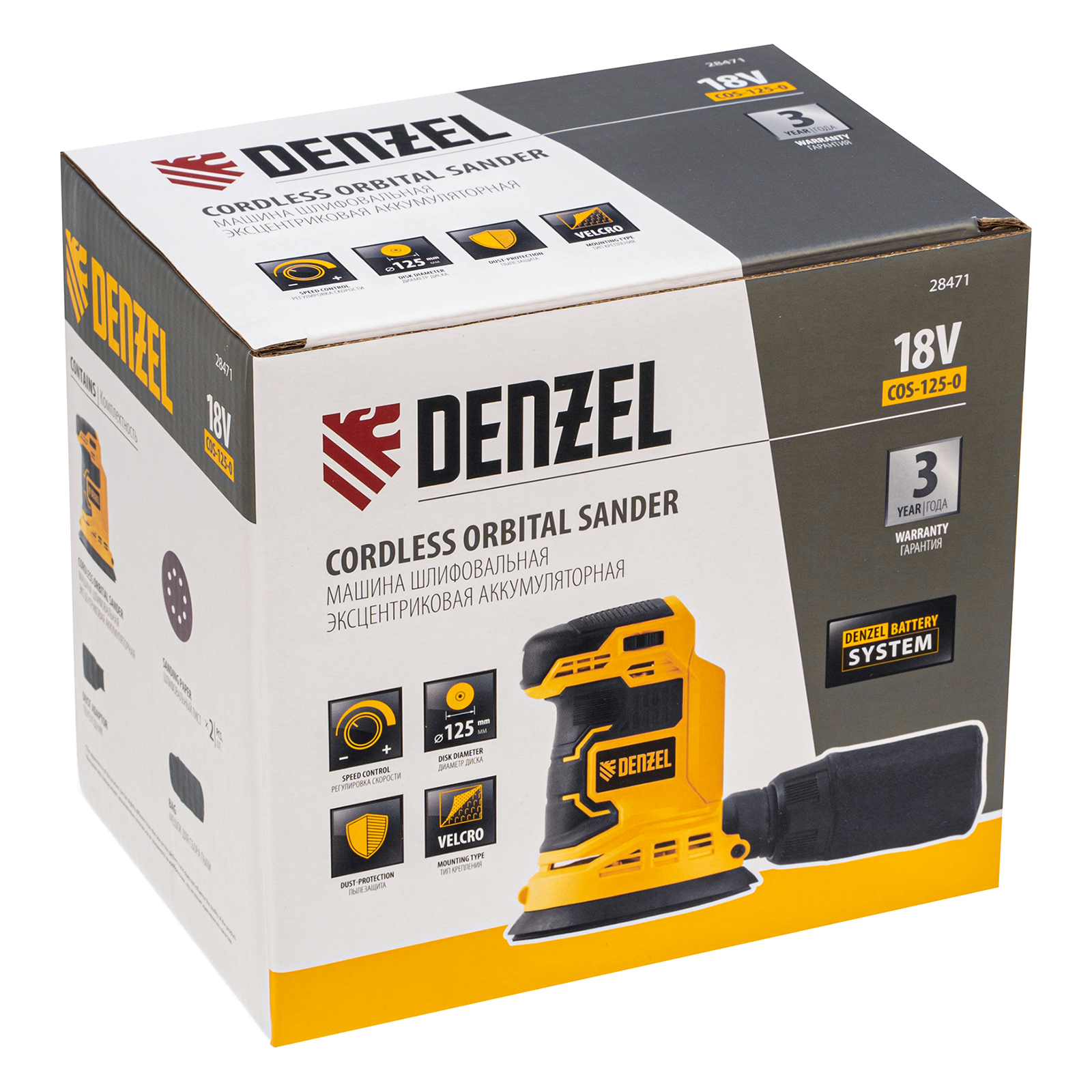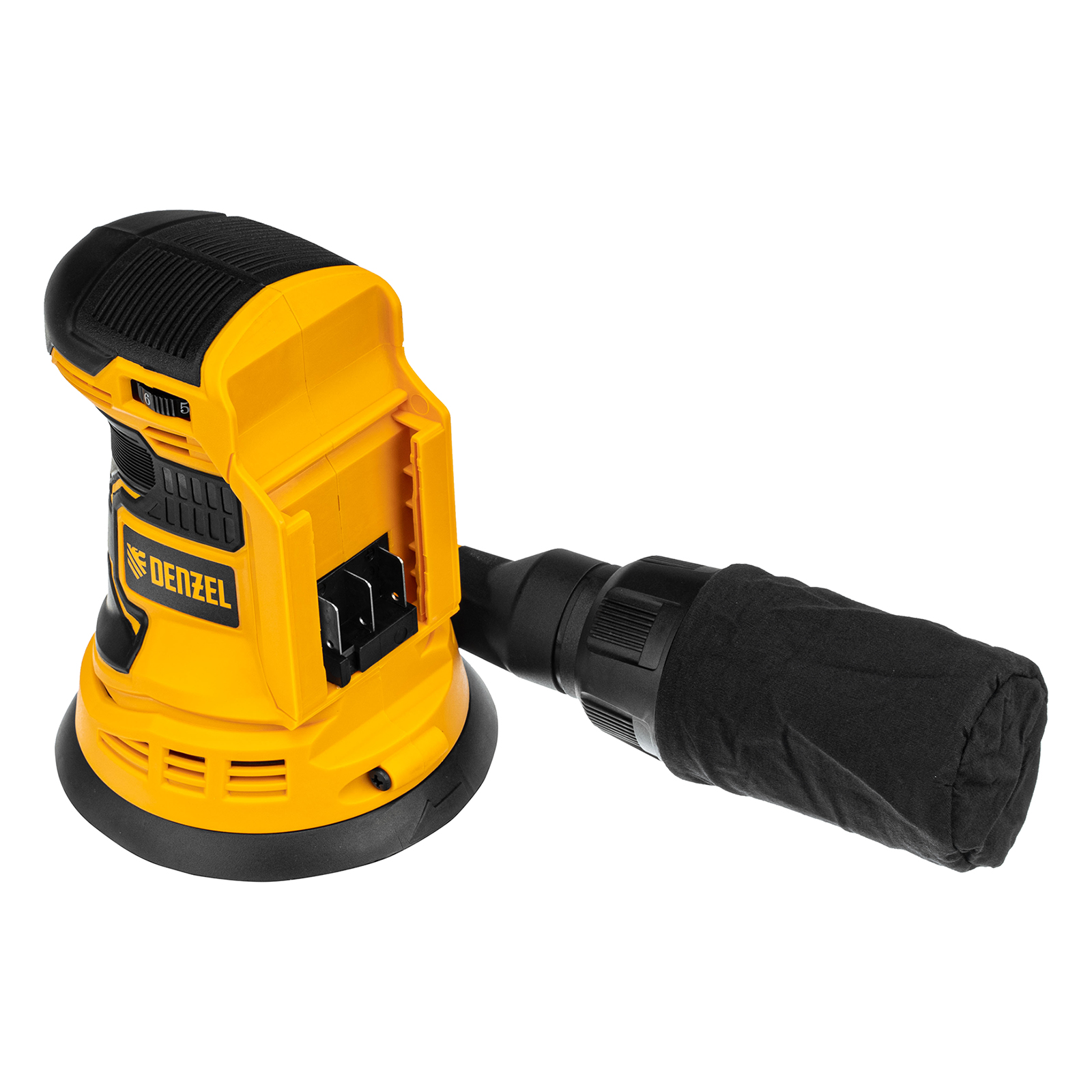 - Универсальность — к шлифовальной машине подходит аккумулятор 4Ач Li-ion, совместимый с любым инструментом 18V Denzel battery system серии IB (в комплект поставки не входит).