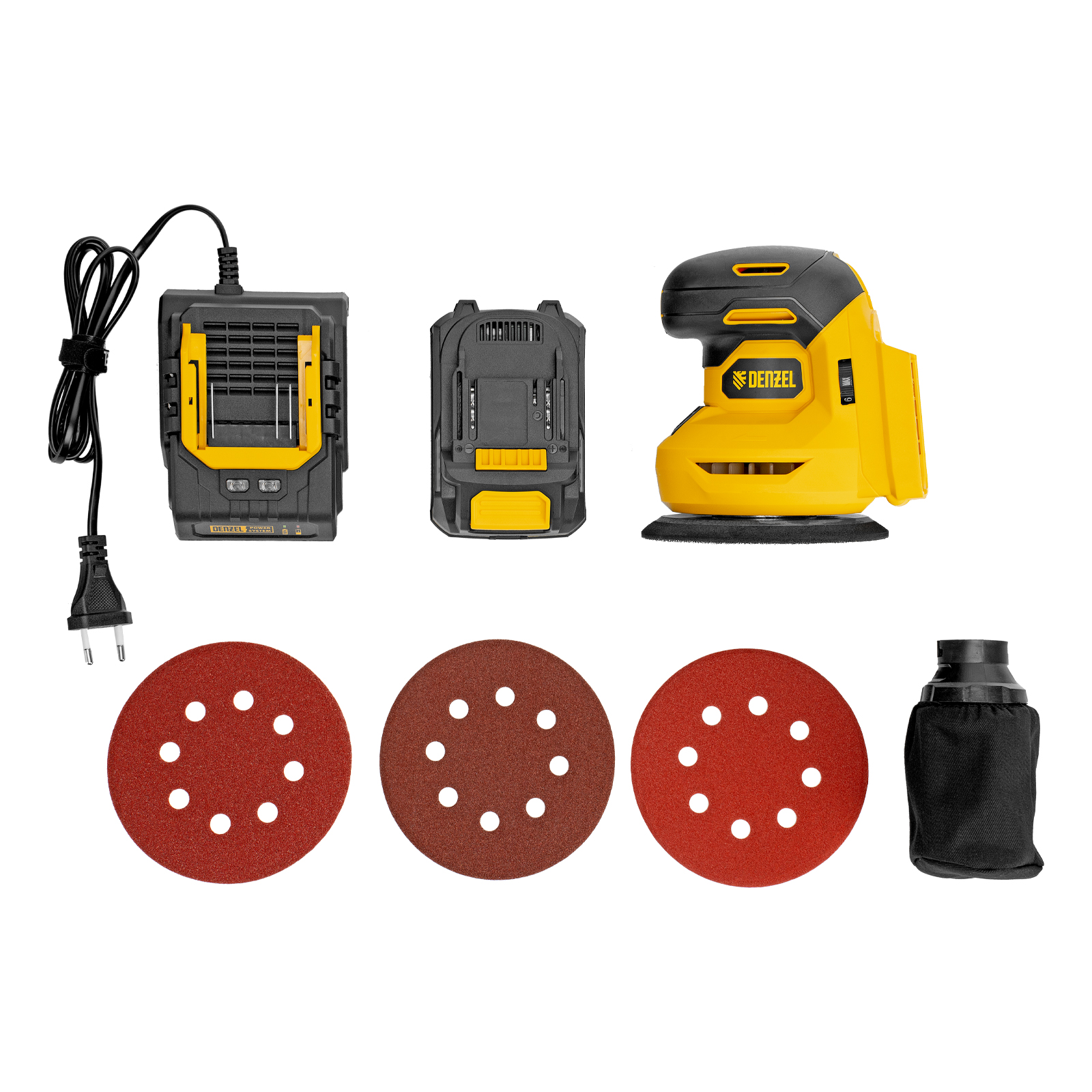 - Готовность к эксплуатации — в комплект поставки входит аккумуляторная батарея, зарядное устройство, пылесборный мешок и набор шлифовальной бумаги разной зернистости.
