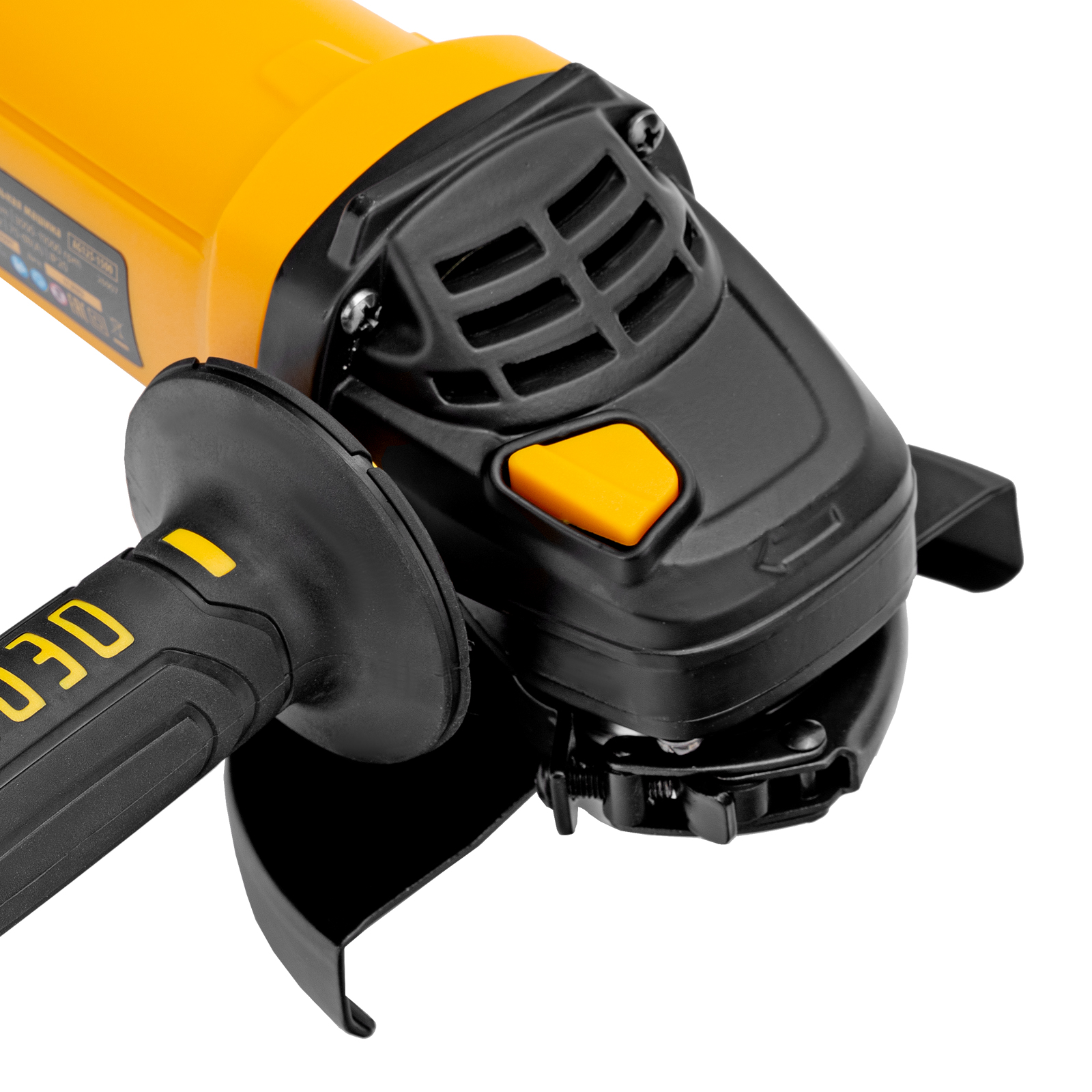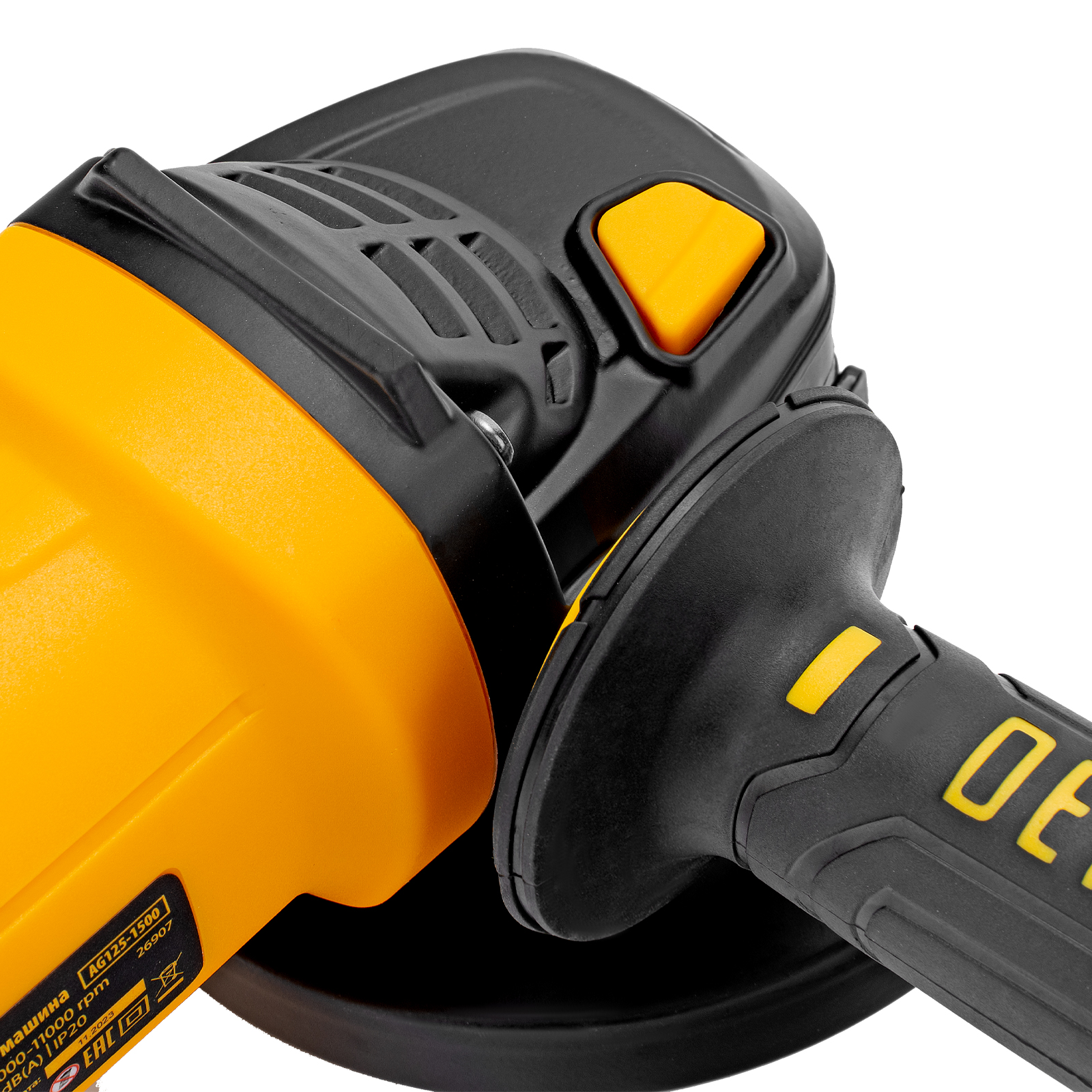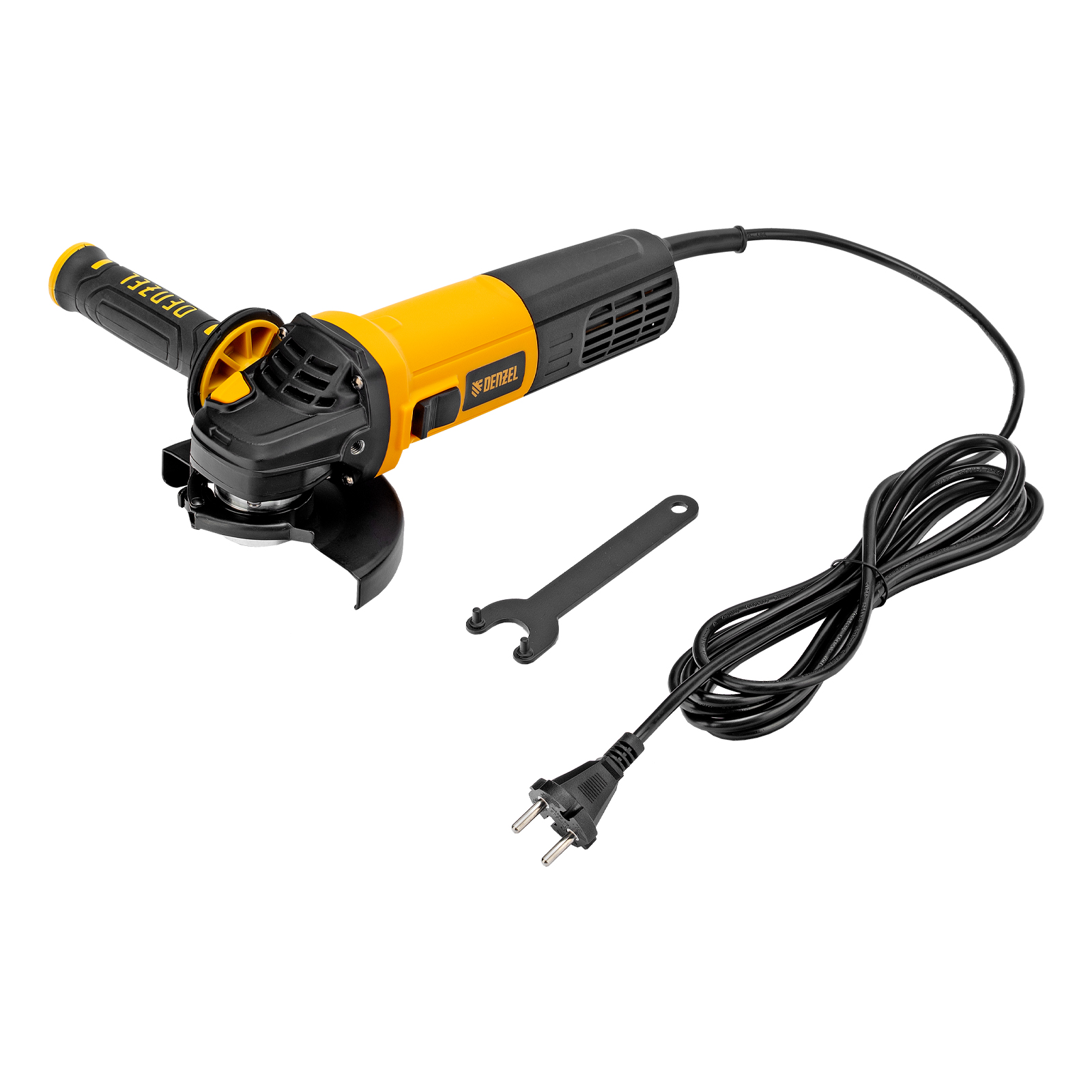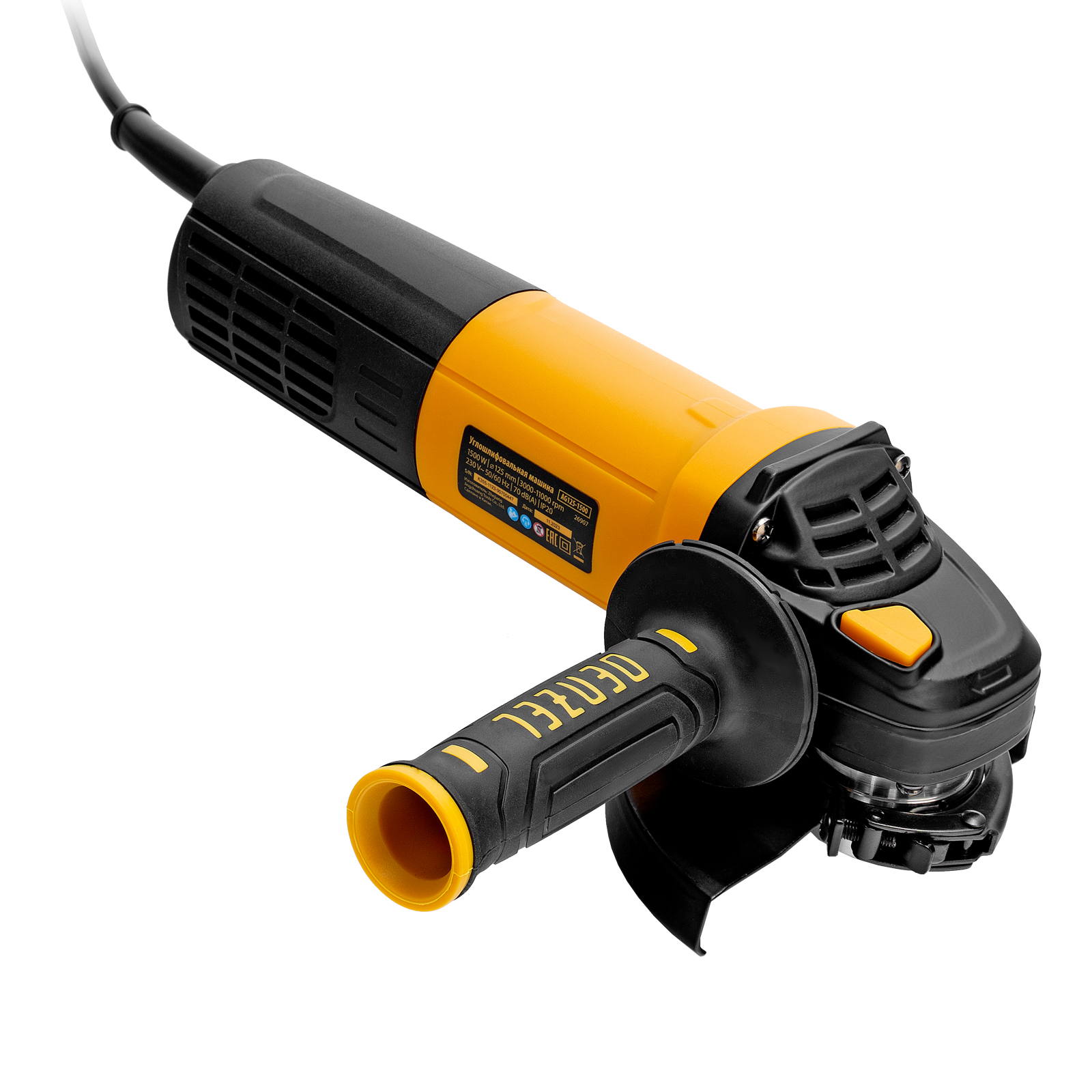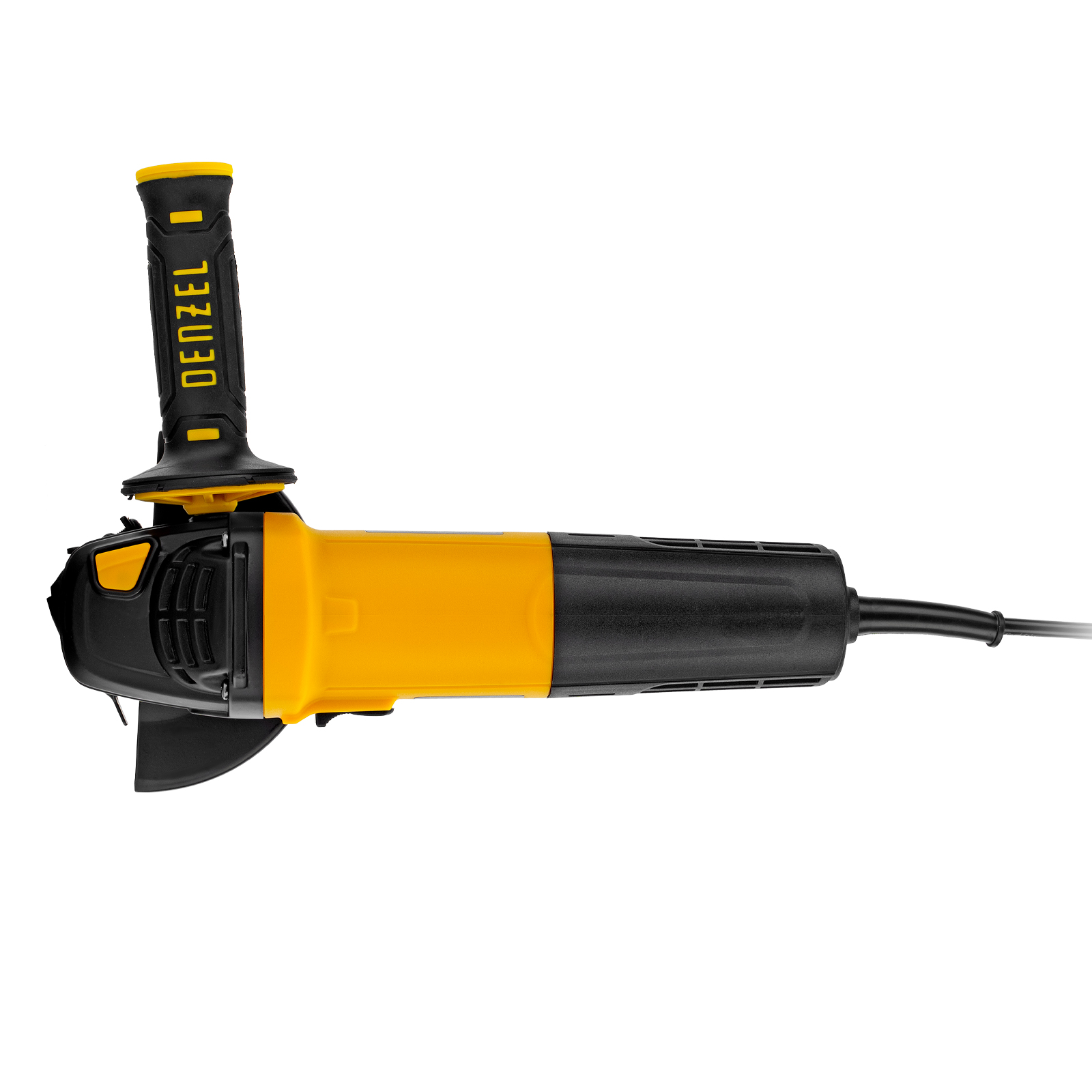 Угловая шлифовальная машина Denzel AG125-1500 26907 мощностью 1500 Вт совместима с оснасткой диаметром 125 мм, система электронной регулировки позволяет устанавливать оптимальную частоту вращения шпинделя в диапазоне 3000-11000 об/мин. Инструмент используется для резки и шлифовки различных материалов, а также при выполнении зачистных работ.