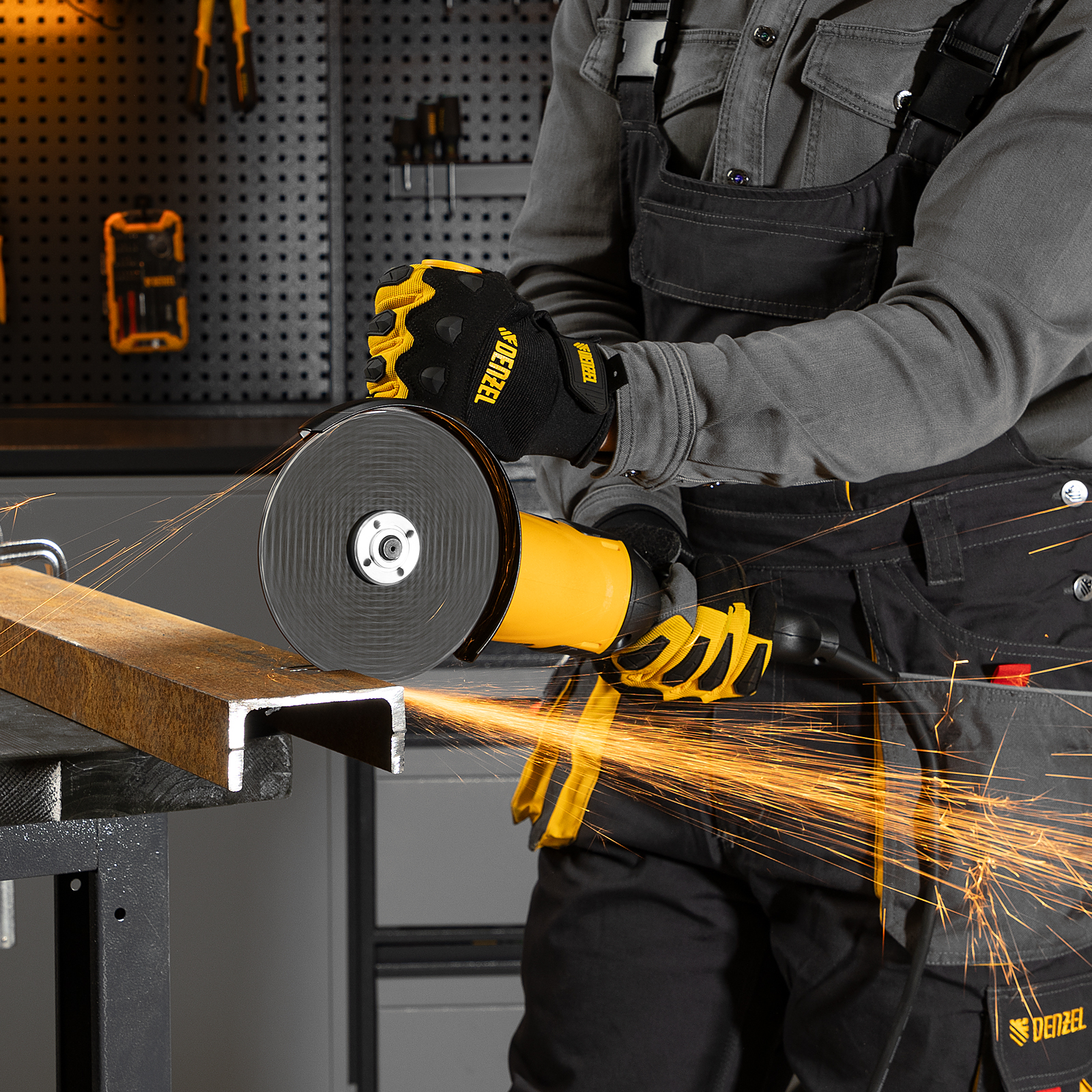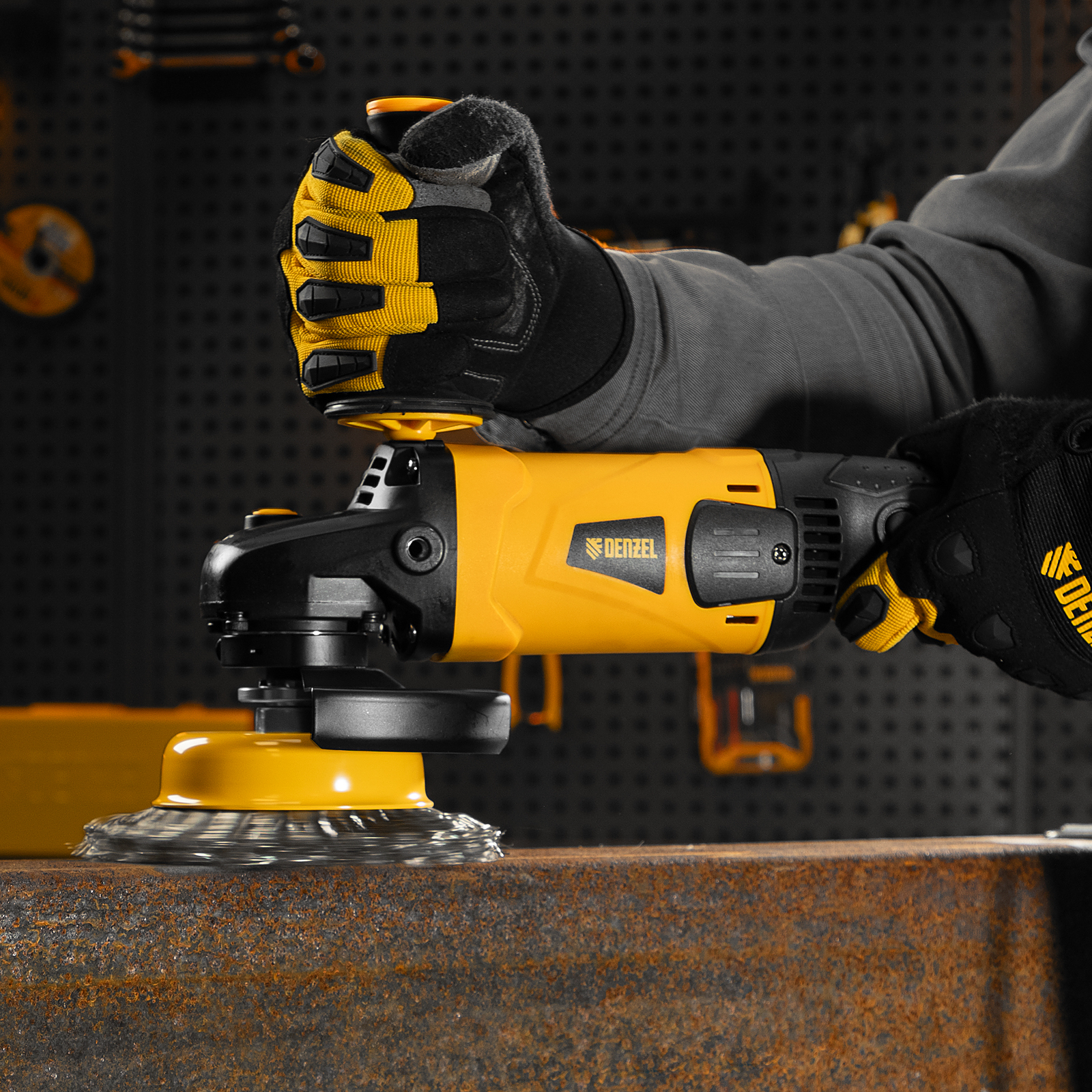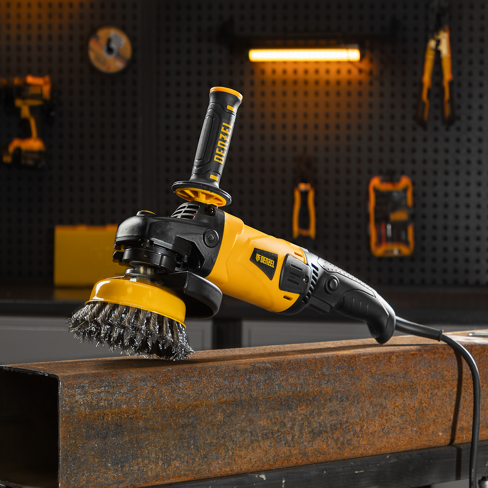 Угловая шлифовальная машина Denzel AG150-1500 26910 мощностью 1500 Вт совместима с насадками максимальным диаметром 150 мм, поддерживает частоту вращения шпинделя 8500 об/мин, благодаря чему эффективно справляется с обработкой и зачисткой поверхностей, а также резкой, шлифовкой металла толщиной до 50 мм и камня. Пригодится дома, в гараже и на даче.