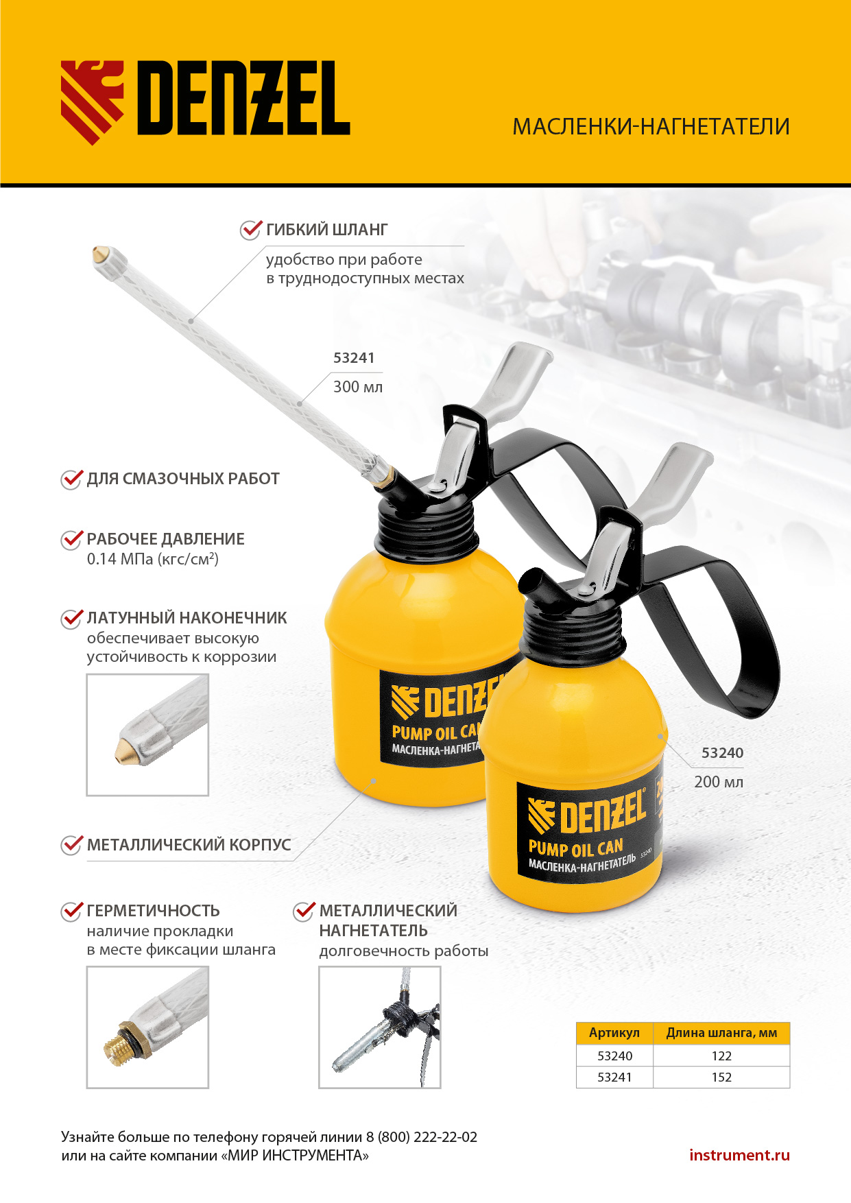 Масленка-нагнетатель Denzel 53240 вместительностью 0,2 л, с металлическим корпусом и гибким наконечником, предназначена для подачи смазочных материалов к движущимся частям механизмов.