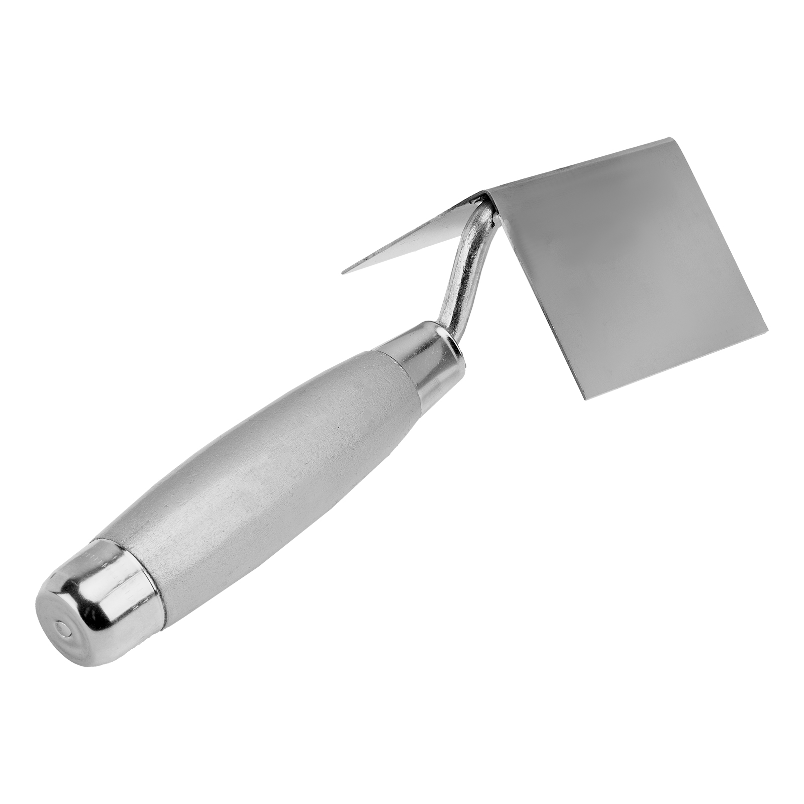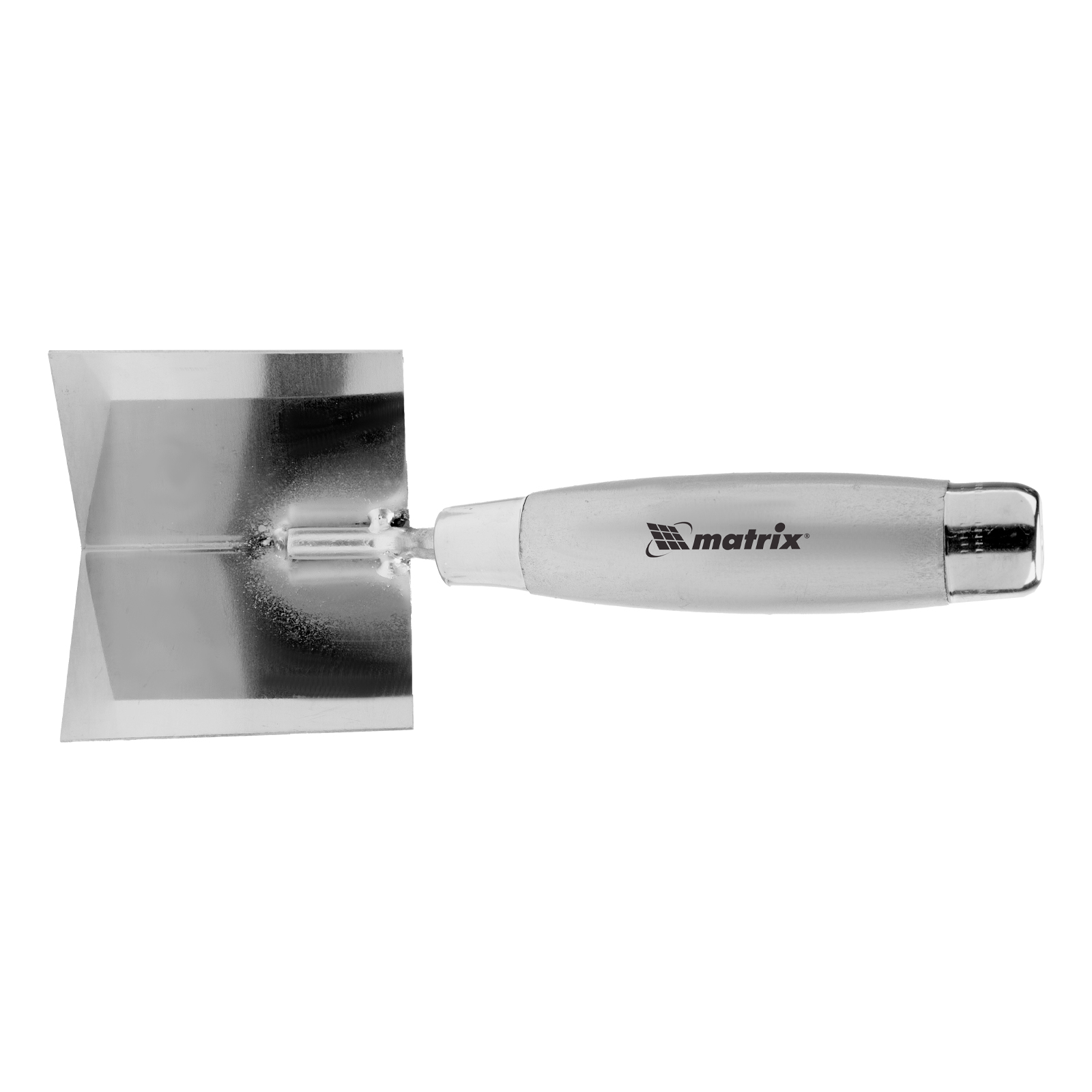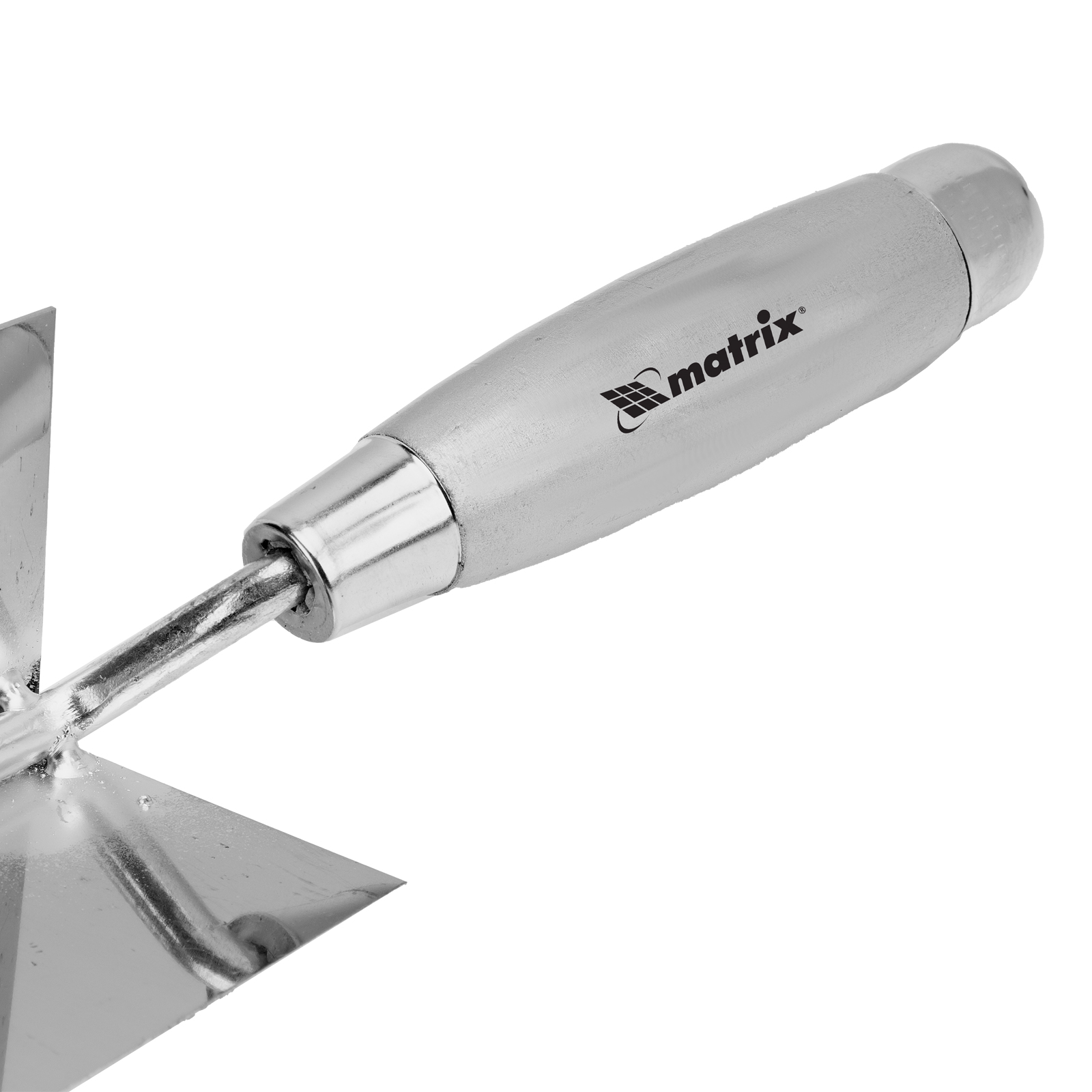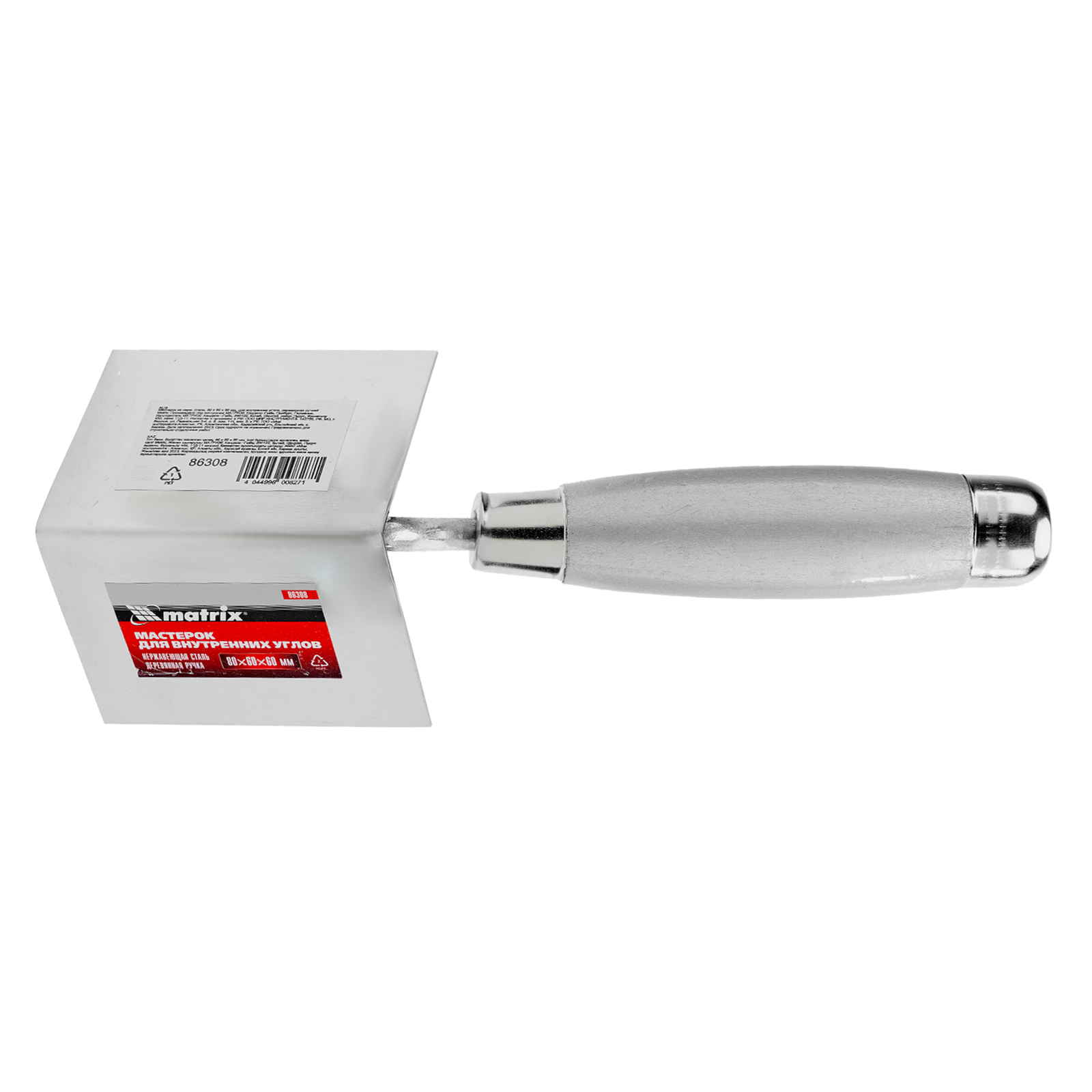 Мастерок Matrix 86308 из нержавеющей стали, размером 80 х 60 х 60 мм, с деревянной ручкой, имеет рабочее полотно в форме «книжки» и предназначен для формирования внутренних углов. С его помощью раствор наносится равномерно, поэтому углы получаются ровными и гладкими.