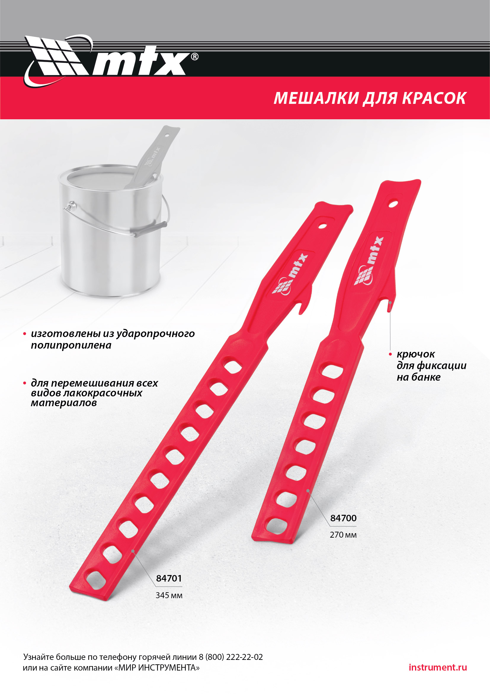 Пластиковая мешалка для красок MTX 84701 длиной 345 мм — ручной инструмент, предназначенный для перемешивания лакокрасочных материалов (ЛКМ). Подходит для всех видов красок, незаменима при проведении ремонтных и отделочных работ.