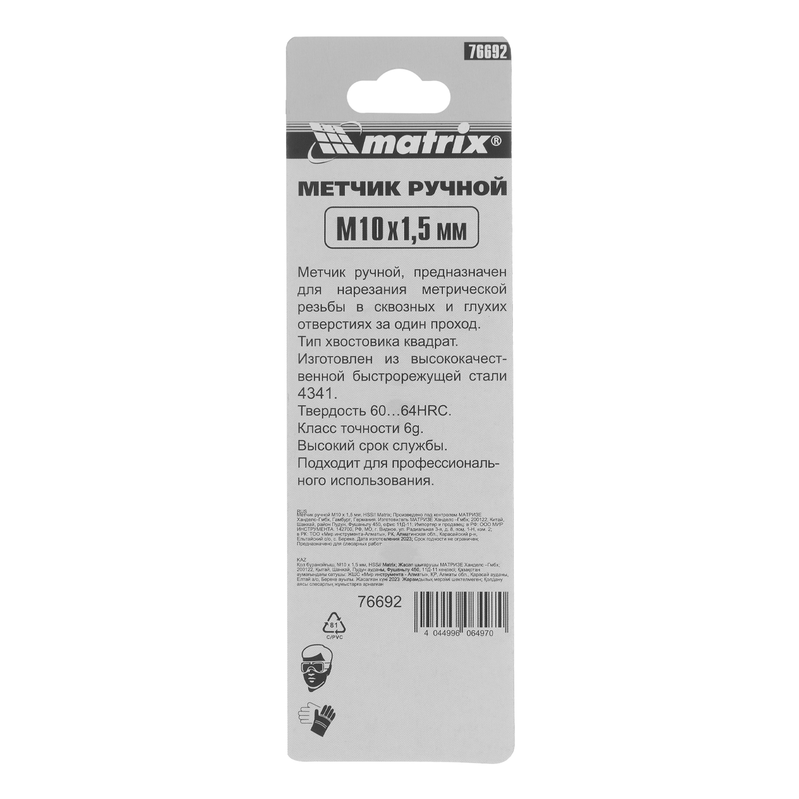 Ручной метчик Matrix 76692, HSS, — резьбонарезной инструмент, который используется для создания резьбы диаметром М10 и шагом 1,5 мм. Оптимален для работы с деталями из твердой стали прочностью до 900 Н/мм². Нарезает резьбу за один проход. Метчик устанавливается на метчикодержатель с патроном под хвостовик 5,4 мм. Будет полезен в слесарной мастерской, а также дома или в гараже.