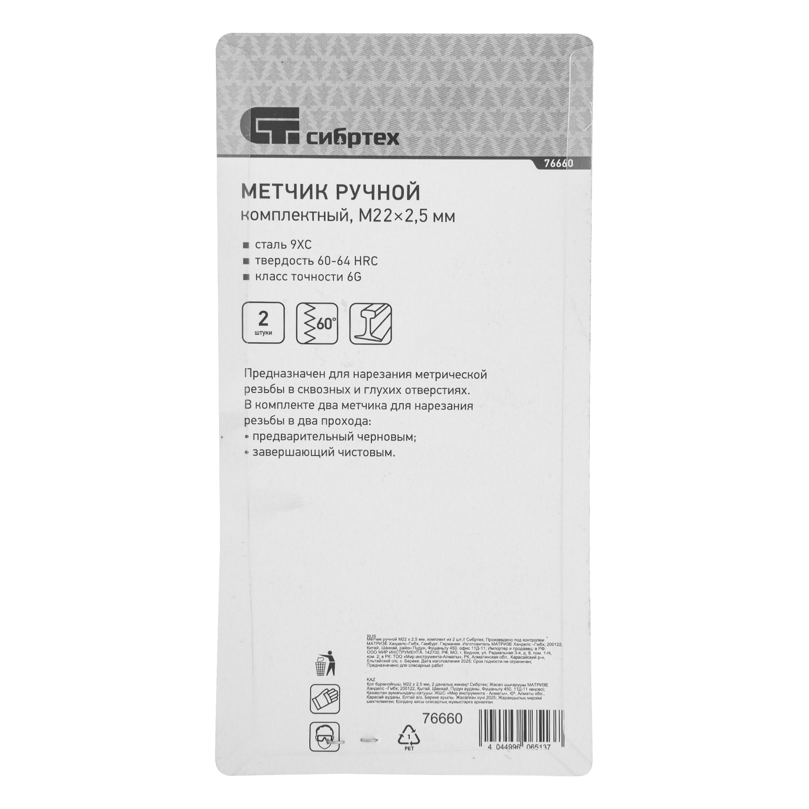 Ручной метчик Сибртех 76660 предназначен для нарезания внутренней резьбы диаметром М22 и шагом 2,5 мм. Используется для работы со сквозными и глухими отверстиями. Устанавливается на метчикодержатель под посадочный квадрат 14,5 мм. Метчик пригодится для проведения слесарных работ на строительной площадке и в гараже.