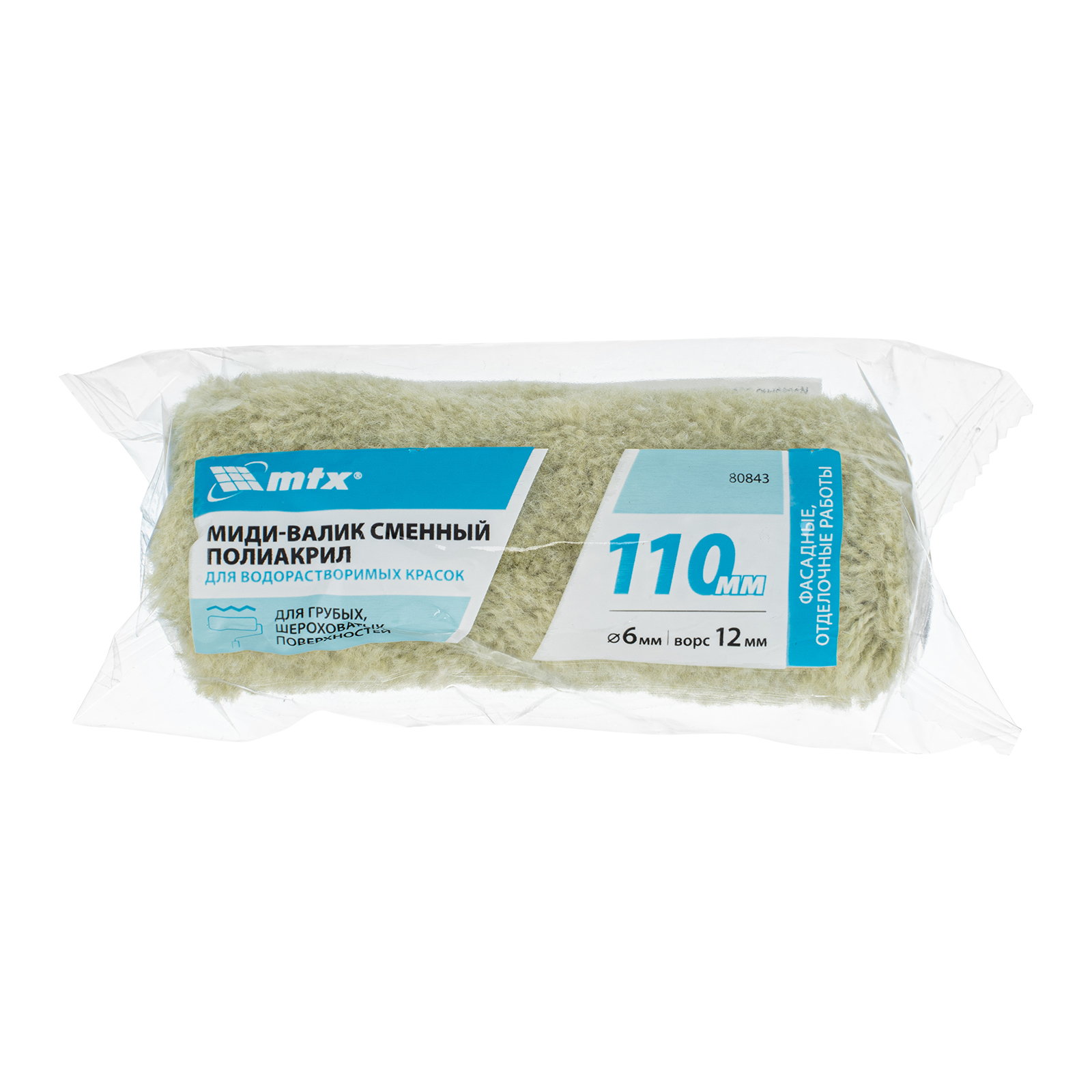 Сменный синтетический миди-валик для грубых поверхностей MTX «Полиакрил» 80843 с ворсом 12 мм, шириной 110 мм, диаметром ролика 30 мм, подходит для бюгелей диаметром 6 мм. Шубка с ворсом из полиакрила качественно прокрашивает неровные поверхности. Валиком удобно работать на небольших участках и в труднодоступных местах.