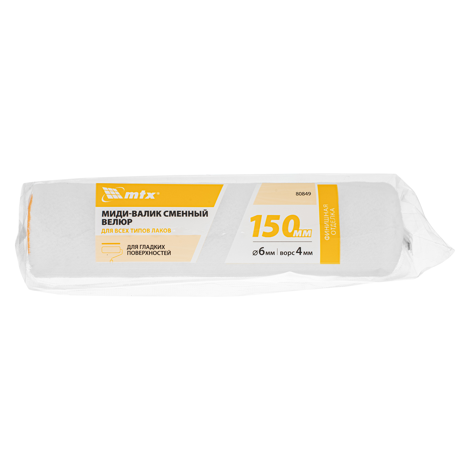 Сменный синтетический миди-валик для гладких поверхностей MTX «Велюр» 80849 шириной 150 мм и диаметром 30 мм, с шубкой из велюра, ворсом 4 мм, под ручку 6 мм, используется для финишной отделки на небольших участках. Благодаря короткому ворсу лакокрасочный состав равномерно наносится тонким слоем, поэтому валик оптимален для работы с лаками.