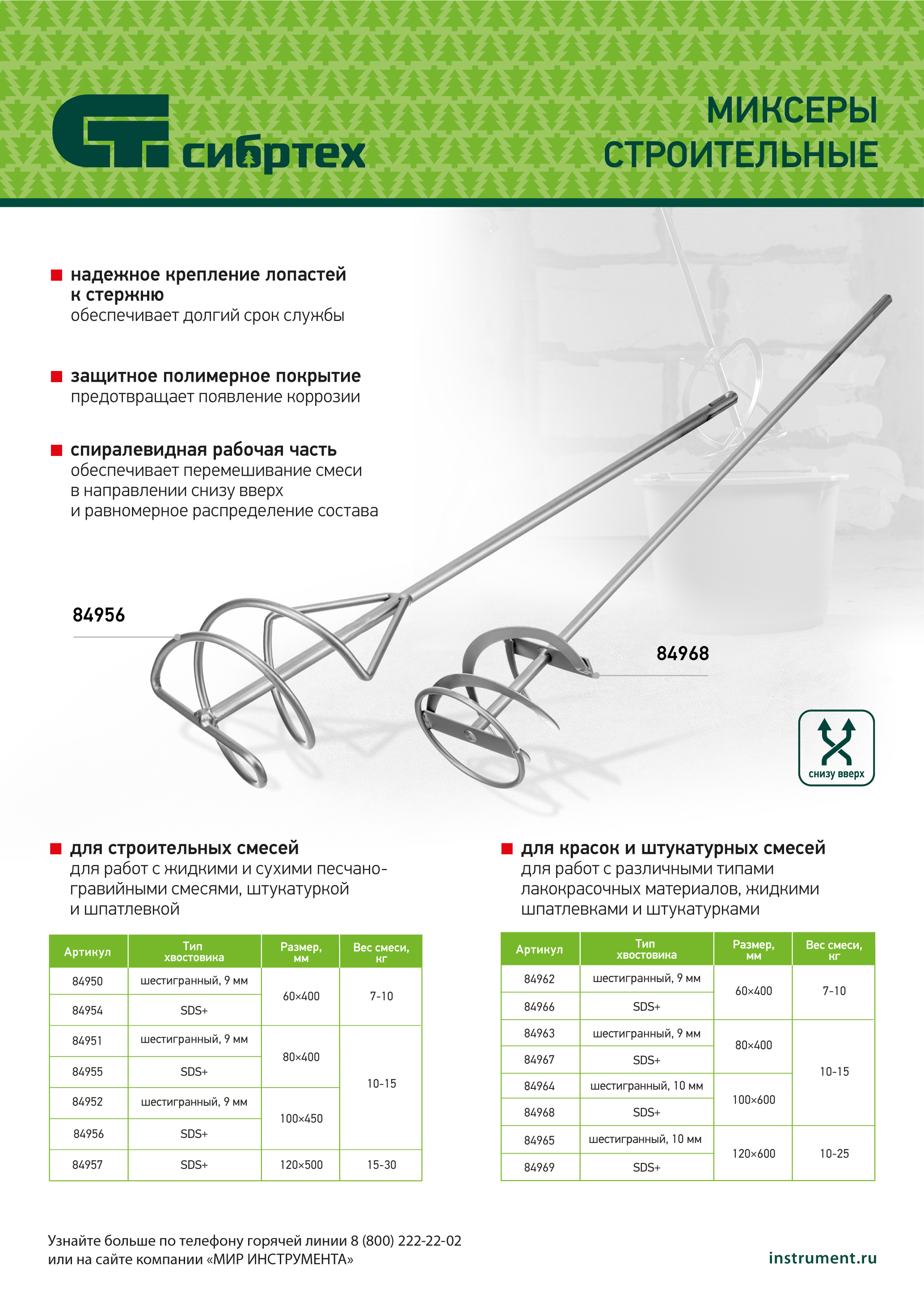 Миксер для красок и штукатурных смесей Сибртех 84967 диаметром 80 мм и длиной 400 мм, с хвостовиком SDS Plus, — оснастка электроинструмента, которая используется при проведении строительных и отделочных работ. Предназначен для размешивания любых типов лакокрасочных материалов, жидких шпатлевок и штукатурки. Совместим с перфораторами с патроном SDS Plus.