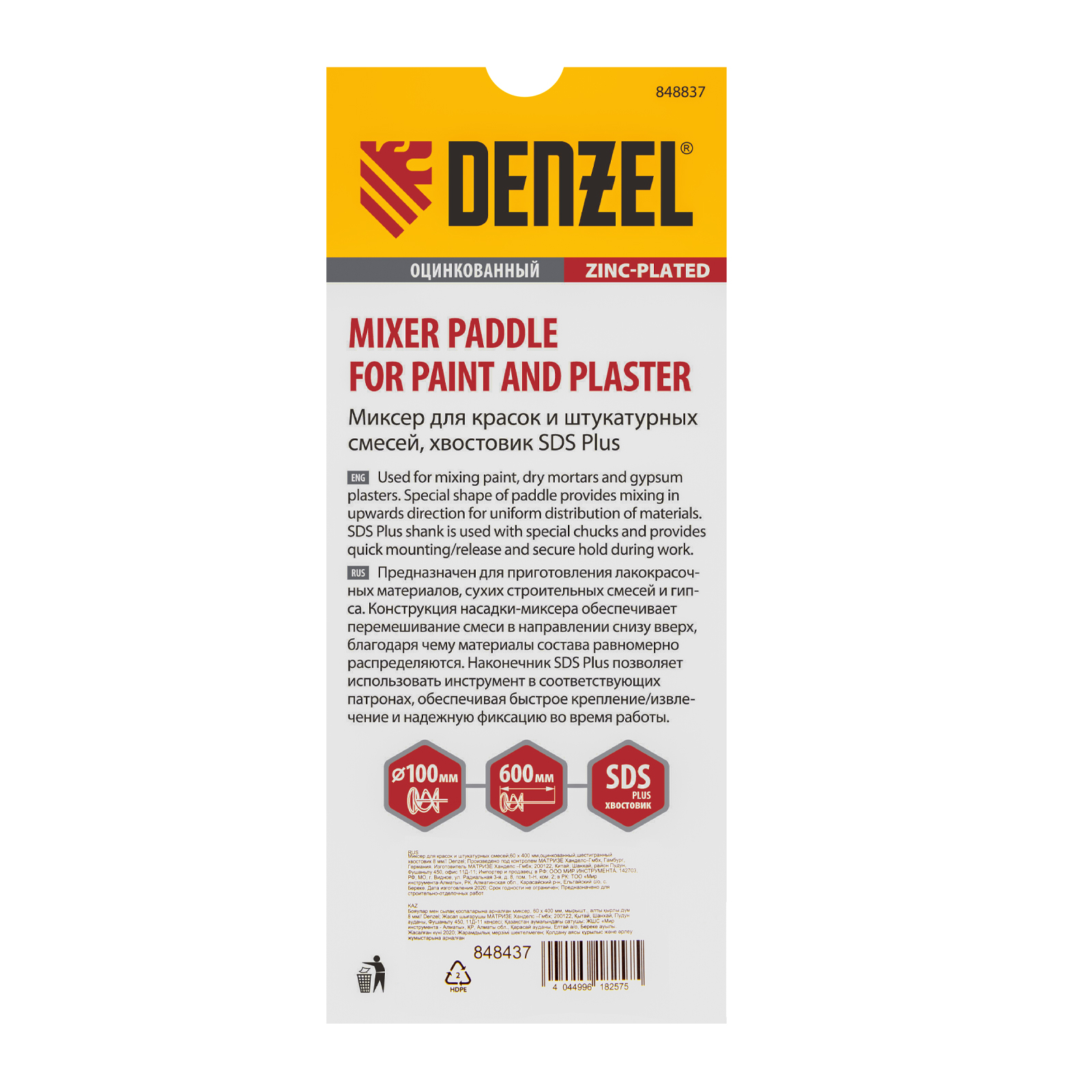 Оцинкованный миксер для красок и штукатурных смесей Denzel 848437 длиной 400 мм, с шестигранным хвостовиком 8 мм, имеет венчик диаметром 60 мм и используется для приготовления строительных растворов. Насадка перемешивает состав снизу вверх, что позволяет добиться полной однородности готовой смеси. Защитное кольцо предотвращает повреждение емкости, в которой готовится раствор. Миксер пригодится во время строительства и ремонта.