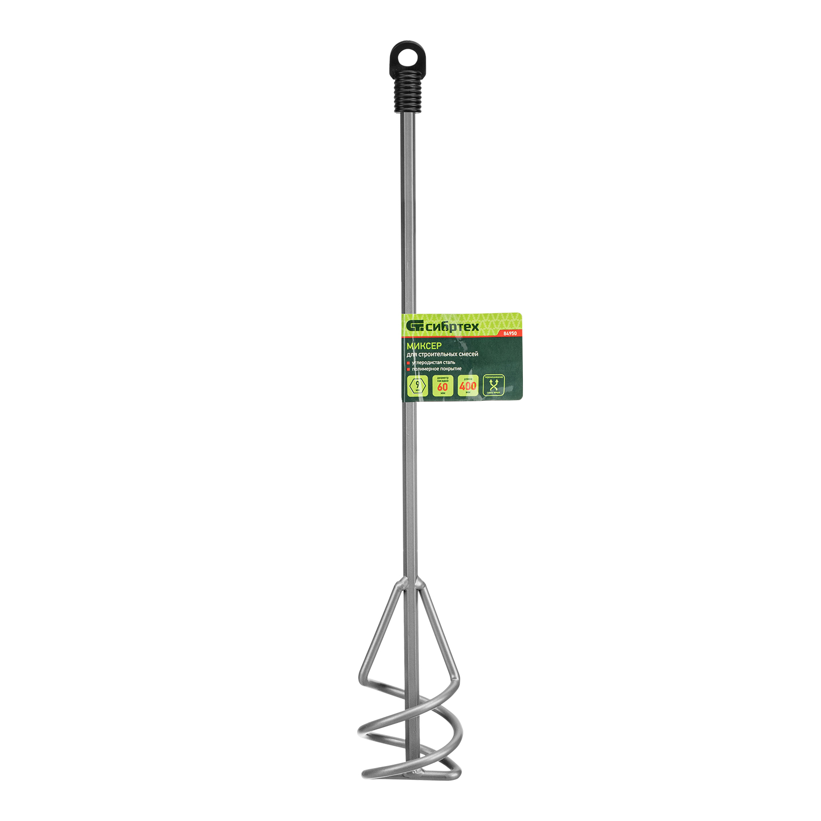 Миксер Сибртех 84950 длиной 400 мм, с рабочей частью диаметром 60 мм и шестигранным хвостовиком 9 мм, устанавливается на электроинструмент и используется для приготовления песчано-гравийных смесей, а также штукатурок, шпатлевок и других строительных растворов. Спиралевидная рабочая часть перемешивает состав снизу вверх, позволяя получить однородную массу. Насадка используется в быту во время ремонта и на строительной площадке.