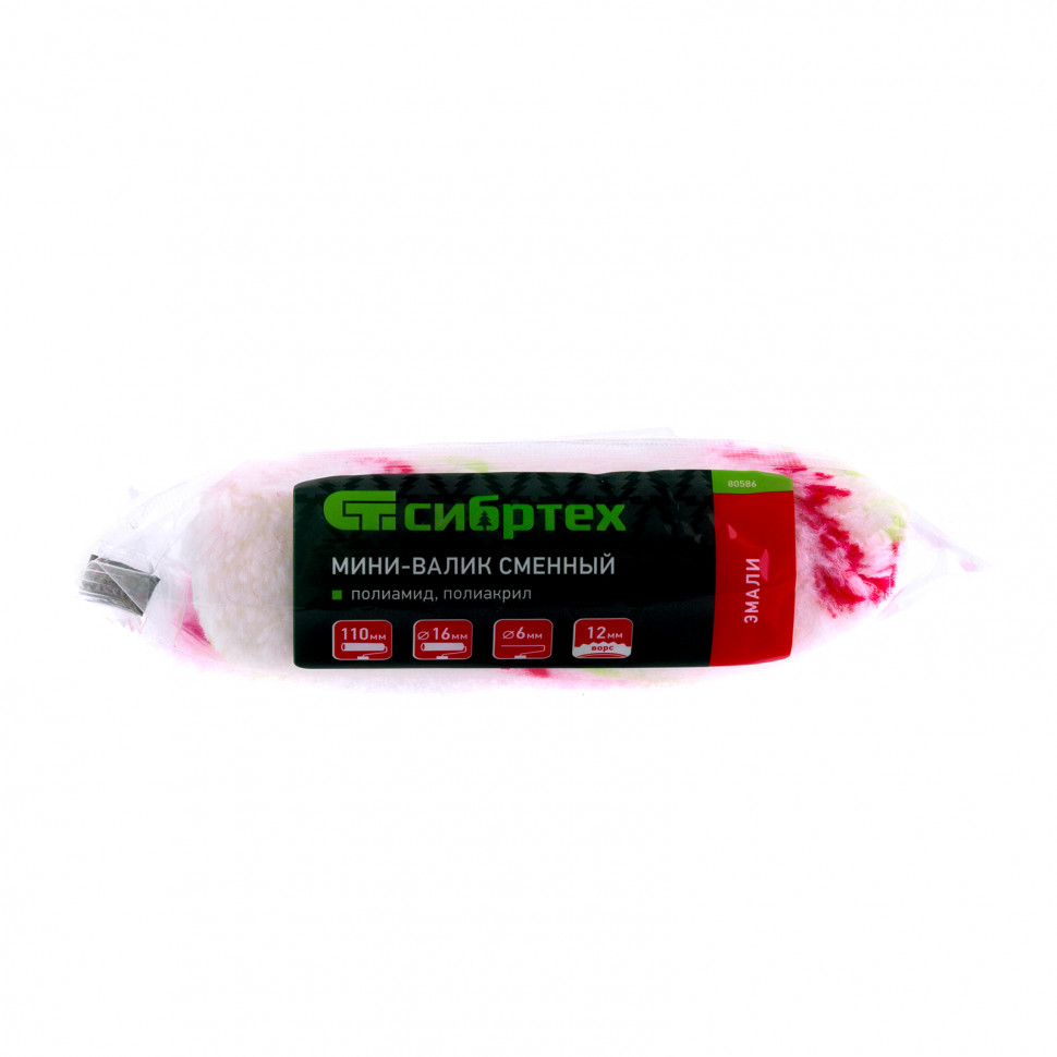 Сменный мини-валик Сибртех «Эмали» 80586 с ворсом 12 мм из полиамида и полиакрила, размером ролика 110 х 16 мм, под ручку 6 мм, подходит для проведения малярных работ с любыми типами лакокрасочных материалов, даже содержащих агрессивные вещества. За счет ворса средней длины подходит для поверхностей любого типа. Рекомендован для работ с эмалями.