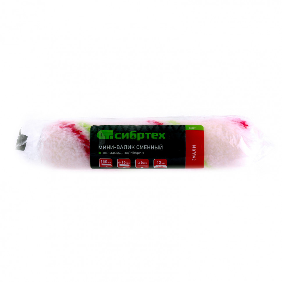 Сменный мини-валик Сибртех «Эмали» 80587 с ворсом 12 мм из полиамида и полиакрила, размером ролика 150 х 16 мм, под ручку 6 мм, подходит для проведения малярных работ с любыми типами лакокрасочных материалов, даже содержащих агрессивные вещества. За счет ворса средней длины подходит для поверхностей любого типа. Рекомендован для работ с эмалями.