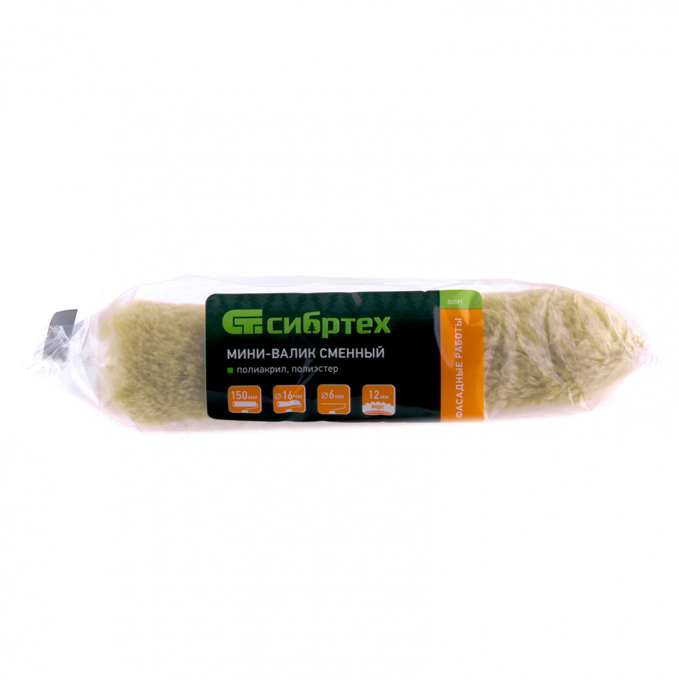 Сменный мини-валик Сибртех «Фасадные работы» 80591 с ворсом 12 мм из полиакрила и полиэстера, роликом 150 х 16 мм, предназначен для установки на ручку диаметром 6 мм. Его используют при проведении фасадных работ для нанесения ЛКМ на грубые участки с неровностями.