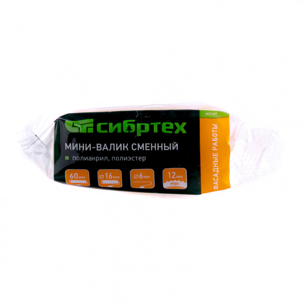 Сменный мини-валик Сибртех «Фасадные работы» 80589 с ворсом 12 мм из полиакрила и полиэстера, роликом 60 х 16 мм, предназначен для установки на ручку диаметром 6 мм. Его используют при проведении фасадных работ для нанесения ЛКМ на грубые участки с неровностями.