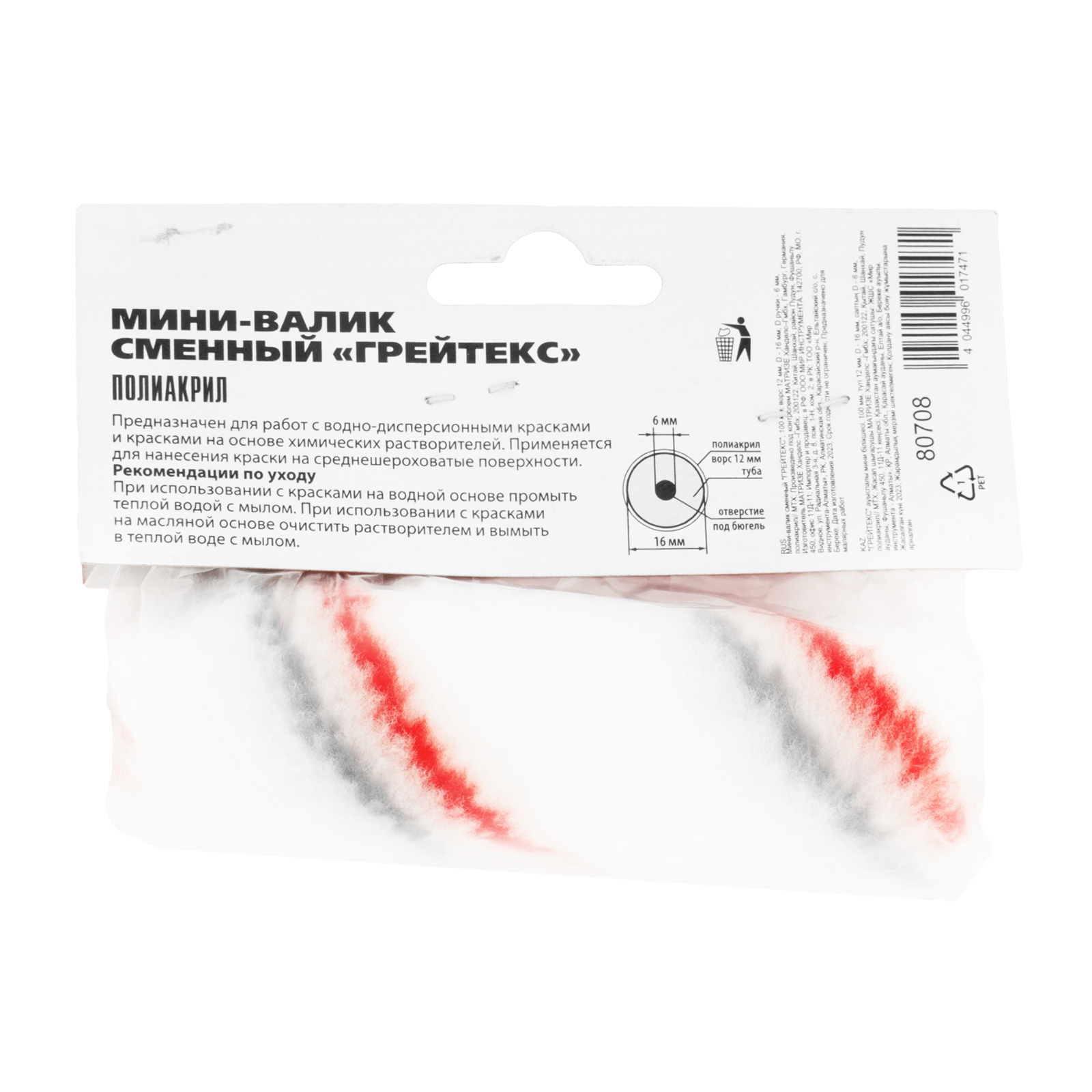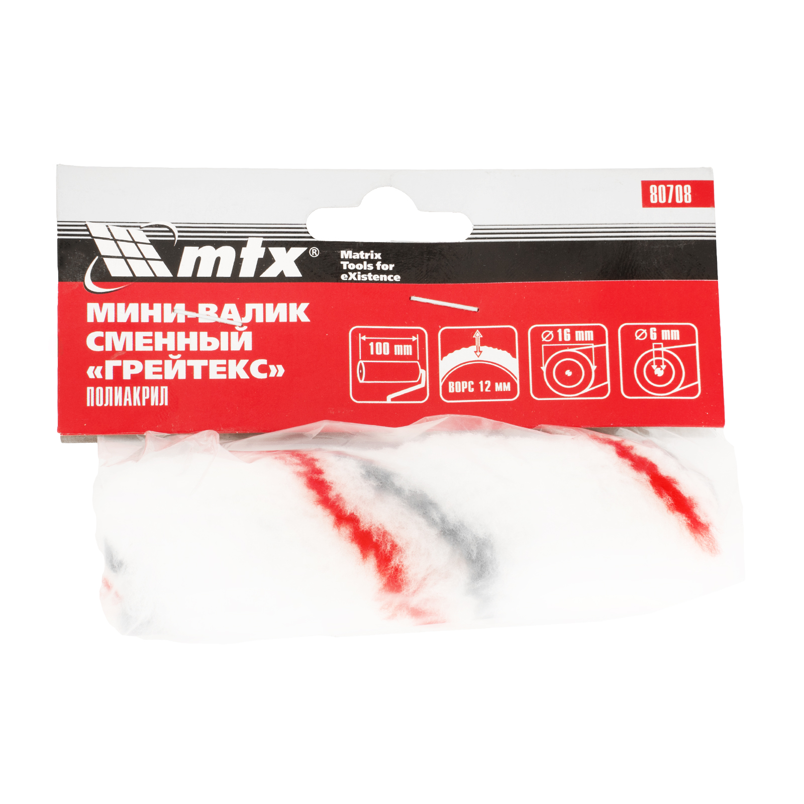 Сменный мини-валик MTX «Грейтекс» 80708 шириной 110 мм и диаметром 16 мм, с ворсом из полиакрила 12 мм, устанавливается на бюгель диаметром 6 мм. Подходит для большинства поверхностей: оштукатуренных, бетонных, деревянных, металлических и др. Компактный валик удобен для окрашивания небольших участков.