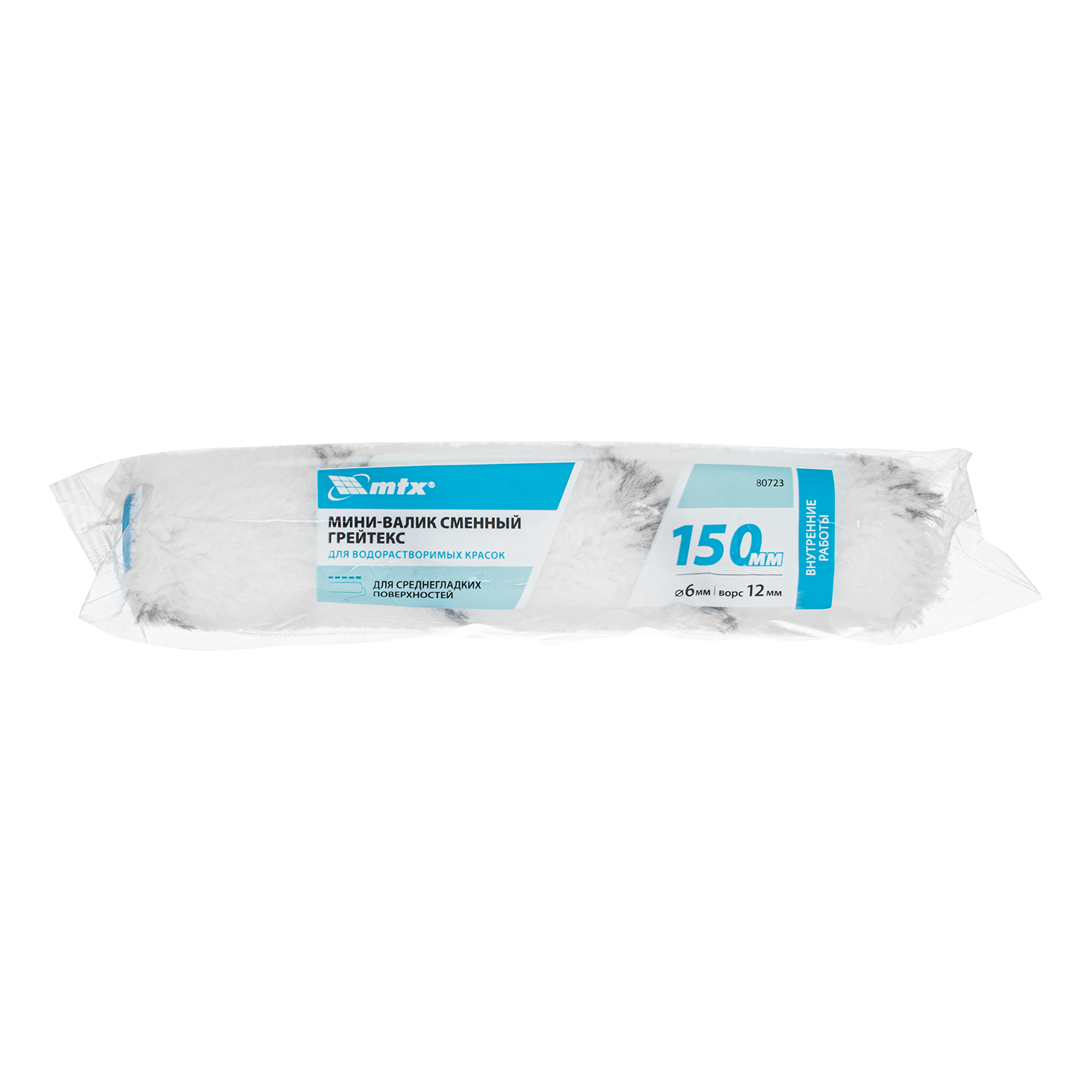 Сменный мини-валик MTX «Грейтекс» 80723 шириной 150 мм и диаметром 16 мм, с ворсом из полиакрила 12 мм, устанавливается на бюгель диаметром 6 мм. Подходит для большинства поверхностей: оштукатуренных, бетонных, деревянных, металлических и др. Компактный валик удобен для окрашивания небольших участков.