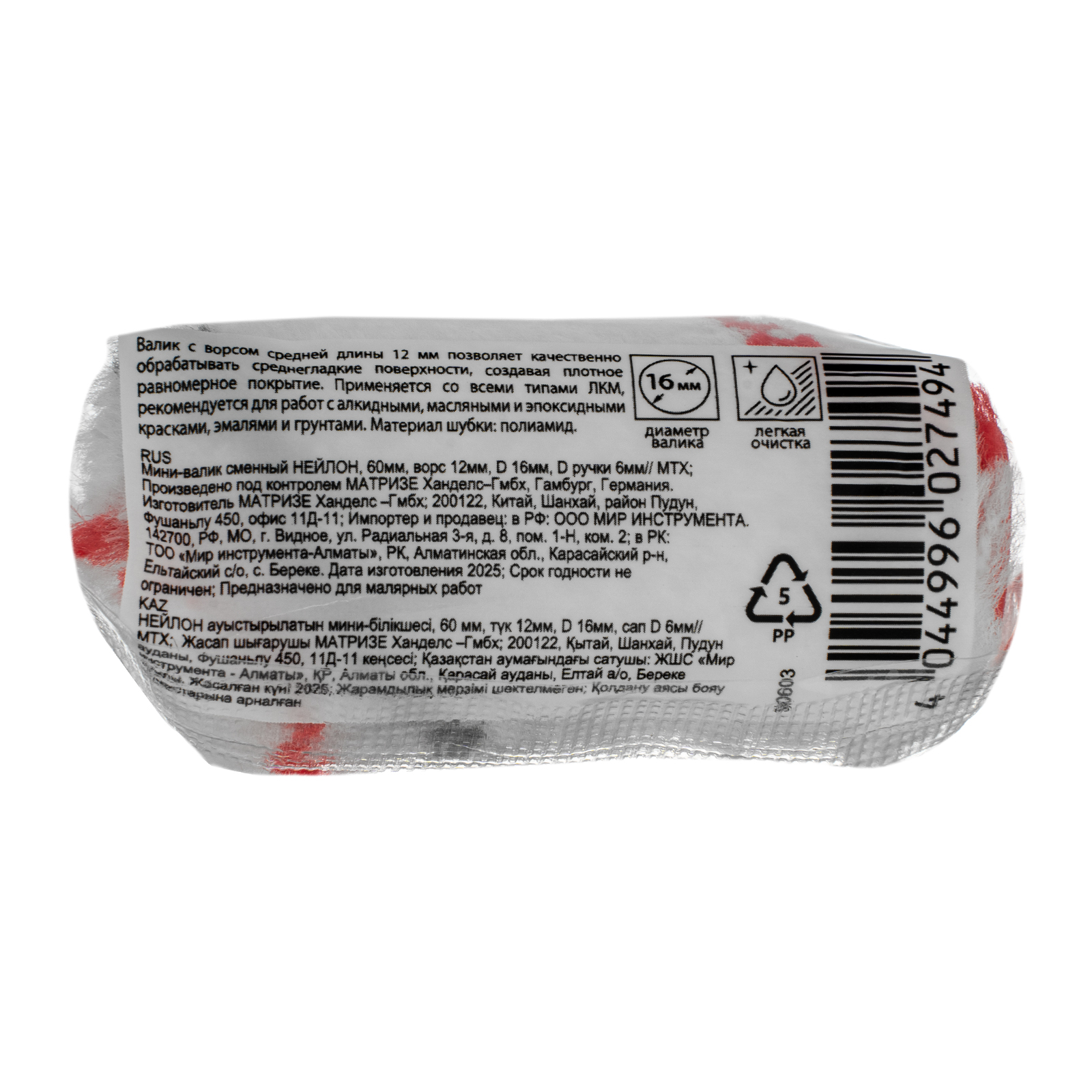 Сменный мини-валик MTX «Нейлон» 80603 из полиамида, с ворсом 12 мм, шириной 60 мм и диаметром ролика 16 мм подходит для бюгелей диаметром 6 мм. Предназначен для окрашивания небольших участков и труднодоступных мест. Валик может использоваться как с водно-дисперсионными, так и органорастворимыми красками.