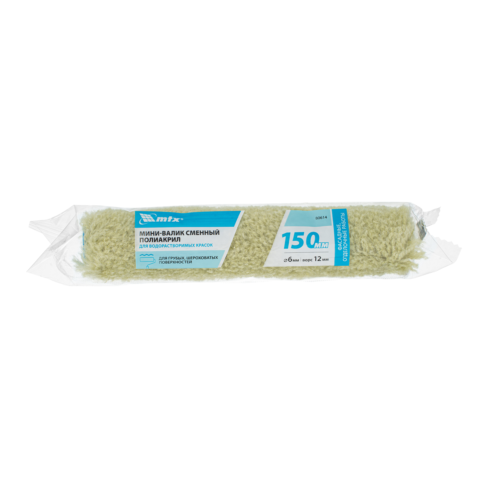 Сменный синтетический мини-валик для грубых поверхностей MTX «Полиакрил» 80614 шириной 150 мм, диаметром ролика 16 мм, ворсом 12 мм, подходит для бюгелей диаметром 6 мм. Используется для нанесения красок на водной основе и красок с ограниченным содержанием растворителей. Имеет длительный срок службы, оптимален для полушершавых поверхностей, подходит также для гладких и грубых оснований.