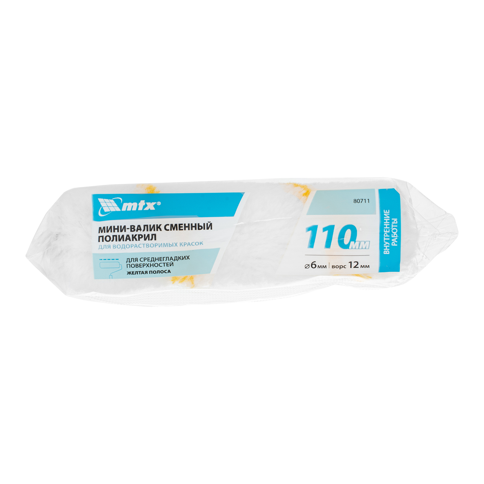 Сменный мини-валик MTX «Полиакрил» 80711 шириной 110 мм и диаметром ролика 16 мм, с ворсом 12 мм, подходит для бюгелей диаметром 6 мм. Удобен для окрашивания небольших и труднодоступных участков, подходит для среднегладких, грубых и гладких поверхностей. Применяется для нанесения эмалей, красок, лаков, а также иных лакокрасочных материалов во время проведения внутренних и наружных отделочных работ, имеет длительный срок службы.