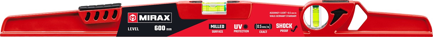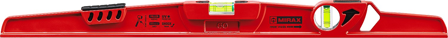 Предназначен для контроля горизонтальности и вертикальности поверхностей. Порядок работы: Установите уровень базовой поверхностью на измеряемую плоскость. Поверхность горизонтальна (вертикальна), если воздушный пузырек находится посередине между двумя центральными насечками соответствующего глазка. Внимание! Строительный уровень является точным измерительным прибором. Оберегайте прибор от механических повреждений. Перед работой проверьте точность показаний уровня путем сравнения показаний при повороте уровня на 180° вокруг оси, перпендикулярной измерительным плоскостям.