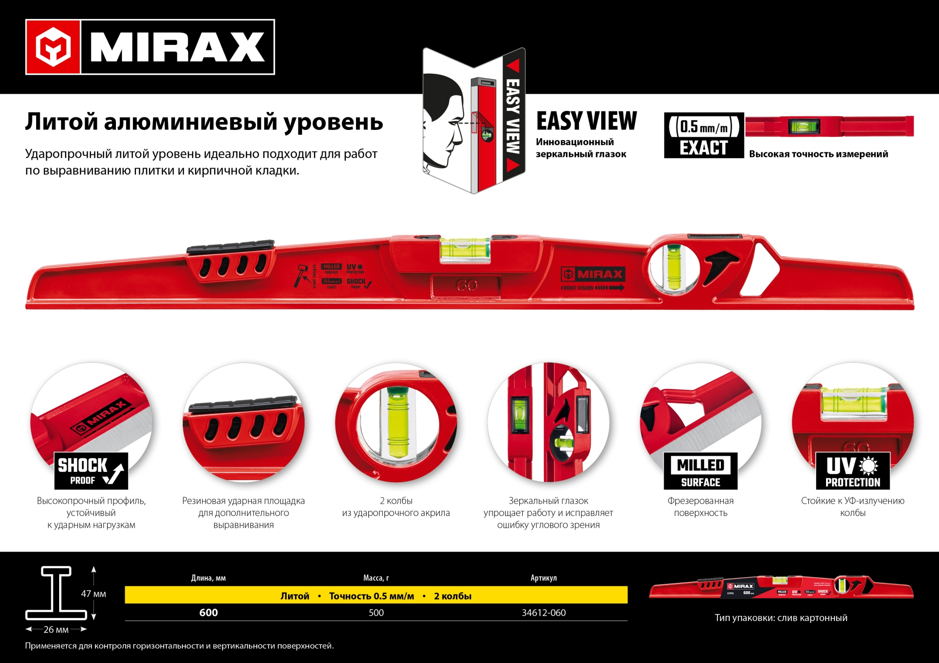 Ударопрочный литой уровень идеально подходит для работ по выравниванию плитки и кирпичной кладки