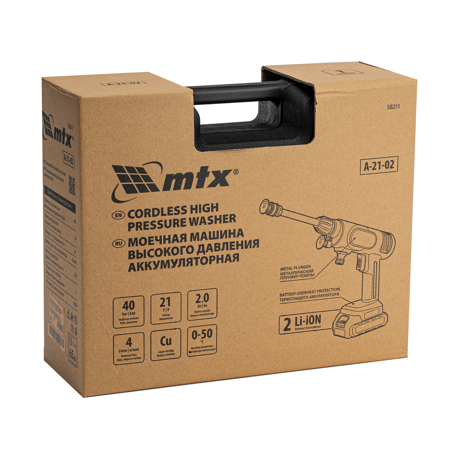 Аккумуляторная моечная машина высокого давления MTX A-21-02 58211 производительностью 4 л/мин работает от аккумулятора Li-Ion 21 В (в комплекте 2 шт.). Используется для мытья фасадов зданий, автомобилей, садовых инструментов и т.д. Оптимальна для бытового применения. Аккумуляторная батарея Li-Ion без эффекта памяти, емкостью 2 А·ч, обеспечивает длительную работу. Аккумулятор такого типа допускает подзарядку без потери емкости. Машина проста в использовании и не требует специального обслуживания. Максимальное давление — 40 бар.