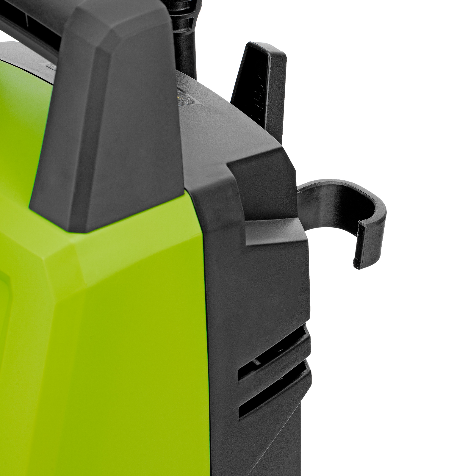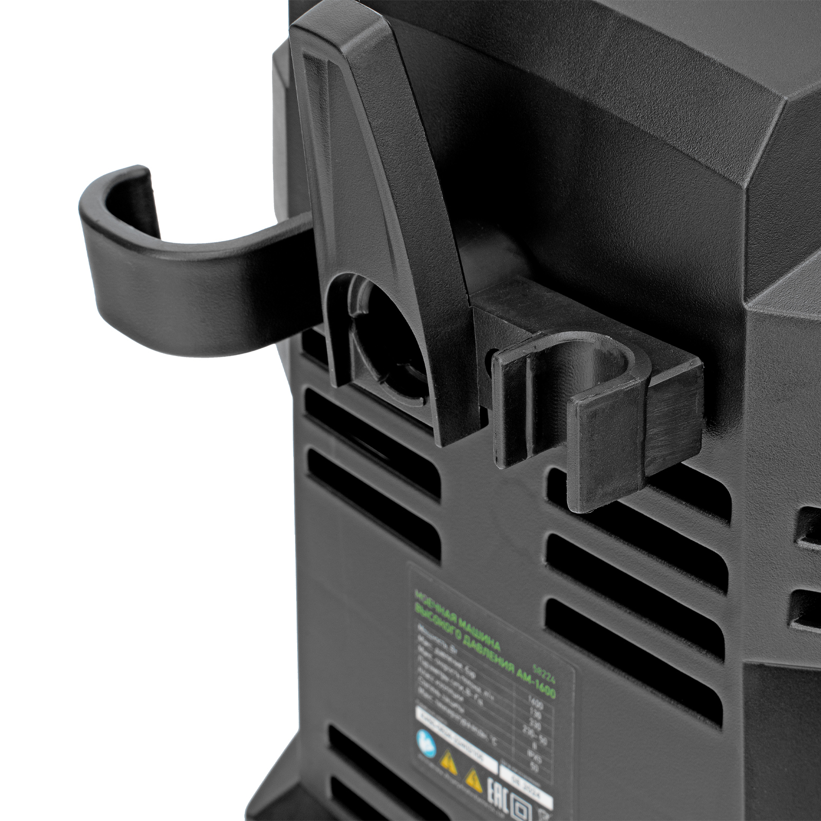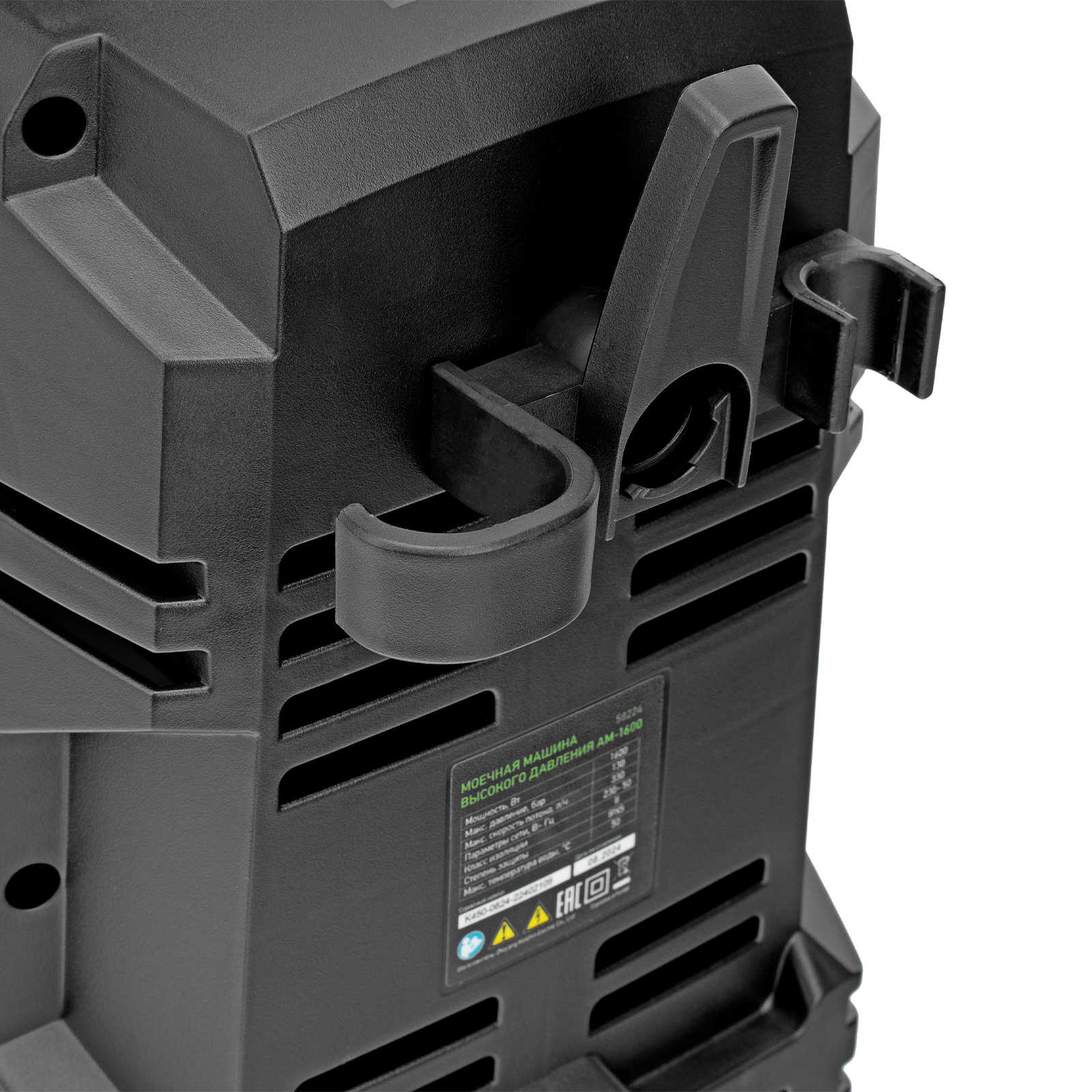 - Продуманное хранение и транспортировка — на корпусе имеется удобная ручка, для кабеля и шланга предусмотрены специальные кронштейны.