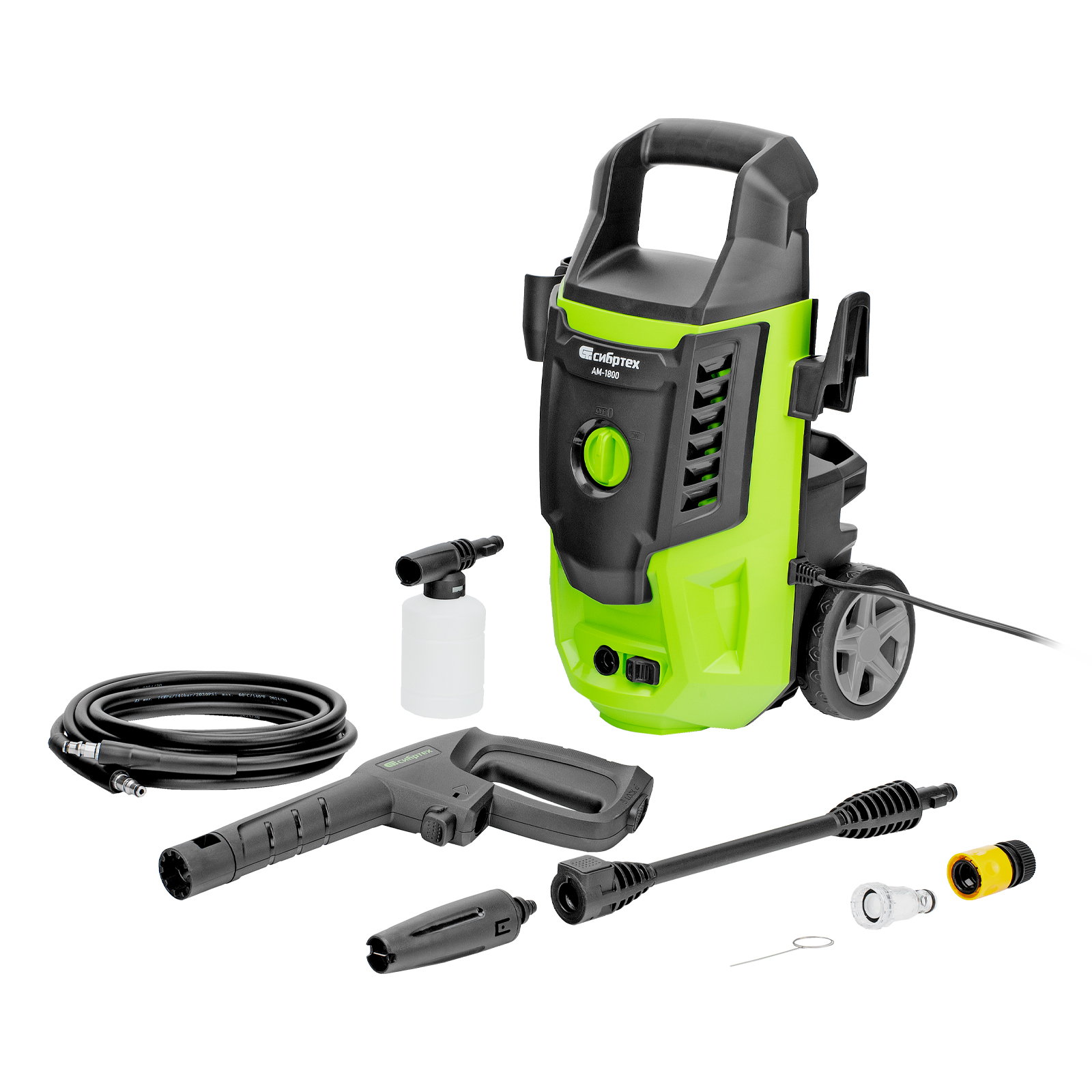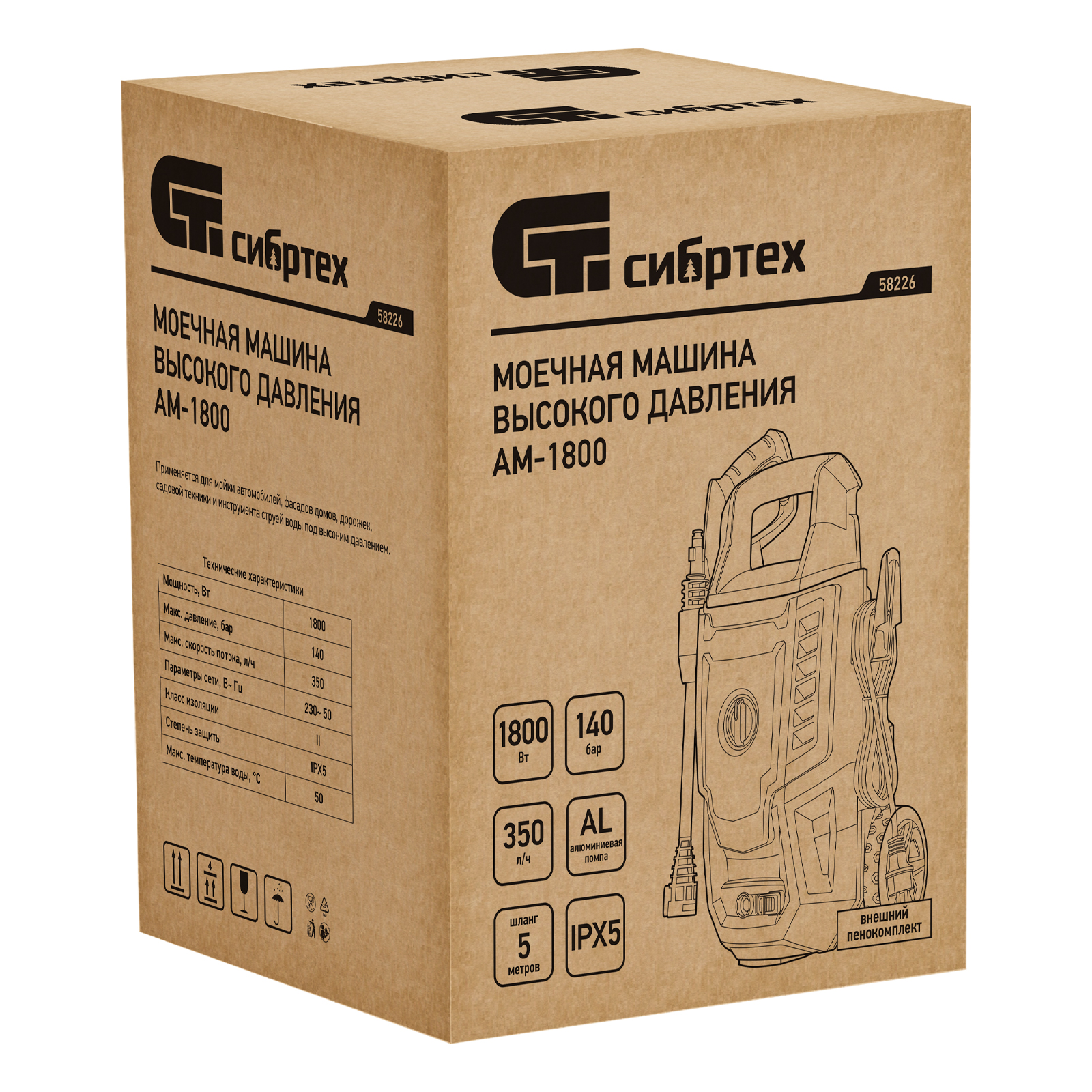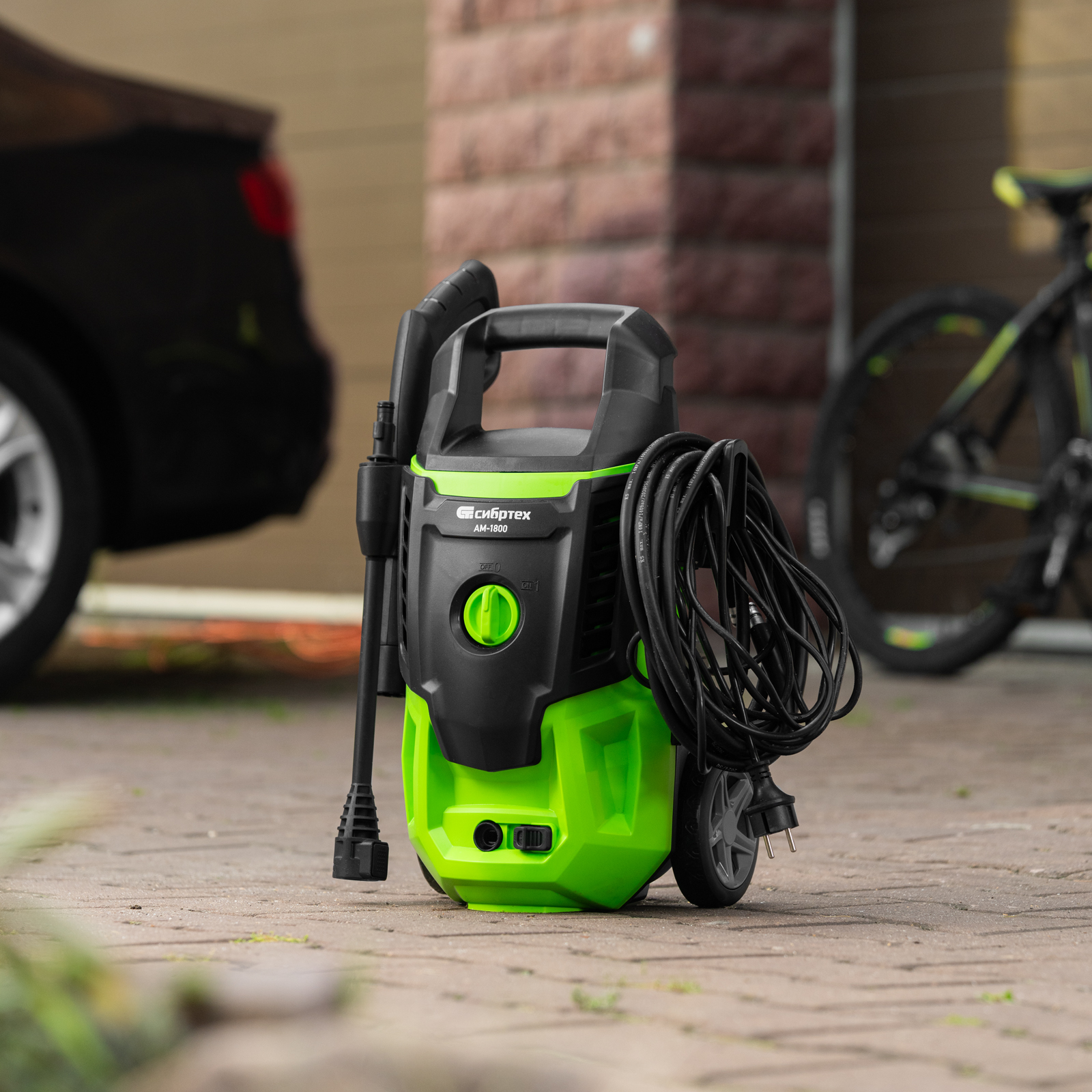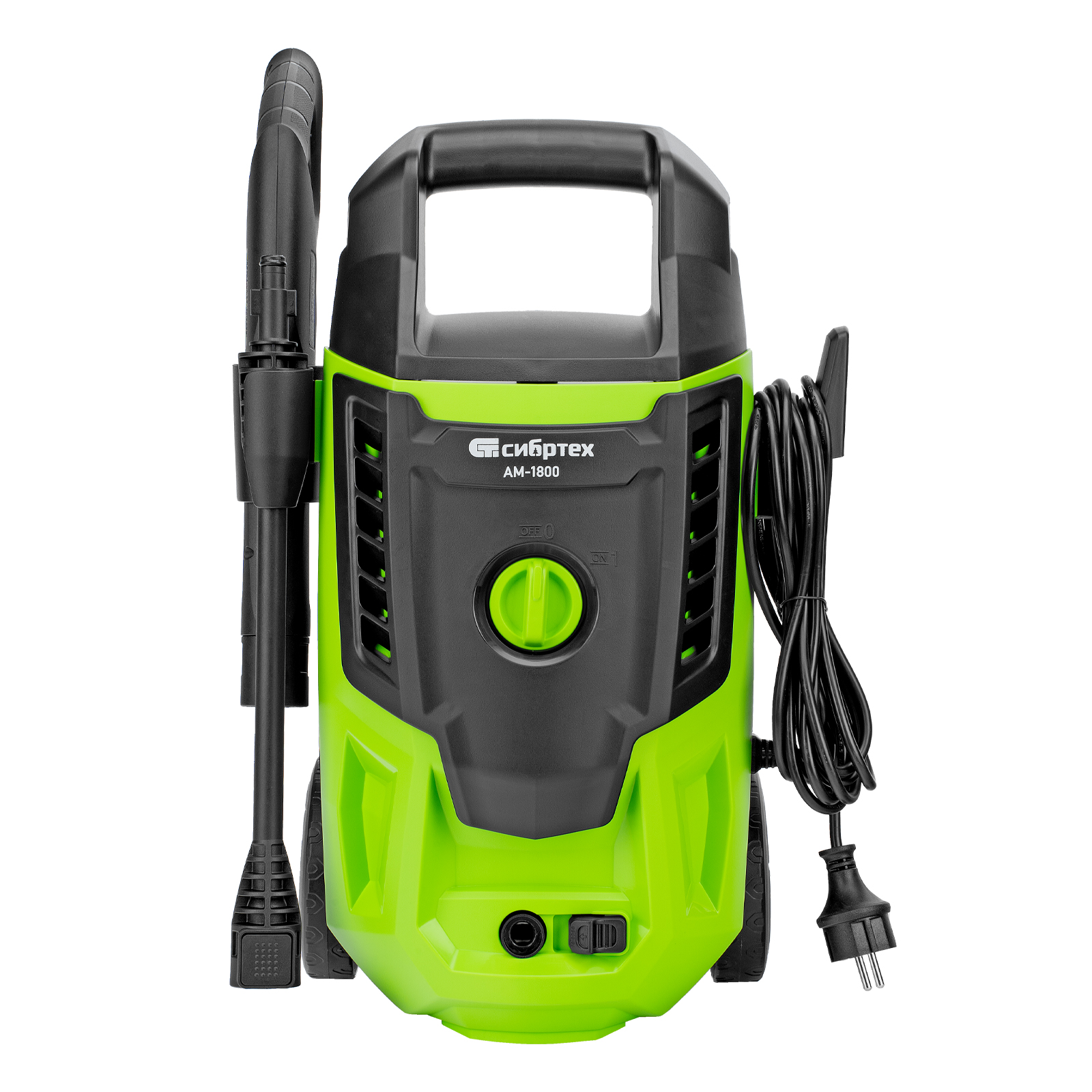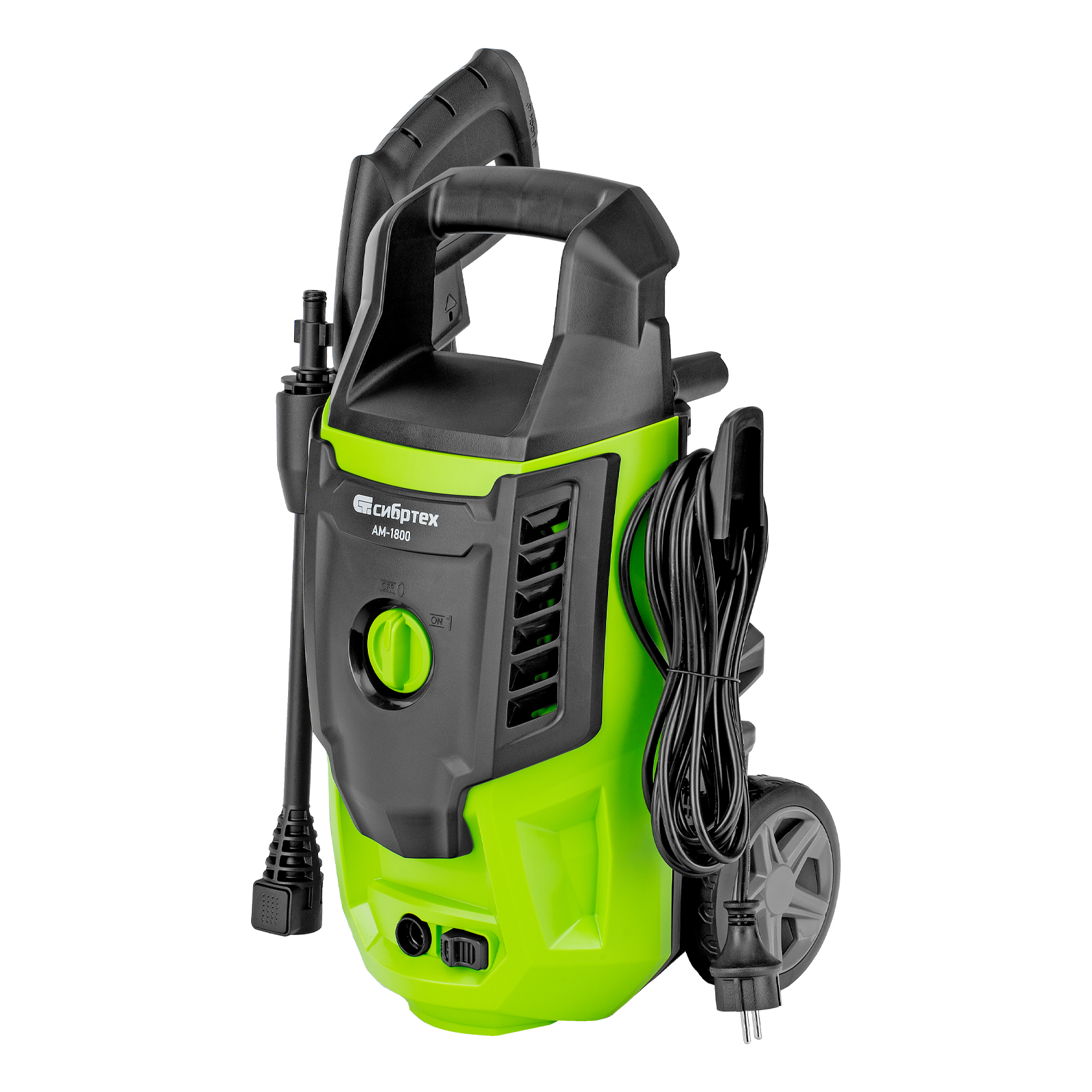 Колесная моечная машина высокого давления Сибртех AM-1800 58226 мощностью 1800 Вт и производительностью 350 л/ч подает струю воды 140 бар. Позволяет быстро очистить садовые дорожки, забор, стены строений, садовый инвентарь, уличную мебель, кузов автомобиля. Машина подключается к водопроводу, а также способна работать в режиме самовсасывания — в этом случае в качестве источника воды можно использовать любую емкость. Устройство будет полезно владельцам дачных участков.