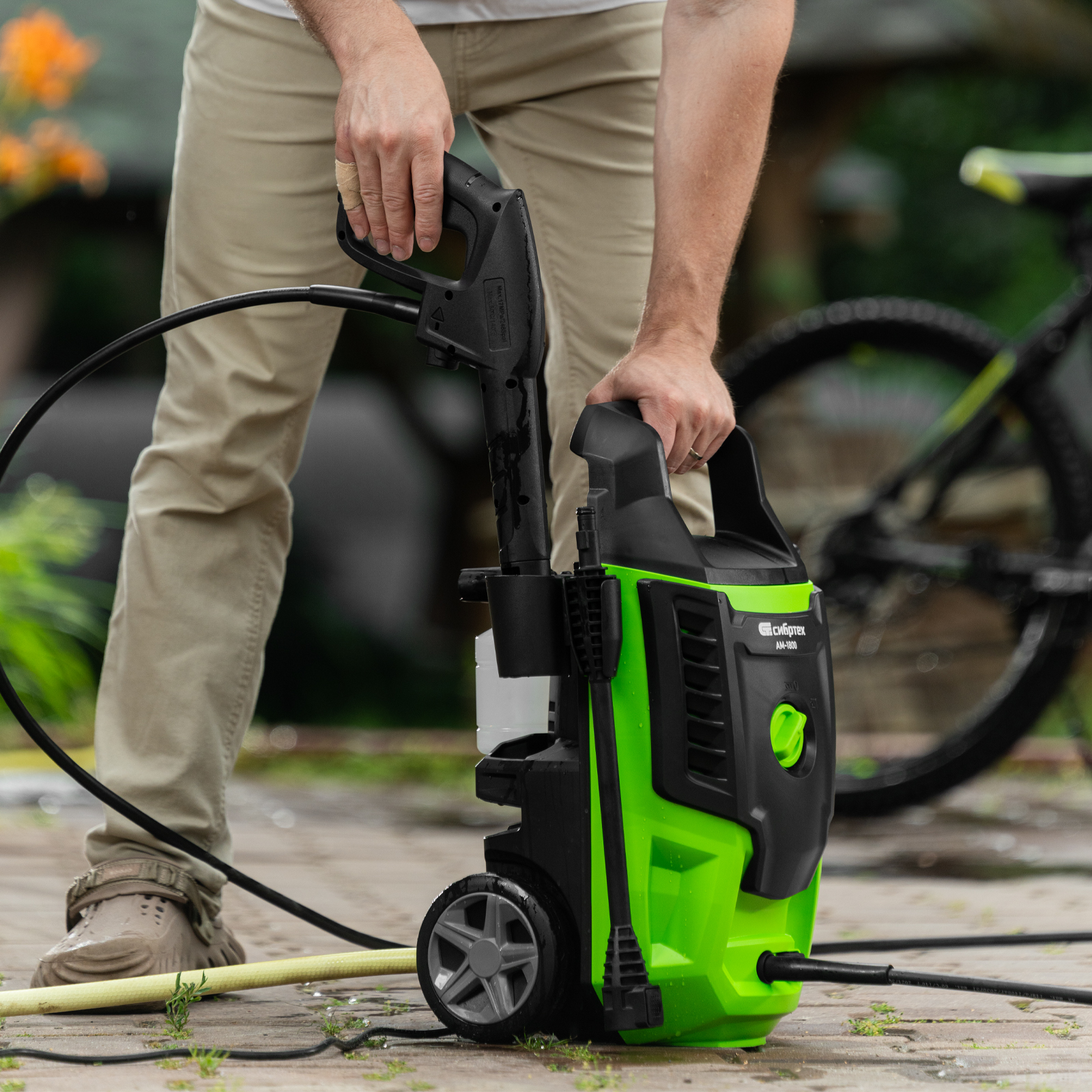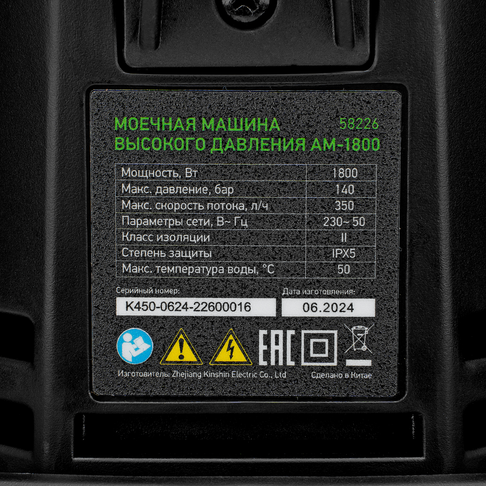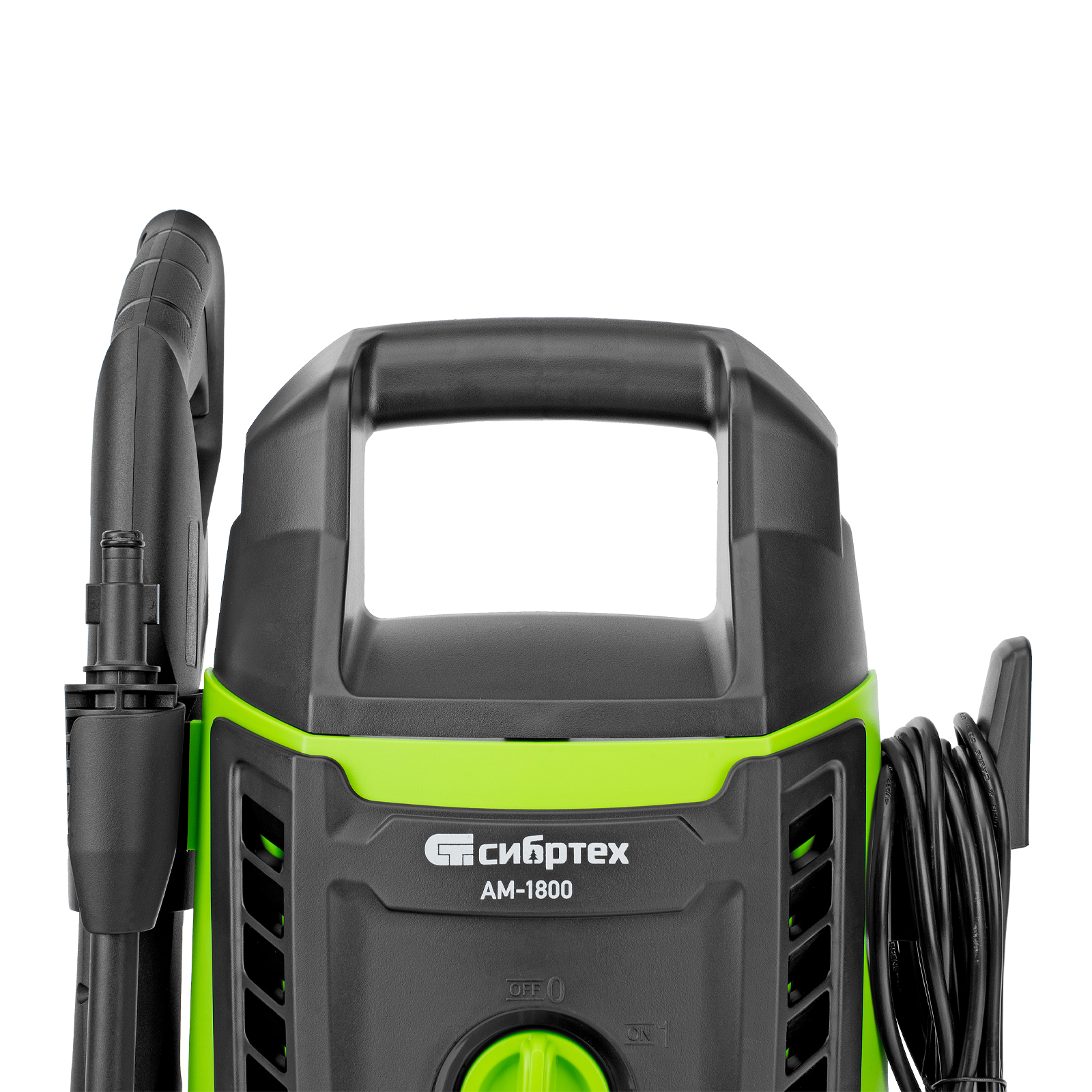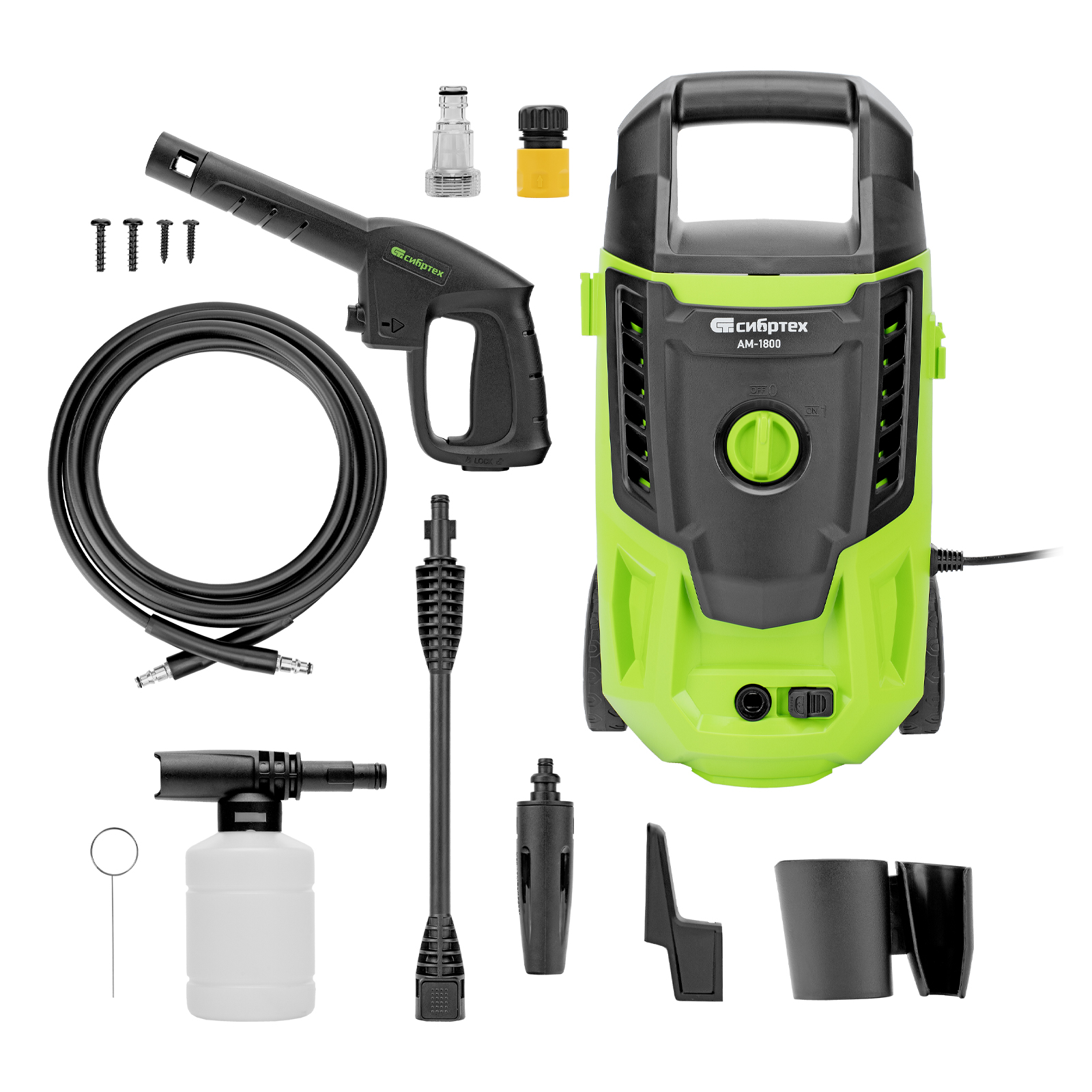 Колесная моечная машина высокого давления Сибртех AM-1800 58226 мощностью 1800 Вт и производительностью 350 л/ч подает струю воды 140 бар. Позволяет быстро очистить садовые дорожки, забор, стены строений, садовый инвентарь, уличную мебель, кузов автомобиля. Машина подключается к водопроводу, а также способна работать в режиме самовсасывания — в этом случае в качестве источника воды можно использовать любую емкость. Устройство будет полезно владельцам дачных участков.
