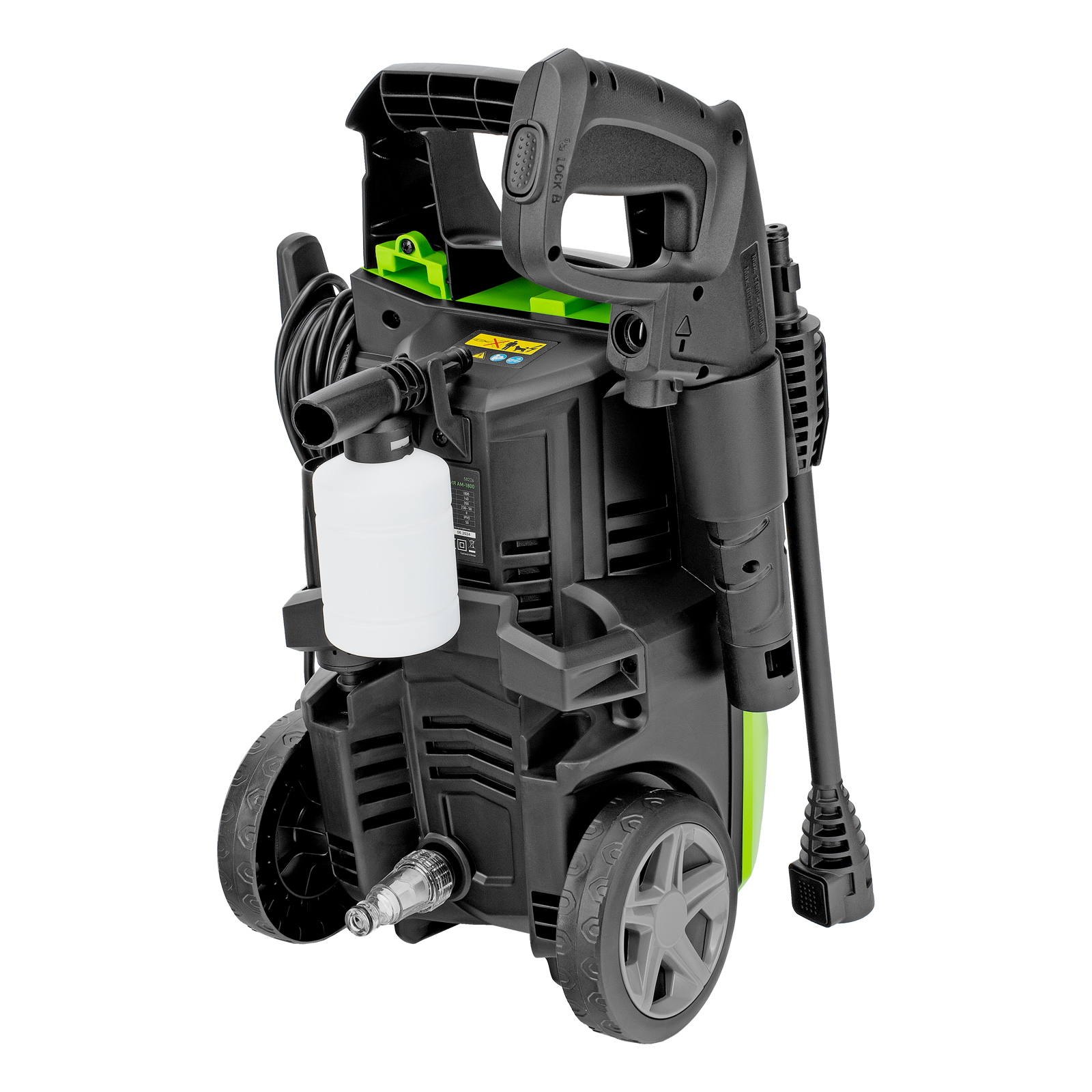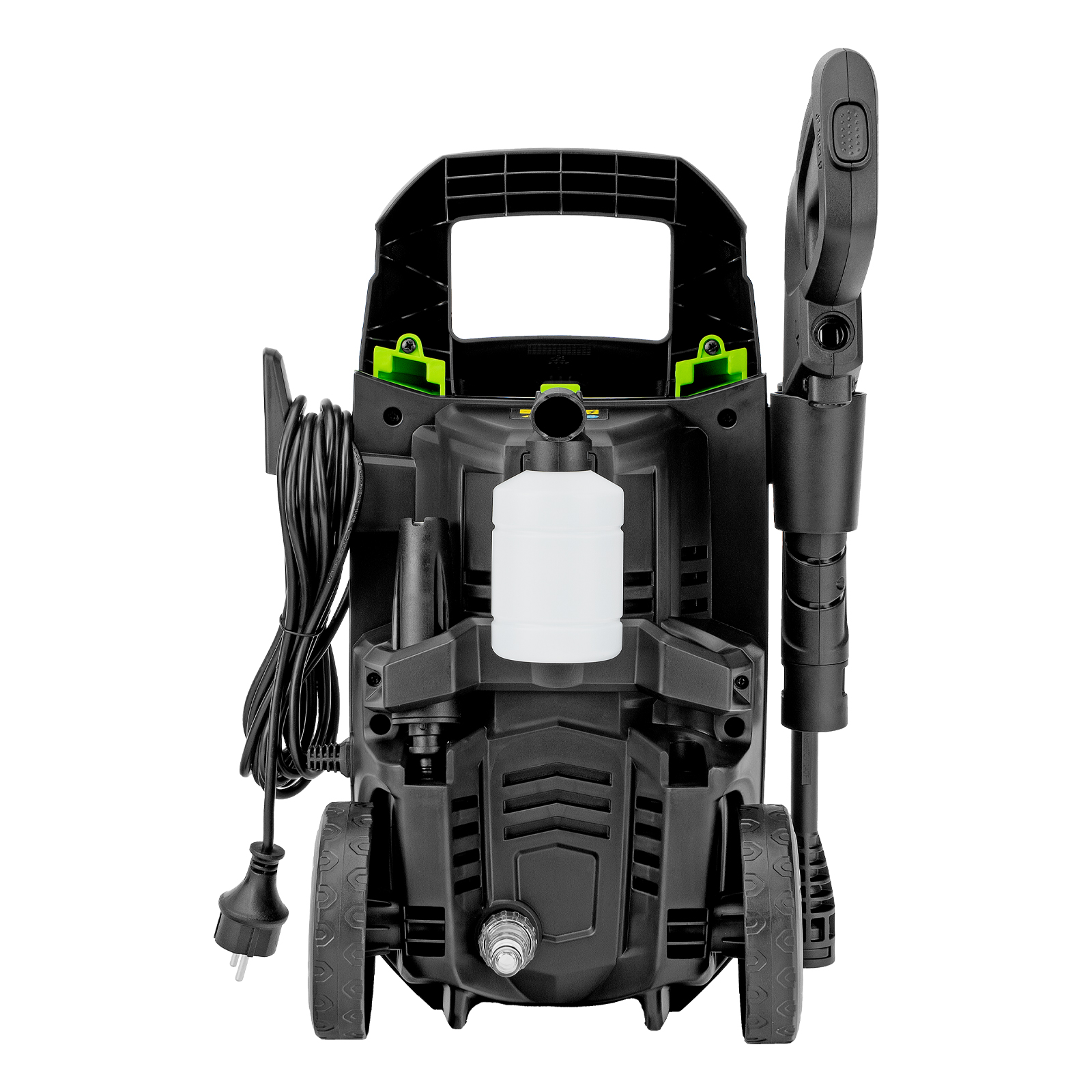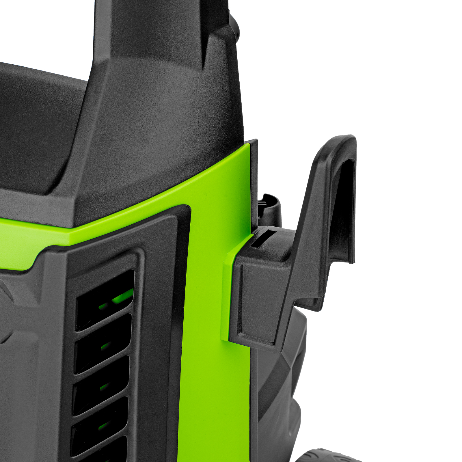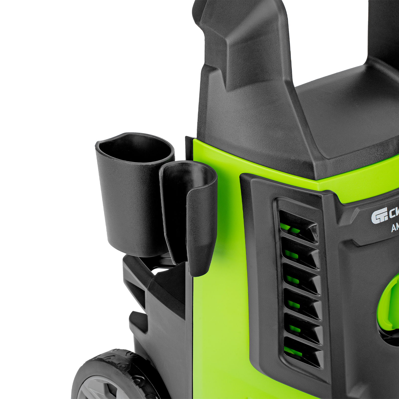 - Продуманное хранение и транспортировка — машина снабжена удобной ручкой и колесами, для кабеля и шланга предусмотрены специальные кронштейны.