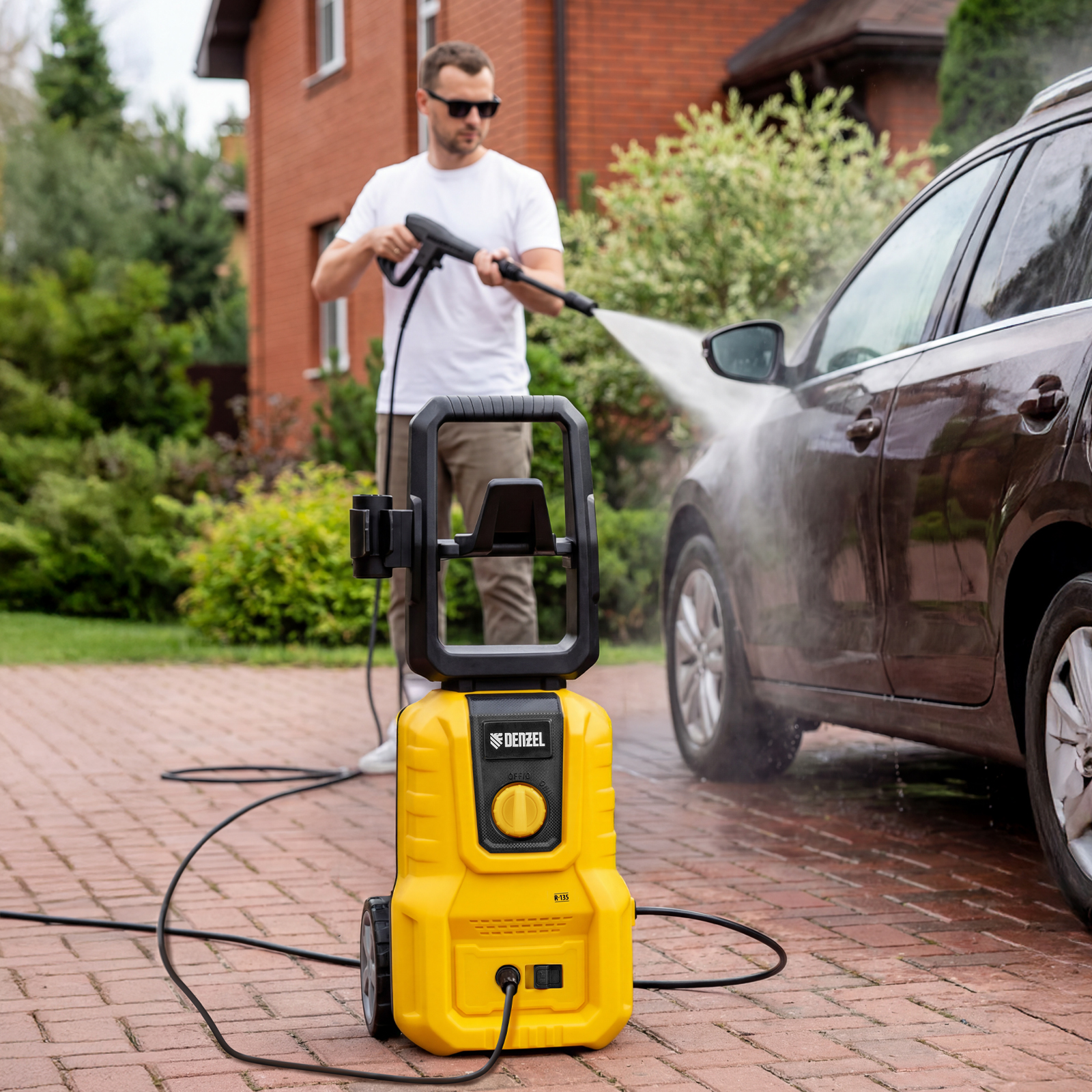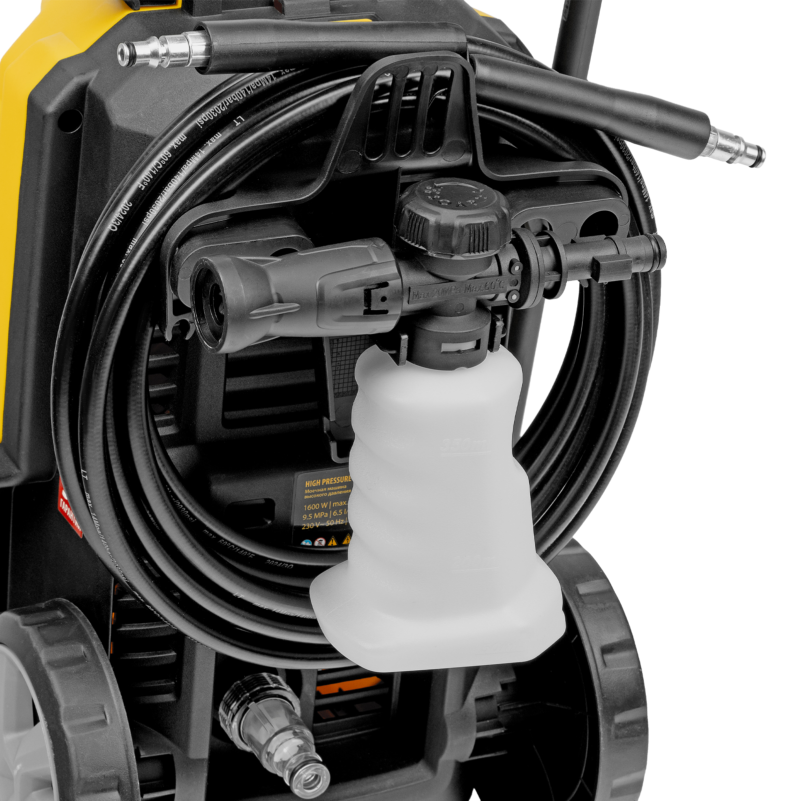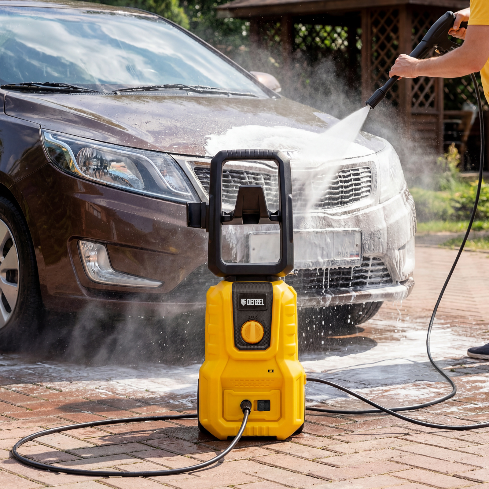 длина кабеля и шланга высокого давления составляет 5 м, что позволяет свободно передвигаться по участку.