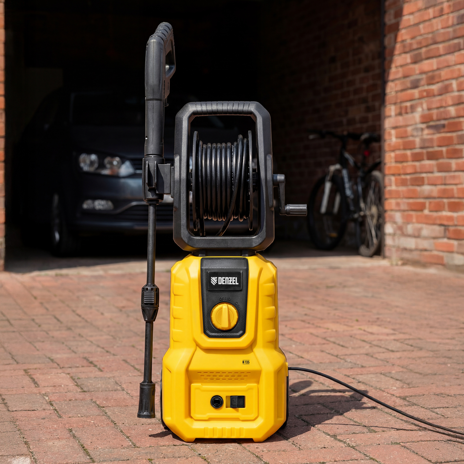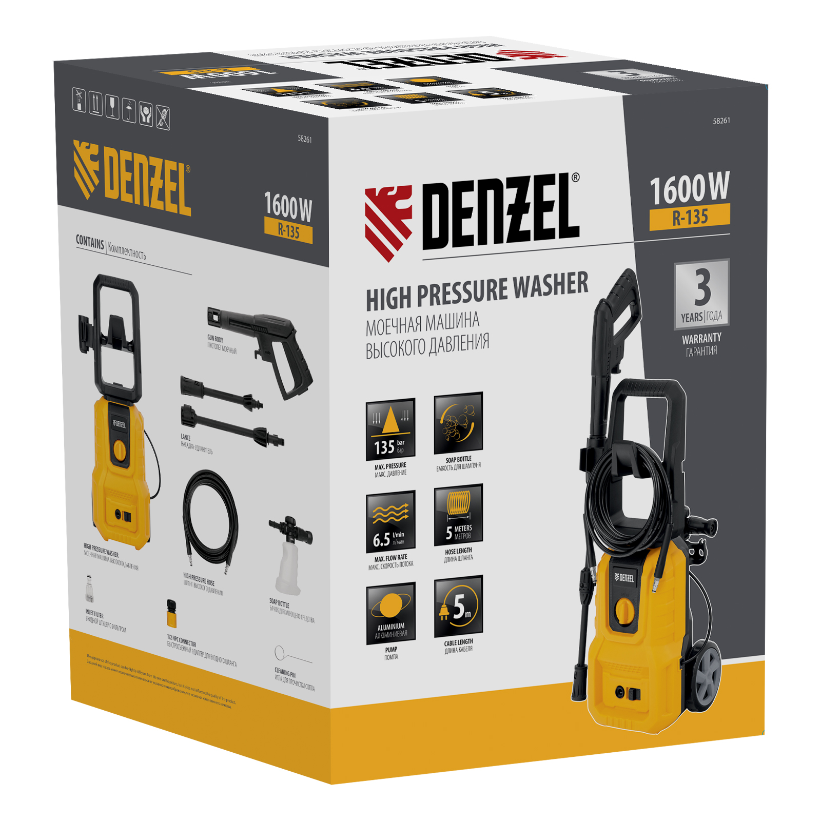 Моечная машина высокого давления Denzel R-135 58261 мощностью 1600 Вт поддерживает максимальное рабочее давление до 135 бар и обеспечивает объем подачи воды 390 л/ч. Позволяет быстро и эффективно очистить садовый инвентарь, фасад дома, дорожку, отмыть автомобиль и т.д. Оснащена самовсасывающим помпой, поэтому может работать даже без подключения к водопроводу — подойдет любой резервуар или емкость с водой. Машина оптимальна для бытового использования.
