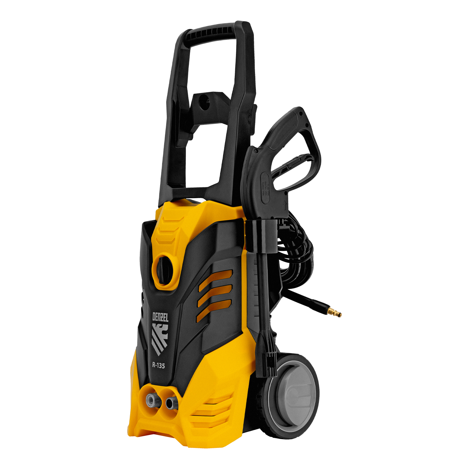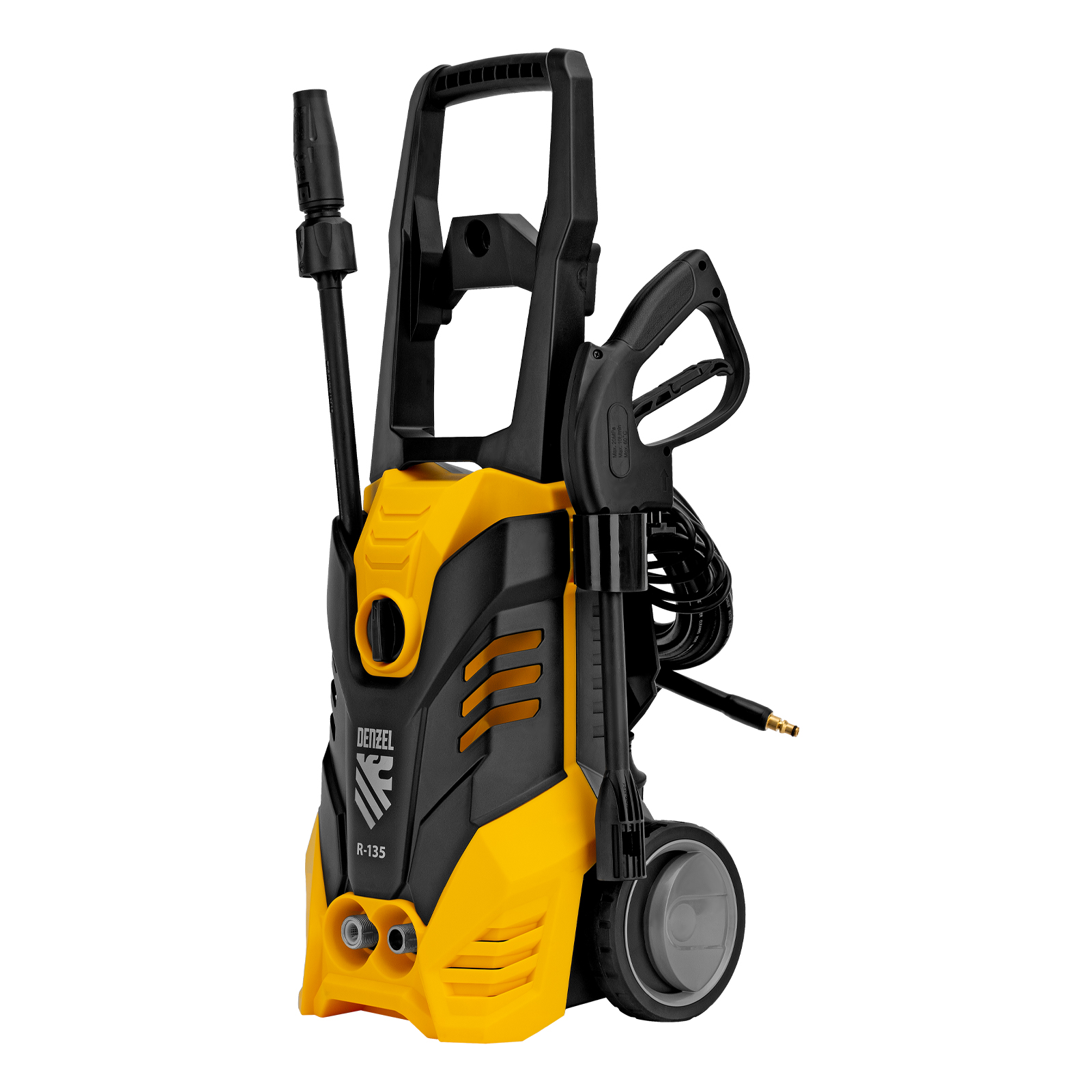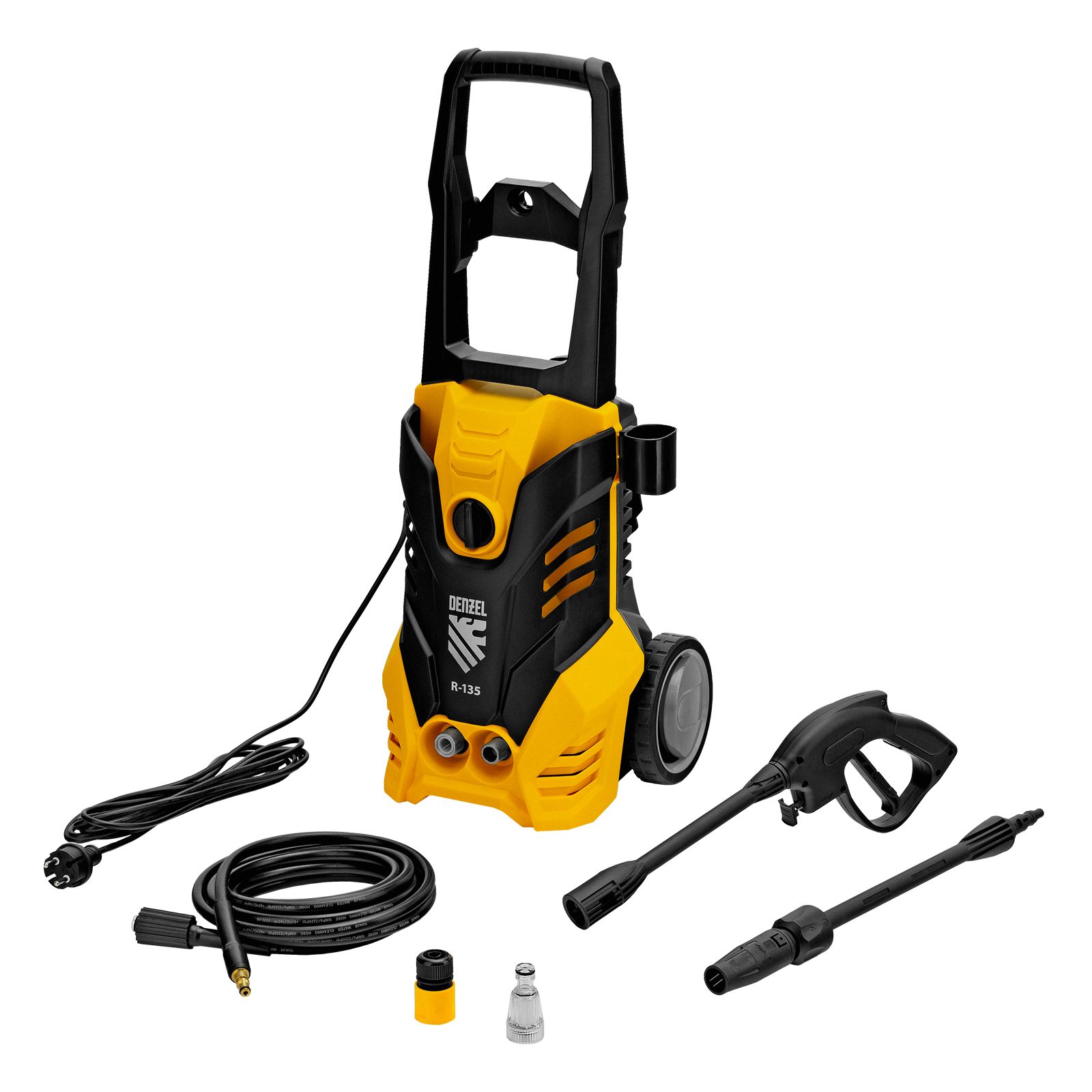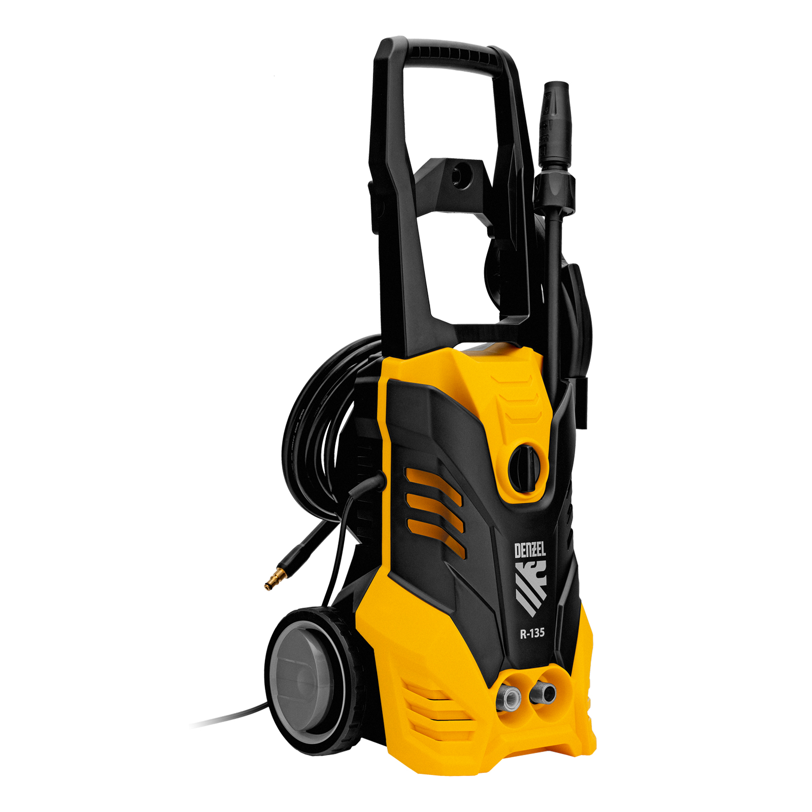 Колесная моечная машина высокого давления Denzel R-135 58233 производительностью 6 л/мин, мощностью 1800 Вт, с максимальным давлением 135 бар, используется для мытья автомобилей, садового инвентаря, велосипедов, дорожек и заборов. Мощный мотор и помпа высокой производительности позволяют быстро справляться даже с серьезными загрязнениями. Если нет доступа к водопроводу, мойка может осуществлять забор воды из резервуара в режиме самовсасывания, теряя при этом всего 5% давления.