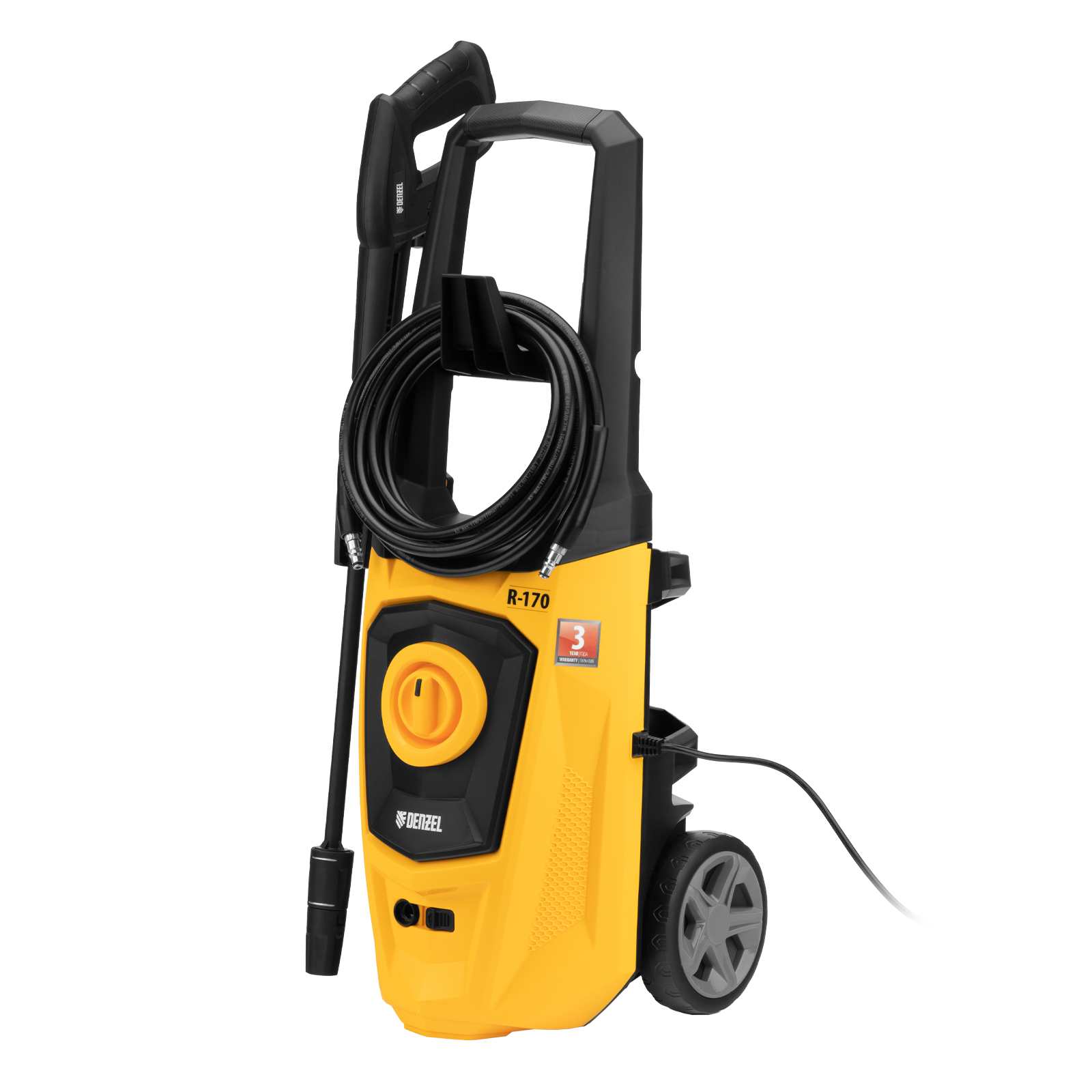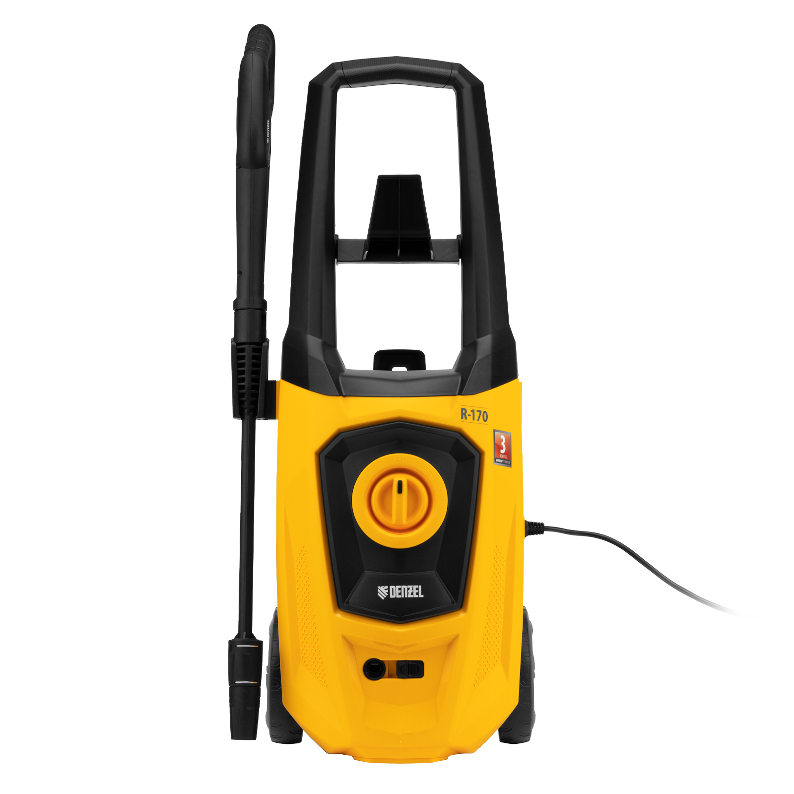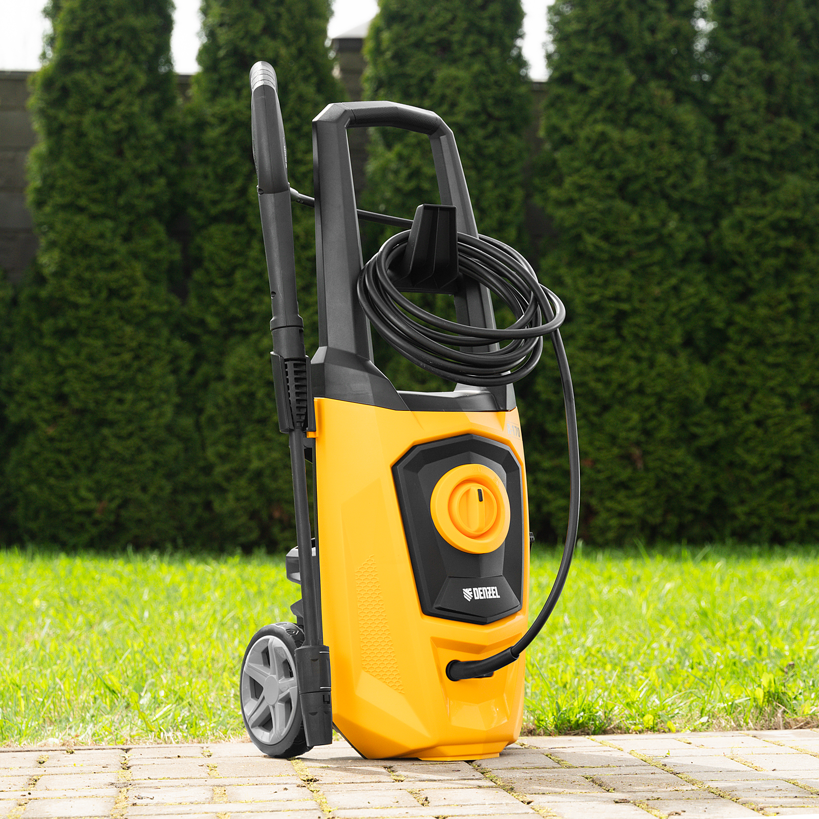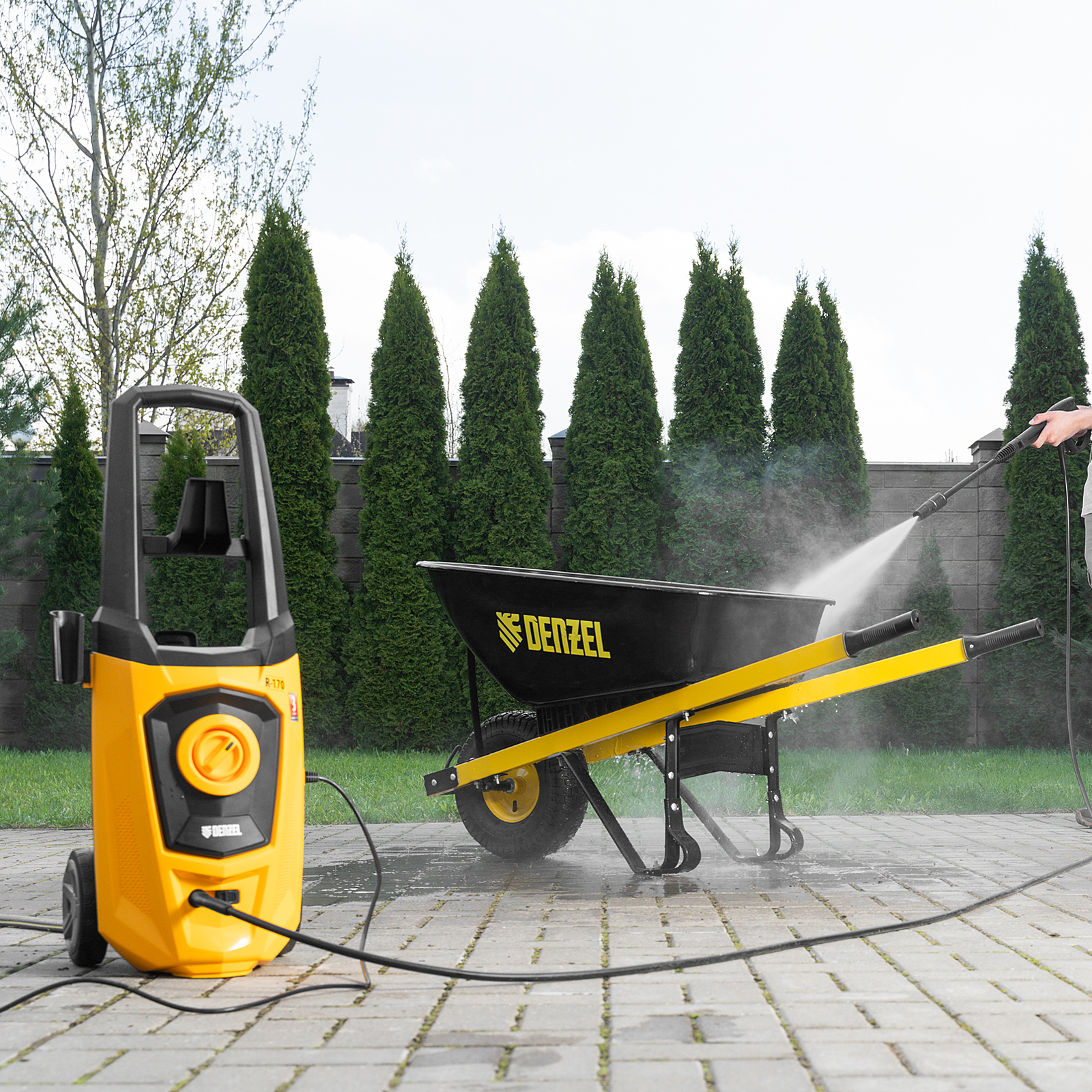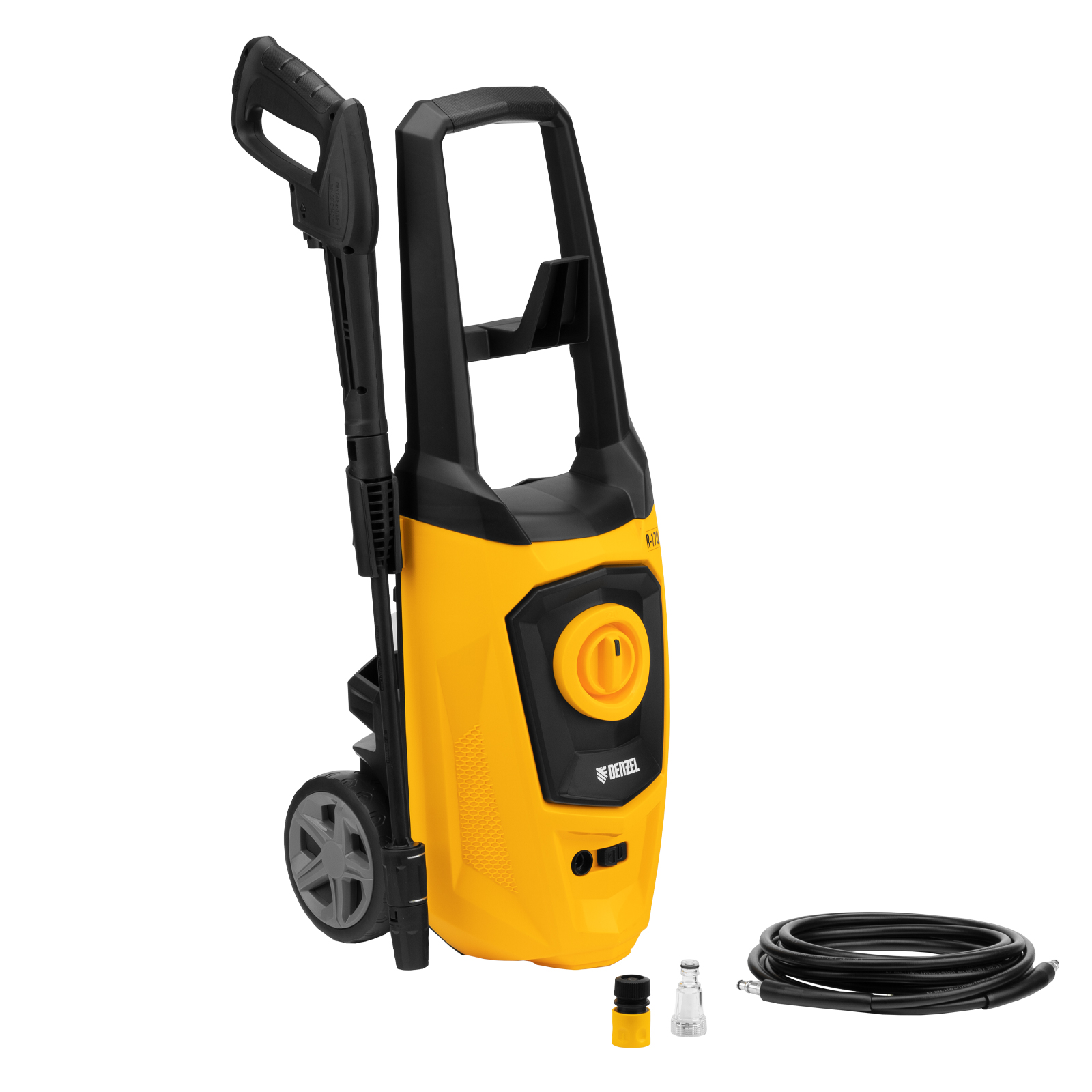 Колесная моечная машина высокого давления Denzel R-170 58228 мощностью 2000 Вт и производительностью 360 л/ч подает струю воды под давлением 170 бар и используется для очищения поверхностей. Позволяет быстро удалить загрязнения с кузова автомобиля, мотоцикла, велосипеда, садового и хозяйственного инвентаря, очистить садовую дорожку и террасу, а также стены и окна строений. Источником воды может служить водопроводная линия, а также любая емкость — машина способна работать в режиме самовсасывания. Мойка пригодится владельцам загородных участков.