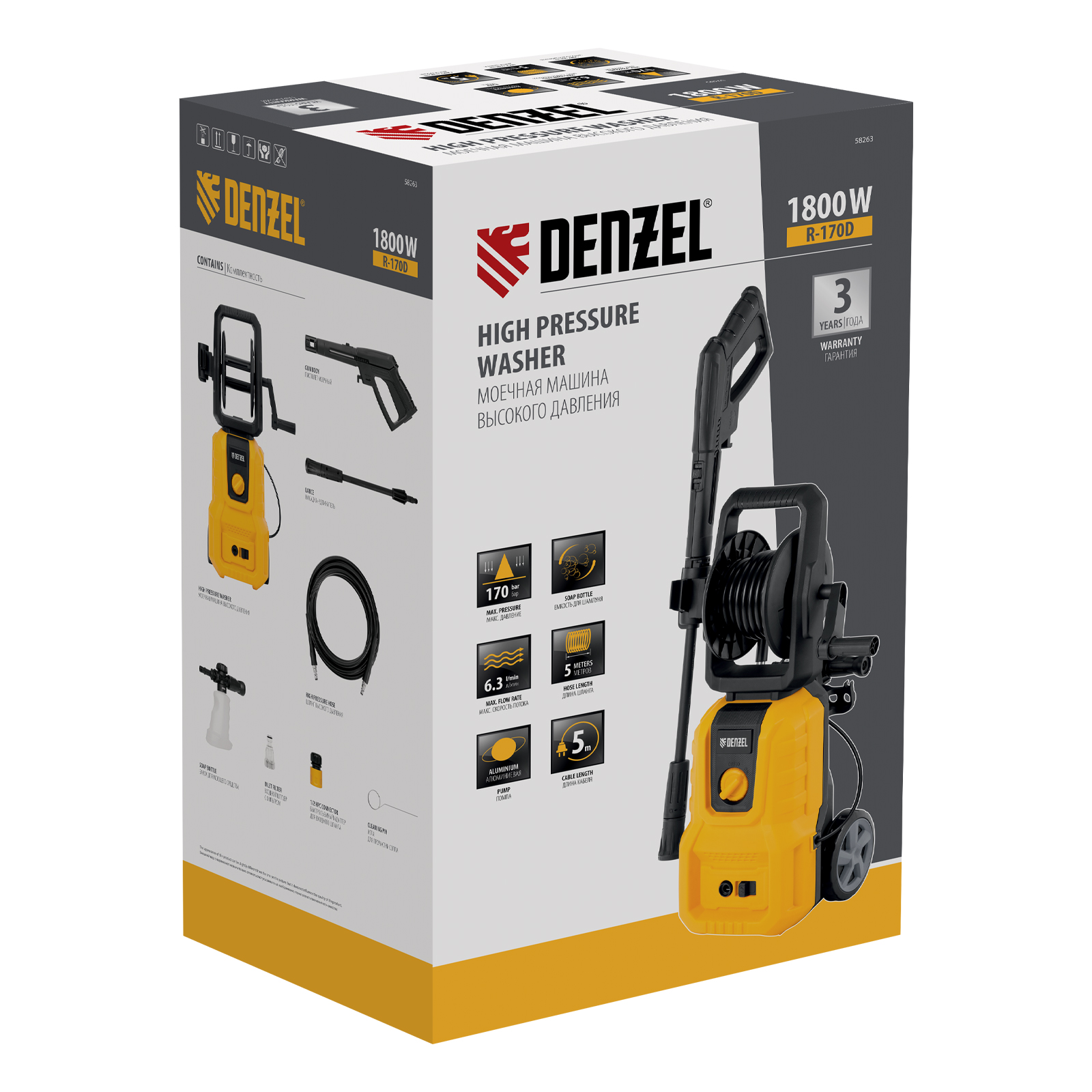 Моечная машина высокого давления Denzel R-170D 58263 с барабаном, мощностью 1800 Вт, поддерживает максимальное рабочее давление 170 бар и обеспечивает объем подачи воды 380 л/ч. Позволяет быстро и эффективно очистить садовый инвентарь, фасад дома, дорожку, отмыть автомобиль и т.д. Оснащена самовсасывающим насосом, поэтому может работать даже без подключения к водопроводу — подойдет любой резервуар или емкость с водой. Машина оптимальна для бытового использования.