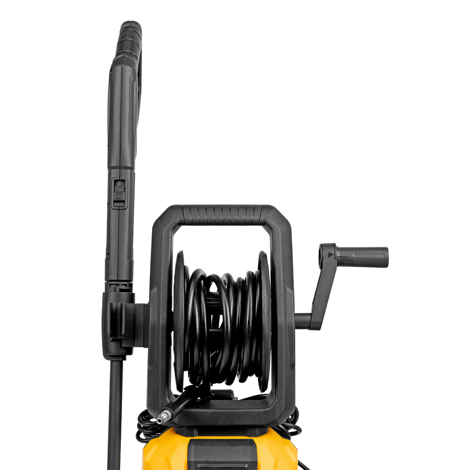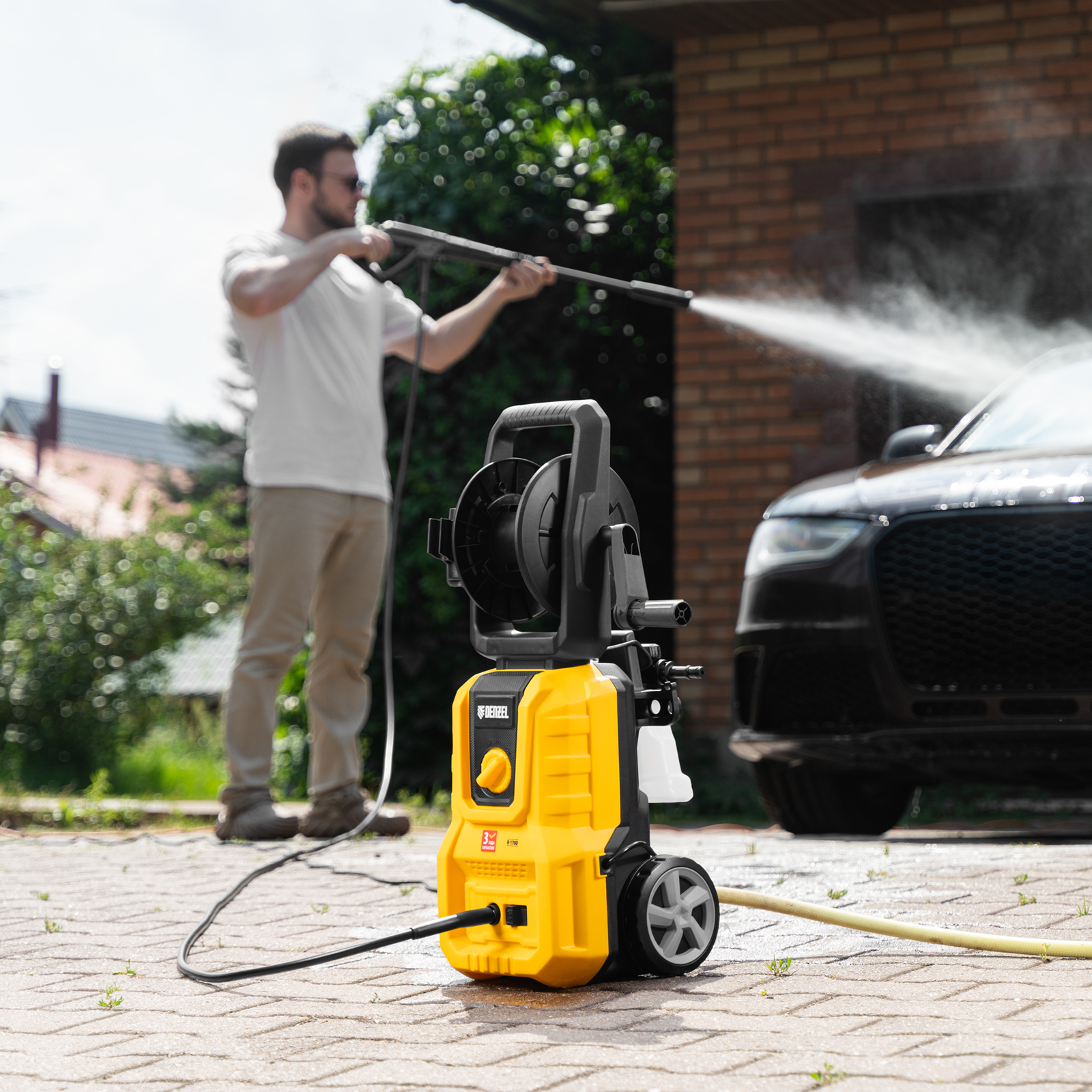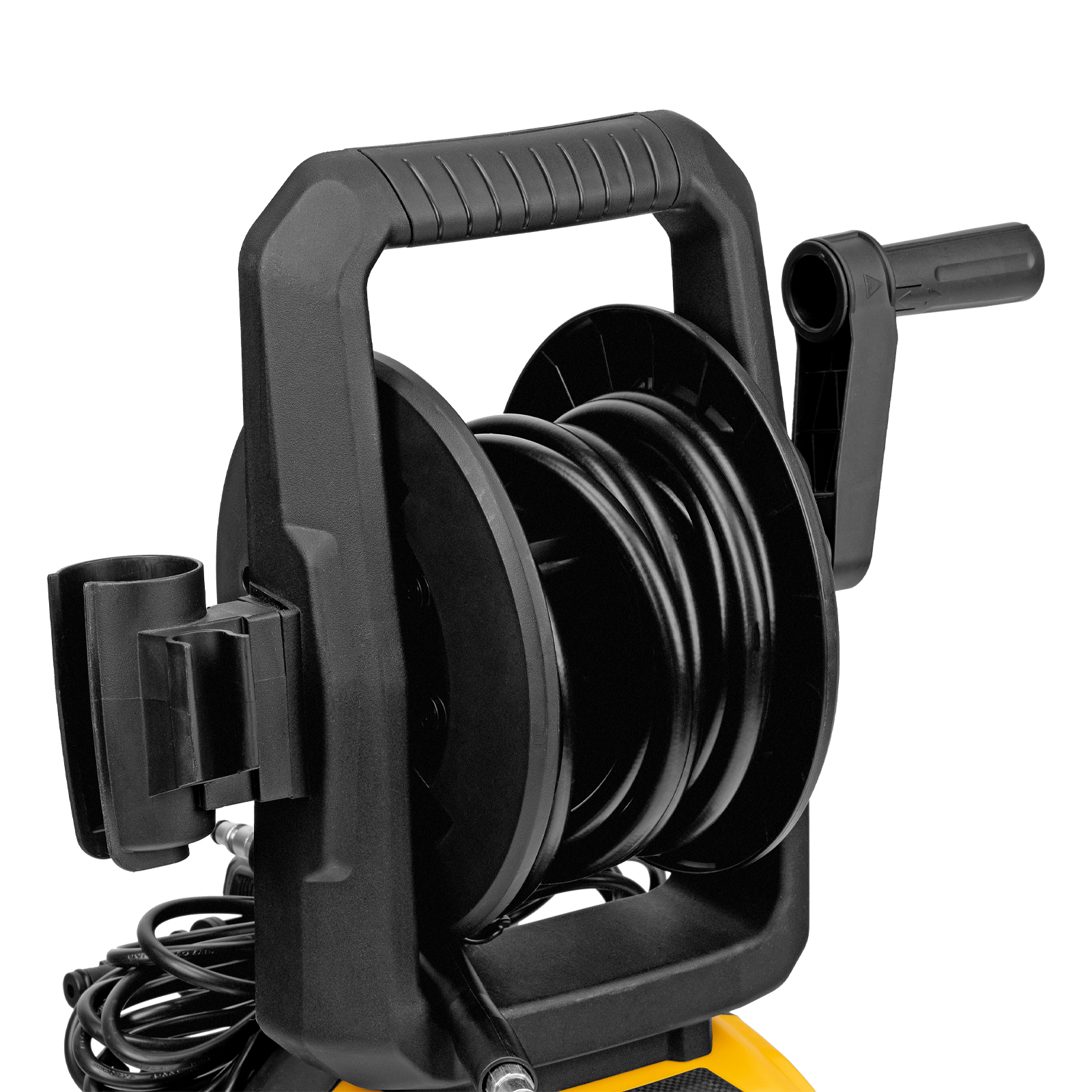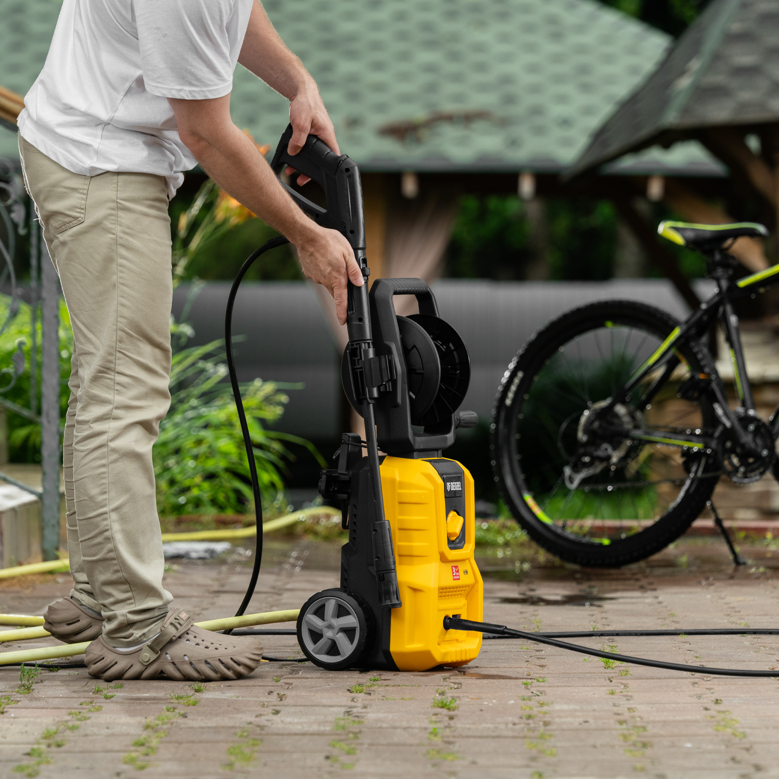 - Комфортная эксплуатация — барабан для шланга высокого давления упрощает работу, длина кабеля и шланга высокого давления составляет 5 м, что позволяет свободно передвигаться по участку.