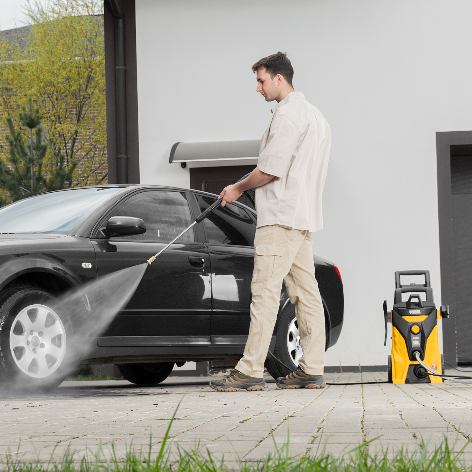 - Защита от случайного пуска — блокировка рычага пистолета позволяет включать автомойку только при полной готовности к работе.