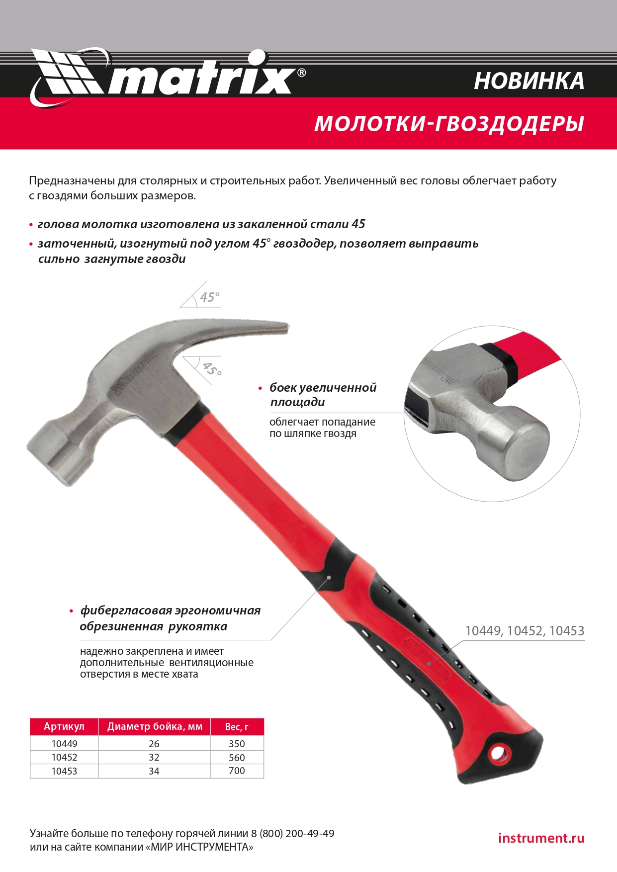 Молоток-гвоздодер Matrix 10453 длиной 335 мм, с головкой весом 700 г и отполированным бойком диаметром 34 мм, с фибергласовой обрезиненной рукояткой, — ударный инструмент, предназначенный для забивания гвоздей. Клиновидная прорезь позволяет подцепить согнувшийся гвоздь для его выпрямления. Молоток будет полезен строителю, столяру, плотнику, сборщику мебели, а также пригодится для домашнего использования.