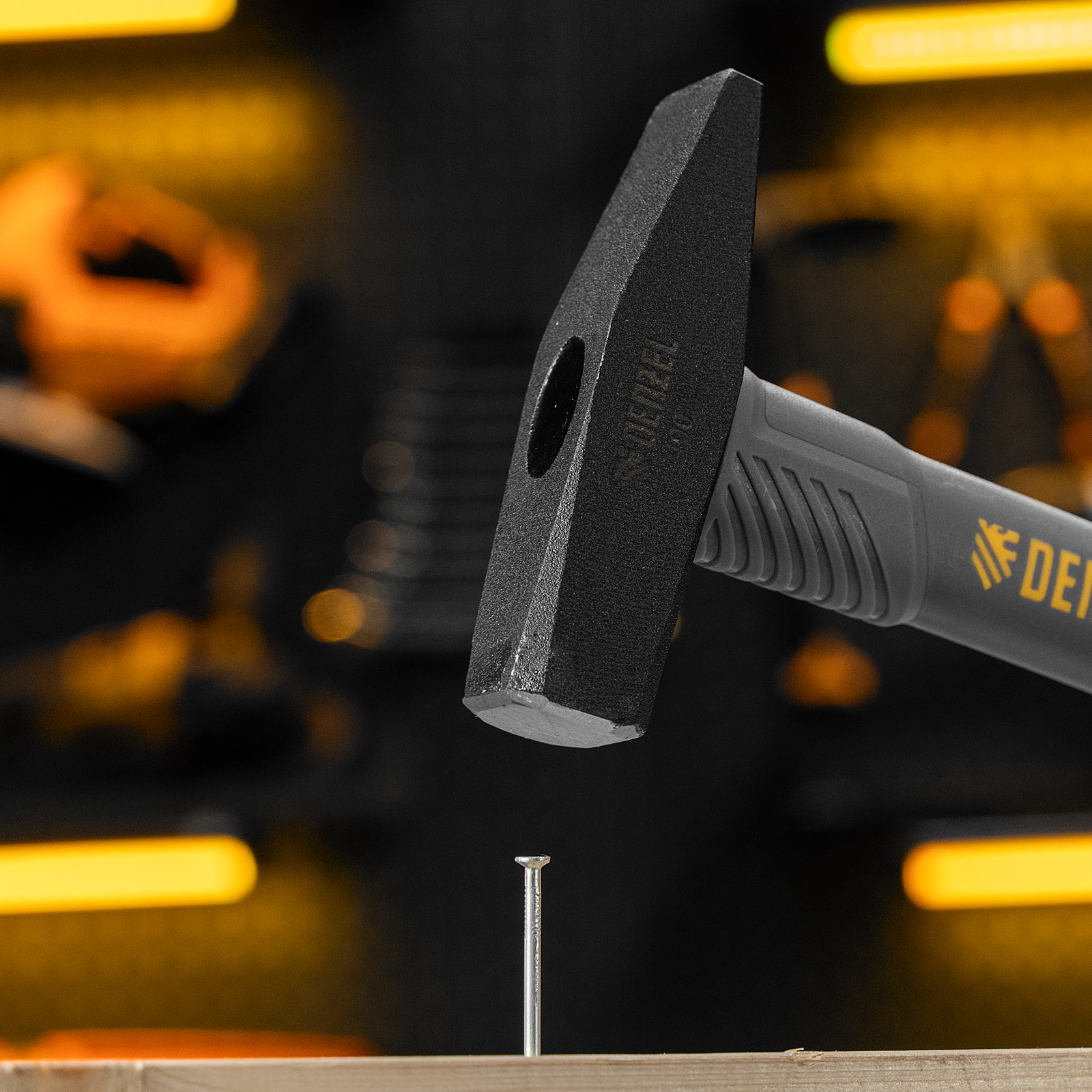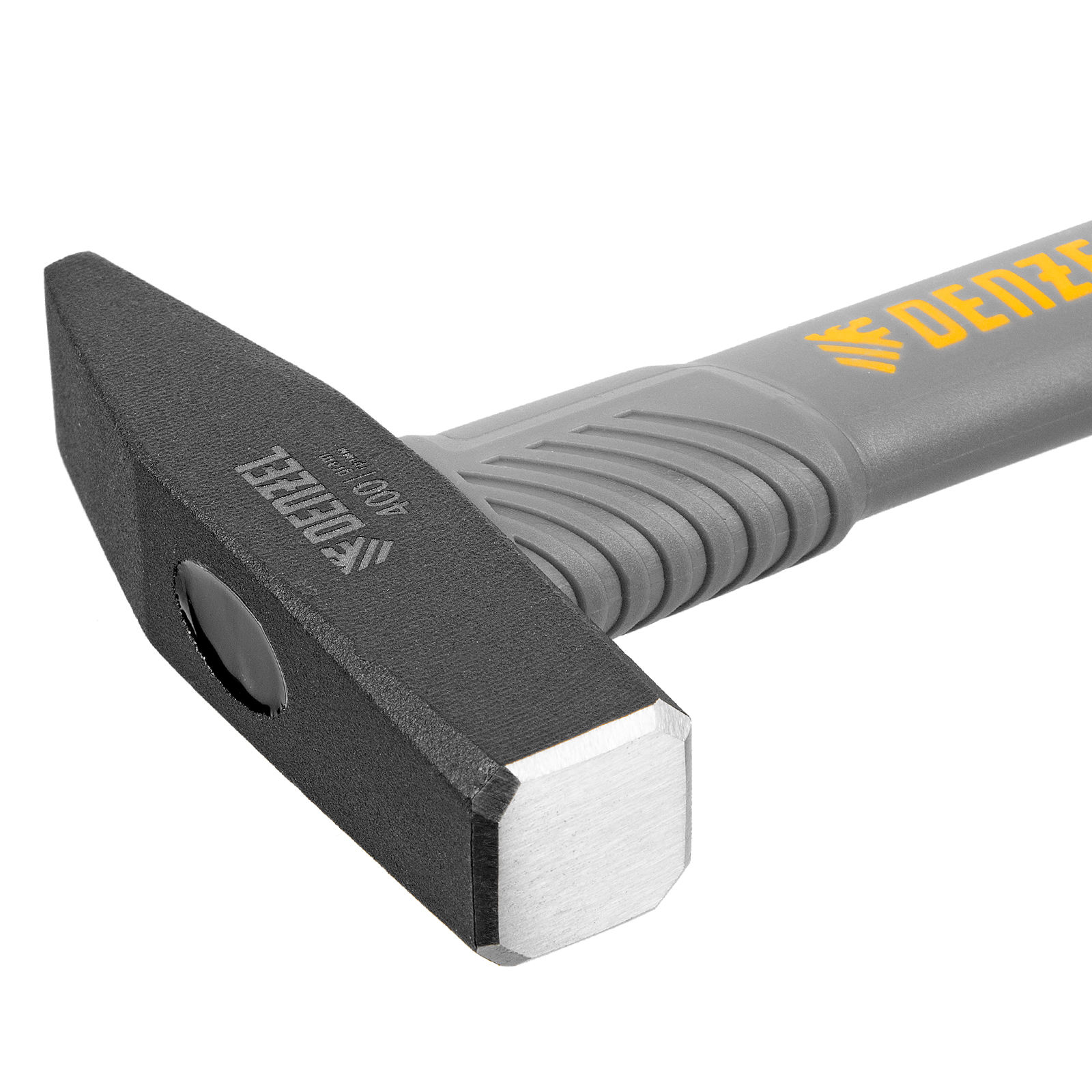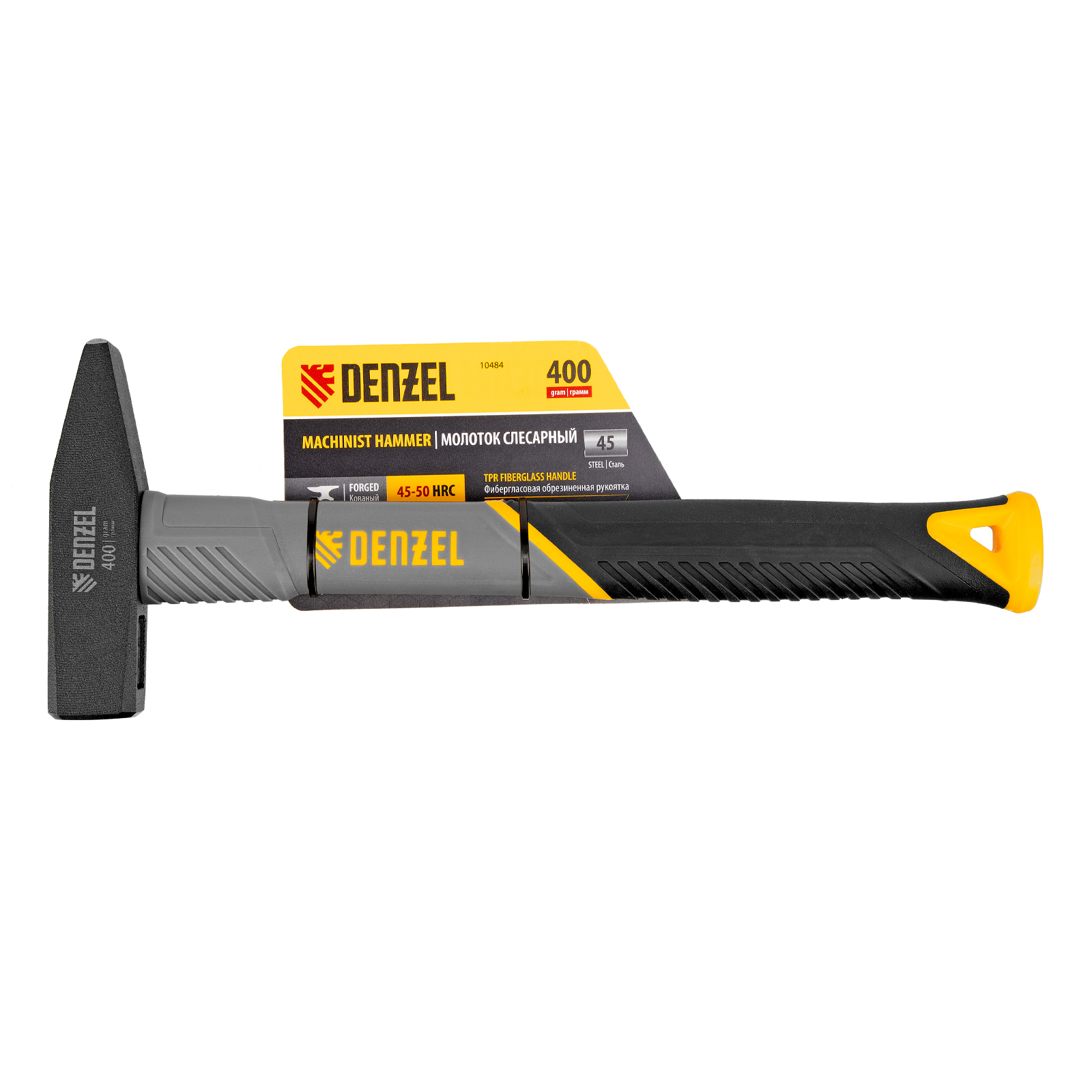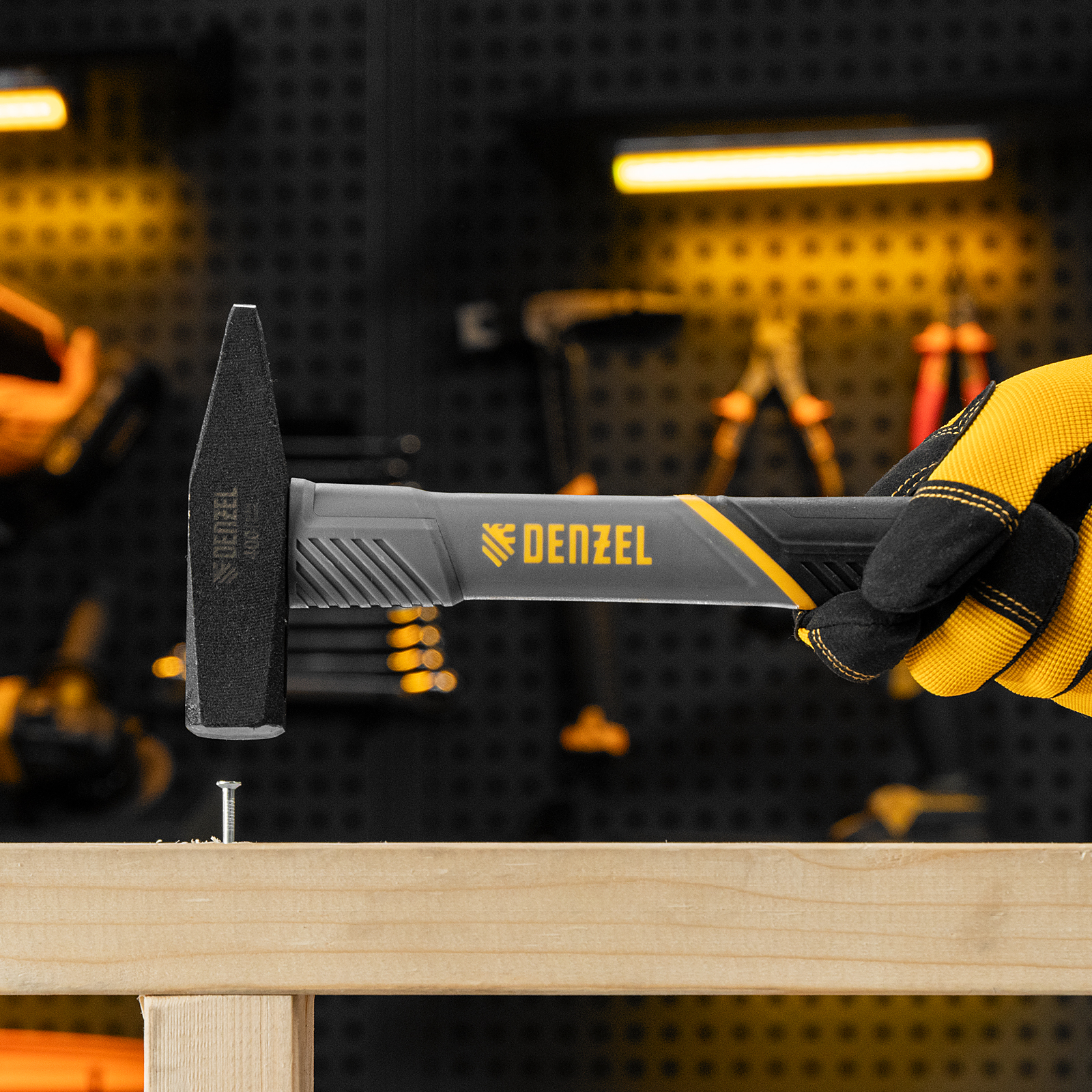 Молоток слесарный кованый Denzel 10484 с квадратным бойком весом 400 г и трехкомпонентной фибергласовой рукояткой с TPR-покрытием предназначен для работы с металлическими заготовками, забивания гвоздей, штырей, дюбелей и другого крепежа. Рукоятка выполнена в эксклюзивном дизайне. Молоток рекомендован для профессионального и домашнего применения.