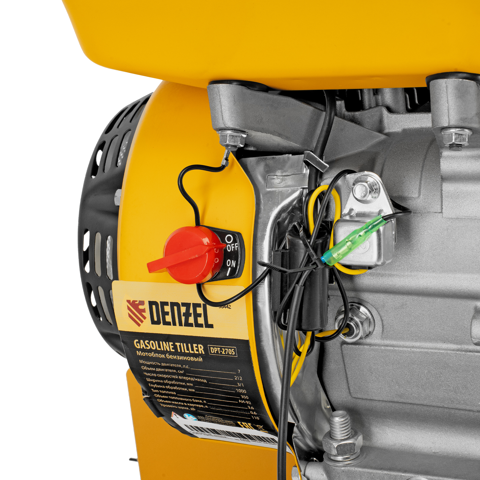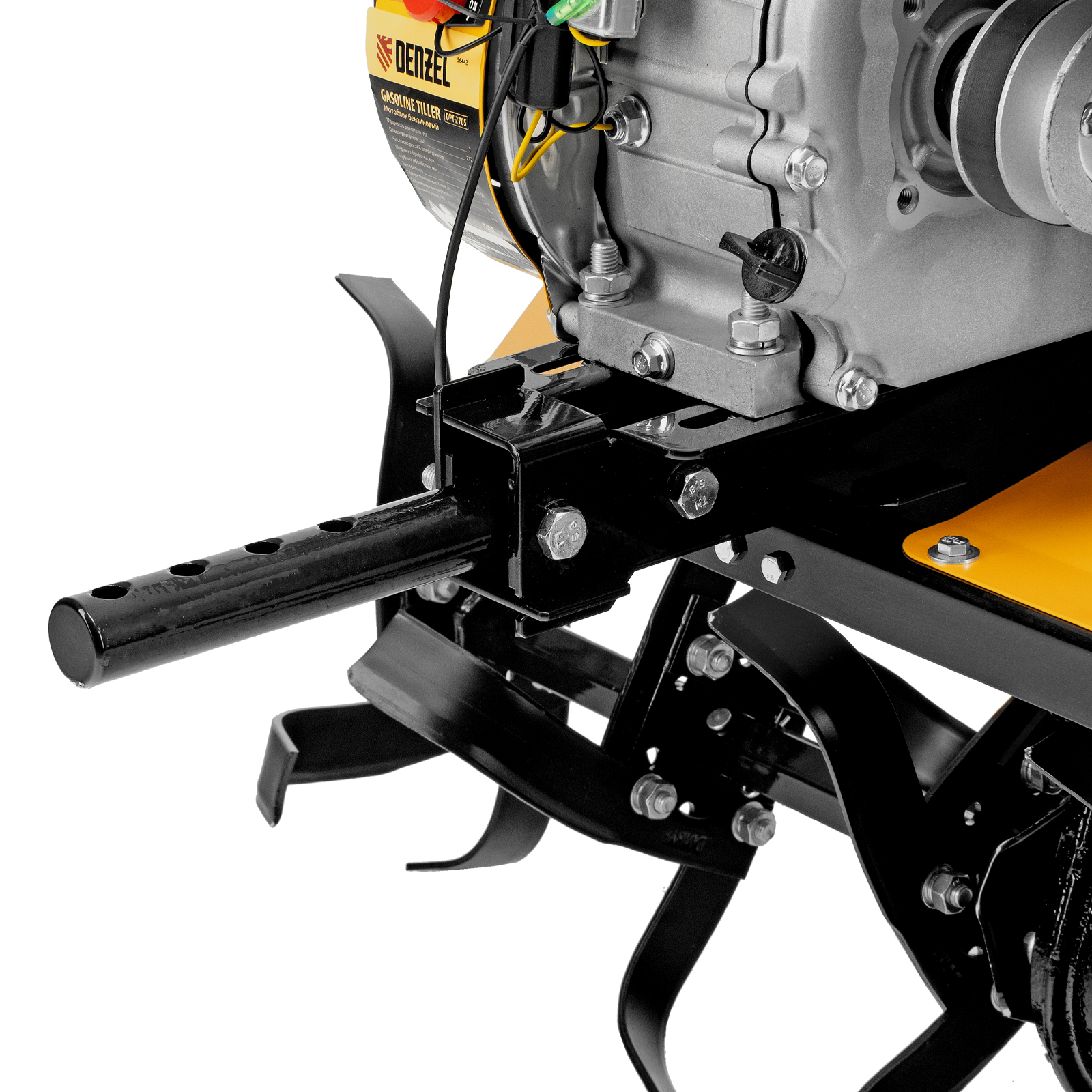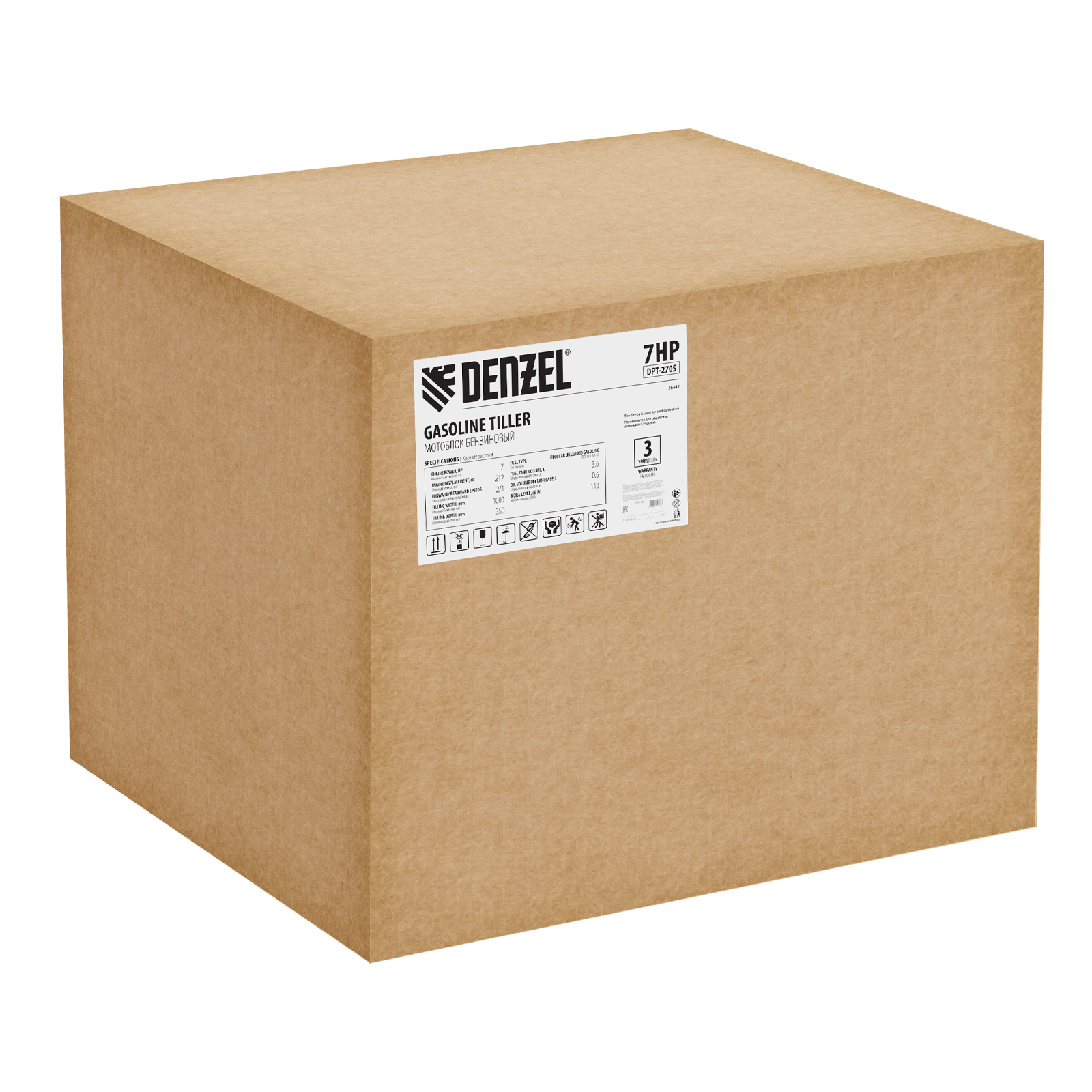 Мотоблок Denzel DPT-270S 56442 с двигателем объемом 212 см3 и мощностью 7 л. с., ременным механизмом сцепления, фрезами 3 х 4, шкивом отбора мощности (ШОМ) и коробкой передач 2В/1Н предназначен для проведения сельскохозяйственных работ. Максимальная ширина обработки составляет 1000 мм. Фрезы собираются из двух двойных и двух одинарных секций, что позволяет регулировать ширину вспашки. ,Шкив отбора мощности и универсальный кронштейн диаметром 30 мм позволяют установить различное навесное оборудование: плуг, окучник, картофелевыкапыватель, а также грунтозацепы и удлинители осей. Совместимые артикулы: Denzel 59901, 59902, 59903, 59904, 59905, 59906, 59907, 59908. Такое решение значительно расширяет возможности мотоблока и позволяет минимизировать расходы на закупку сельскохозяйственной техники.