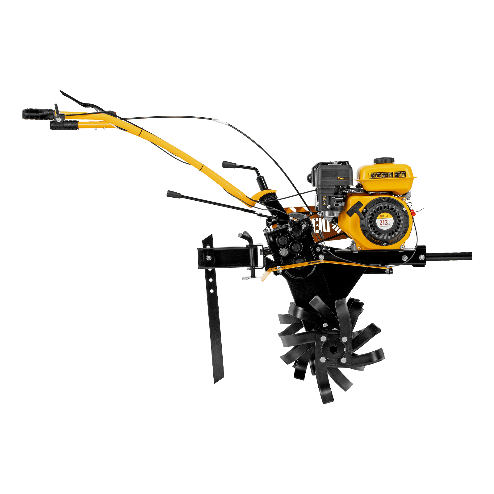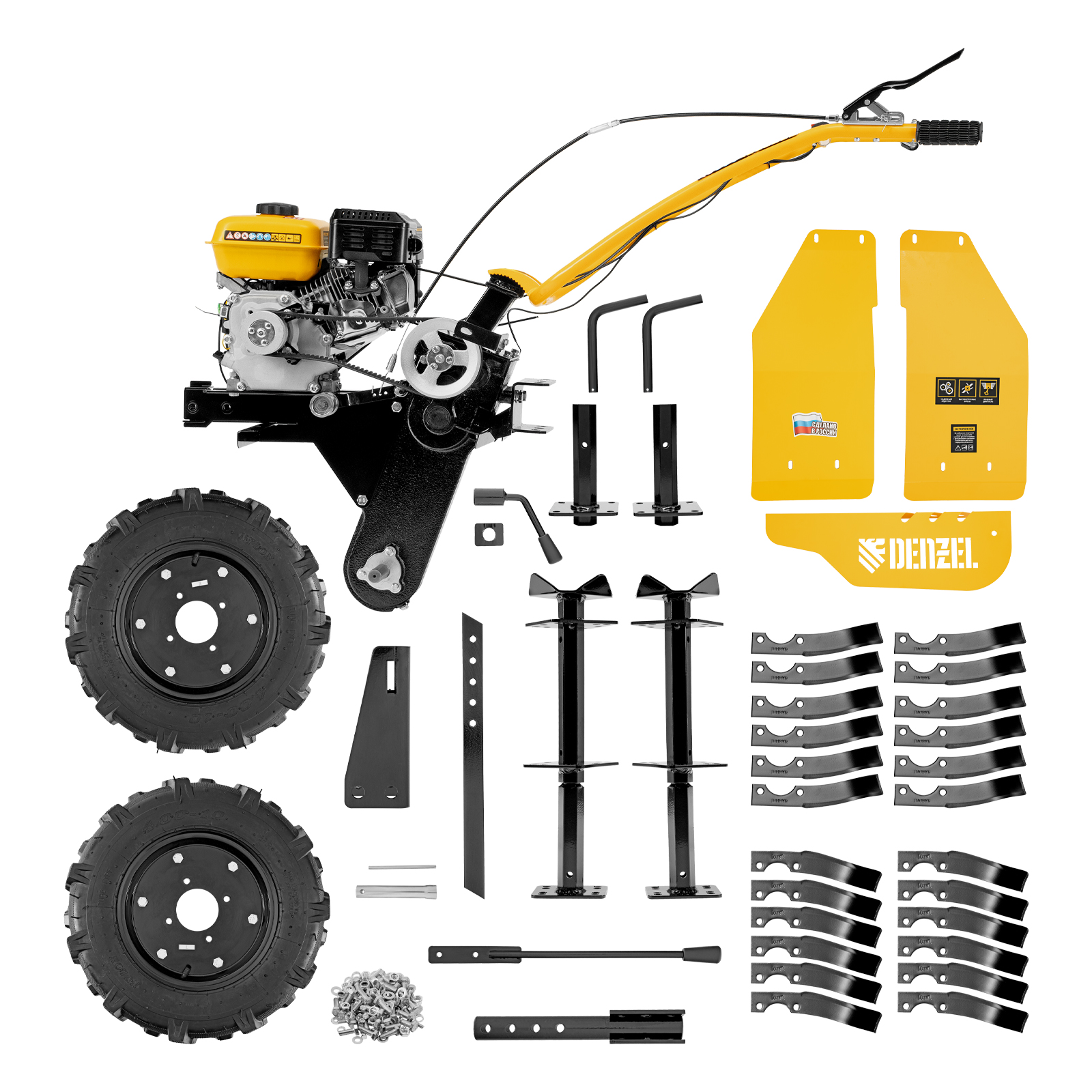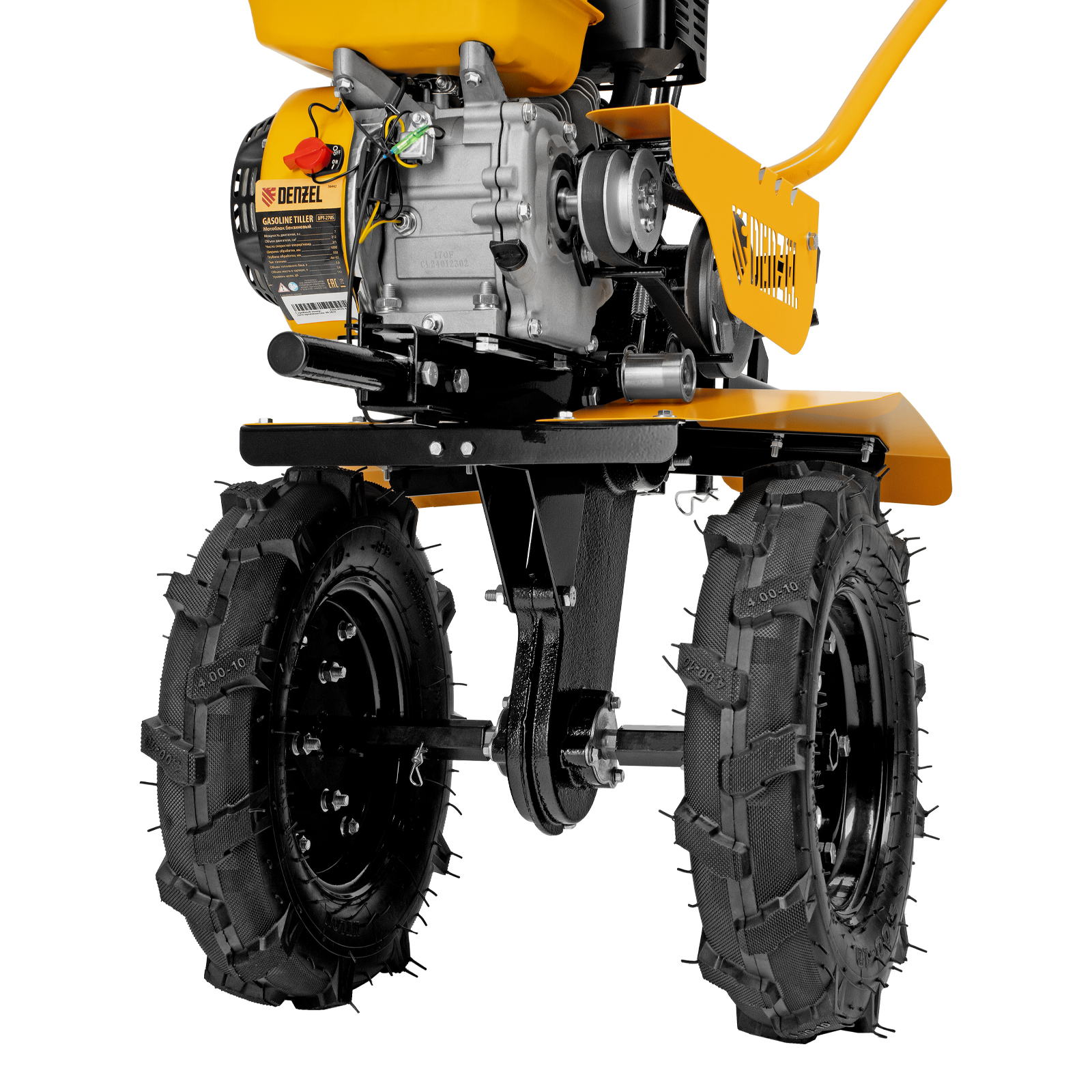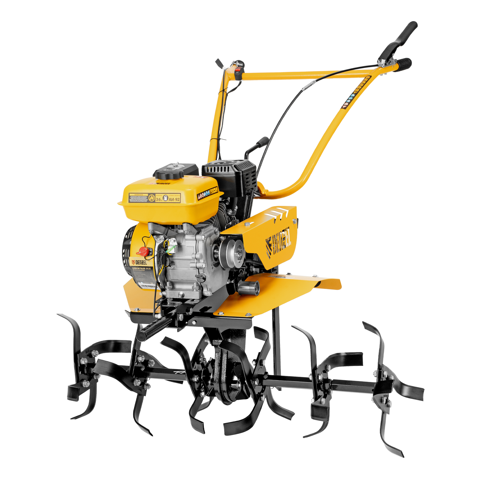 Мотоблок Denzel DPT-270S 56442 с двигателем объемом 212 см3 и мощностью 7 л. с., ременным механизмом сцепления, фрезами 3 х 4, шкивом отбора мощности (ШОМ) и коробкой передач 2В/1Н предназначен для проведения сельскохозяйственных работ. Максимальная ширина обработки составляет 1000 мм. Фрезы собираются из двух двойных и двух одинарных секций, что позволяет регулировать ширину вспашки. ,Шкив отбора мощности и универсальный кронштейн диаметром 30 мм позволяют установить различное навесное оборудование: плуг, окучник, картофелевыкапыватель, а также грунтозацепы и удлинители осей. Совместимые артикулы: Denzel 59901, 59902, 59903, 59904, 59905, 59906, 59907, 59908. Такое решение значительно расширяет возможности мотоблока и позволяет минимизировать расходы на закупку сельскохозяйственной техники.