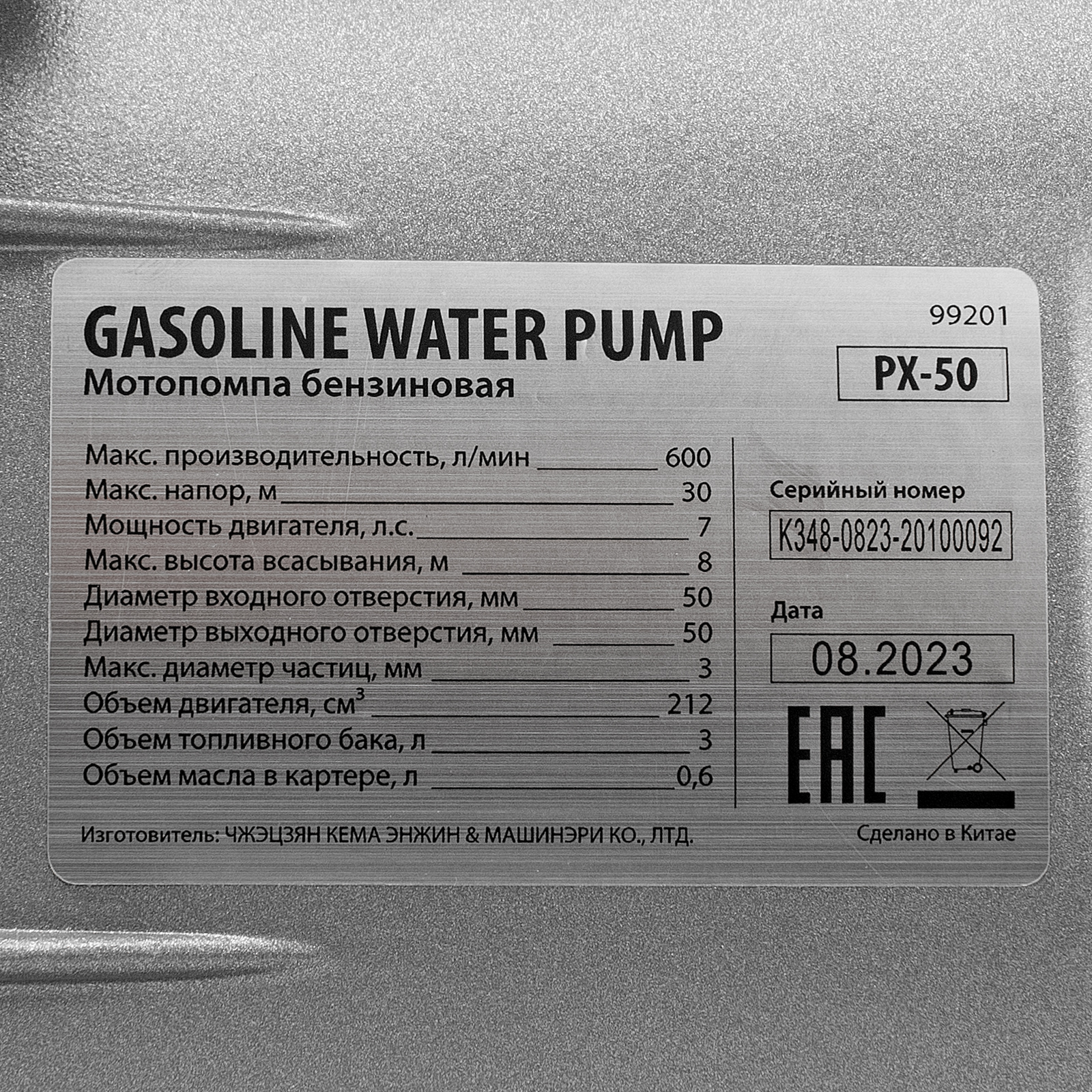 Бензиновая мотопомпа для чистой воды Denzel PX-50 99201 производительностью 600 л/мин, с двигателем мощностью 7 л. с. и штуцерами диаметром 2 дюйма, обеспечивает напор до 30 м и глубину всасывания до 8 м. Применяется для откачивания воды из бассейнов, водоемов, затопленных подвалов и складских помещений. Подходит для подачи воды на участок или в систему полива, может использоваться для проведения коммунальных, промышленных и строительных работ. Объем бака составляет 3 л, а расход топлива — 1,8 л/ч, поэтому мотопомпа способна проработать более чем 1,5 ч на полной мощности без дозаправки.