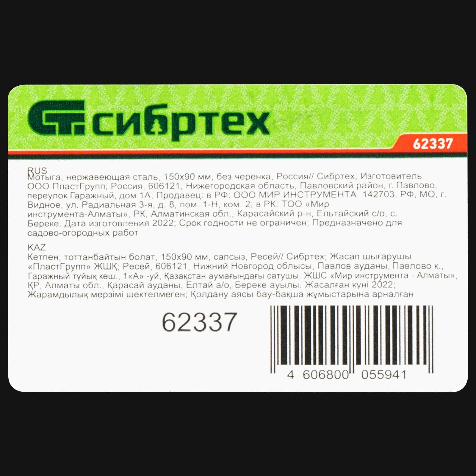 <p>Мотыга Сибртех 62337 из нержавеющей стали, размером 150 х 90 мм, без черенка, — ручной инструмент для садово-огородных работ. Позволяет рыхлить почву, удалять сорняки, окучивать растения. Мотыга рассчитана на длительную эксплуатацию, поскольку ее полотно изготовлено из прочной «нержавейки», не подверженной коррозии. Черенок диаметром 30 мм приобретается отдельно. Инструмент будет полезен для ухода за посадками на дачном участке. </p><h2>Преимущества</h2><ul><li>Эффективность — острая режущая кромка облегчает рыхление почвы и срезание корней сорных растений.</li><li>Долговечность — покрытие порошковой эмалью защищает державку и тулейку от ржавчины.</li><li>Прочная конструкция — полотно надежно соединено с державкой с помощью заклепок.</li></ul>