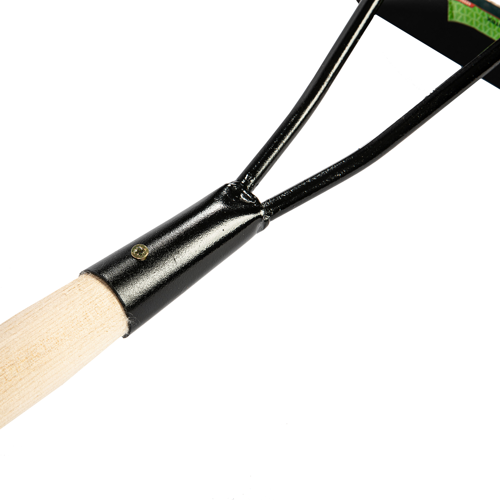 - Износостойкость — рабочая часть изготовлена из среднеуглеродистой стали, а черенок — из древесины твердых пород.